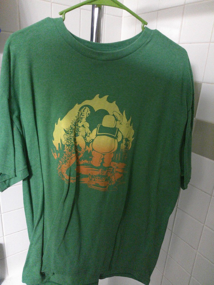 Size XL, 50% cotton, 50% polyester graphic T-shirt. Graphic depicts Godzilla and the Stay-Puft Marshmallow Man walking hand in hand through a burning city. Good condition.