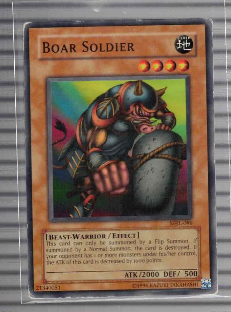 Own the rare 1996 1st Edition Boar Soldier Effect card from the popular Yu-Gi-Oh! TCG. This earth-colored card features the Beast-Warrior monster type, has 500 defense/toughness, and a powerful 2000 attack/power. The card is made of high-quality card stock with a regular finish and bears the card number 21340051. This vintage card is a must-have for avid collectors and fans of the Yu-Gi-Oh! TCG. It was manufactured by Konami in Japan and is in excellent condition. Don't miss your chance to add this rare card to your collection. Please check back often. Cards will be updated daily. Thanks for looking. ITEM WILL BE SENT EBAY SHIPPING EBAY SHIPPING DETAILS ARE SHIPPED IN REGULAR LETTER ENVELOPE WITH TRACKING # ( CARD WILL BE PROTECTED WITH A TOP LOADER) Larger orders will be shipped in a bubble mailer with tracking #.