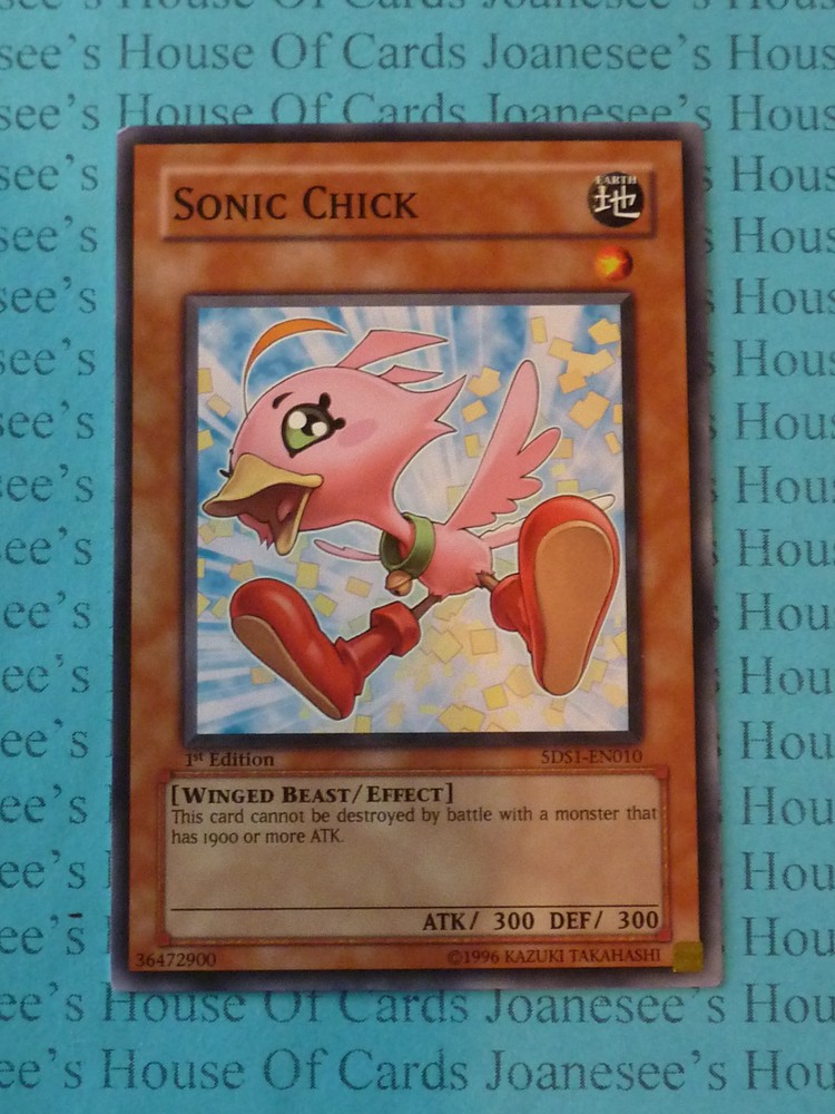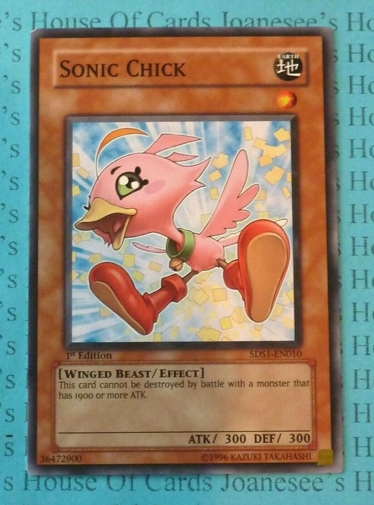 This is a Common Earth Winged Beast Sonic Chick 1 Stars ATK/300 DEF/300 Card text: Cannot be destroyed by battle with a monster that has 1900 or more ATK. 5DS1 -EN010 1st Edition English Mint/NMint Condition Totally Original Konami (or your money back!) I will deliver in safe packaging to keep it in perfect condition. Ideal for players and collectors alike. Check out my other items! I will combine postage costs for multiple purchases. Sign up for my email newsletters by adding my eBay Shop to your favourites