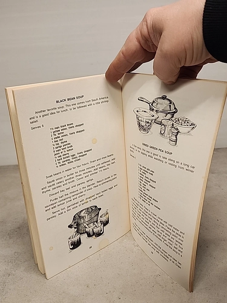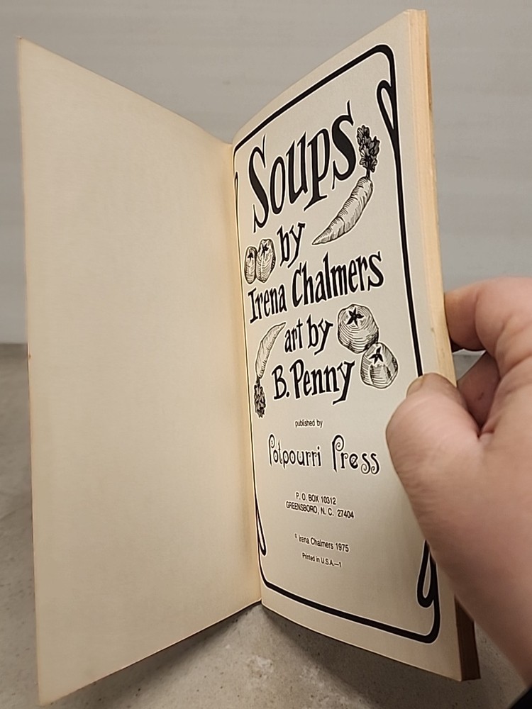 Soups by Irena Chalmers, Drawings / Bob Penny Cookbook Potpourri Press 1975 Bx10. Condition is Good. Shipped with USPS Media Mail. ------------------------------------------------- Welcome to our shop, founded in 2018 with a passion for uncovering exceptional treasures just for you. Our collection is sourced from diverse estates to unearth the finest and most unique items, ensuring each discovery is a gem waiting to be found. Our aim is to provide you with as much information as possible in our listings. Please understand that we are unable to provide further details beyond what is presented in photos and description. Purchasing Conditions By buying an item, you agree to adhere to the Rules and policies for buyers and acknowledge the following: · You are responsible for thoroughly reviewing all item photos and descriptions prior to placing a bid or making a purchase commitment. The item(s) shown in the photos will be the exact ones you receive; details in the specifics section may not always be updated. Exceptions may apply to items listed with multiple quantities, which could exhibit slight variations. · Measurements when available will be shown in item photos. · All items are sold in as-shown condition. Items may NOT be inspected for damage. Any noticeable damage will be depicted in the item photos and/or top of description. · While we endeavor to test as many electronics and items as possible, our listing process is constrained by time limitations. Additionally, we do not always have the expertise or tools needed to test all items to their full extent. We appreciate your understanding that not all items can be individually tested. · You enter a legally binding contract to purchase an item when you commit to buy an item or if you have the winning bid. · Our shop offers a NO-return or refund policy, should an item be returned, it must be returned in the same condition in which it was received, and it must include all original packaging, all components. Shipping Terms · Orders are typically shipped within 1-4 business days following purchase during regular business hours. · Please note that oversized items quoted for UPS or FedEx delivery cannot be shipped to P.O. Boxes. We quote oversized items a flat rate shipping. Oversized items only: if the shipping amount ends up being $15+ the quoted amount, the item will need to be canceled. We apologize for any inconvenient this causes. We try our best to quote accurately but sometimes that will happen. · USPS Priority Mail is available at checkout for faster delivery. Please note that Ground Advantage does not offer guaranteed delivery dates. · Items sold for under $5 may be shipped in a bubble envelope for efficient delivery. For specific categories: · Books priced at $10 or under, toys priced at or under $10, jewelry priced at/under $20, or Fabric/Clothing $20 or under will ship in bubble envelopes. · Combined shipping discounts are available for items priced at $5 or more. Please note that items priced under $5 may not sufficiently cover the costs associated with combining shipments, making refunds impractical in such cases. Any listing Titles labeled ‘Lot’ items do not qualify for combined shipping sold $10 or under. These items are already packaged. LOTS cannot be separated, they are all sold together. * We do not guarantee that combined shipping will be less expensive than purchasing items individually. It may not always result in savings* · For combined shipments, you may request a total in the cart section of eBay, or proceed to check out and a refund will be sent upon shipment if the shipping cost is lower than initially quoted. This only applies for 2 or more items purchased. · All shipping is quoted accurately; I cannot do any lower for shipping or offer free shipping. If you have a problem with shipping being so high, please make a difference by contacting shipping carriers. · If USPS delivers an item that is marked with damage issues, lost contents, or arrives with a broken item, you are responsible for contacting them to file a claim on this item · If an item(s) arrives damaged, a return request must be initiated to receive a refund. The item must be returned in the exact condition it was received. No exceptions will be made. Our shop cannot be held responsible for the shipper’s errors. This includes lost packages, typos in shipping addresses or any other issues of that nature by the shipper are out of control. If any losses occur, and compensation to you the customer must wait Ebay resolves the situation. NO EXCEPTIONS. Also, should any item received be damaged/broken, the buyer agrees to save all packing materials from shipment pending review by the shipping company. Payment Terms · Payments are due within 4-Days from conclusion of the auction or invoice received date. Failure to submit payment within this timeframe will result in automatic forfeiture of the item. Shop Terms · We kindly ask for your understanding that, as a business, we do not accept lower offers on our listed prices. · We ensure that our shipping costs are accurately quoted based on the most economical and reliable methods available. It's important to note that shipping itself can be expensive, and packing an item with the utmost care incurs costs as well. As such, we do not have alternative, cheaper shipping options to offer. We sincerely appreciate your understanding and adherence to our policies, which are designed to ensure a transparent and smooth shopping experience for all our valued customers. We look forward to the opportunity to provide you with your next favorite item soon. Thank you for your continued support!