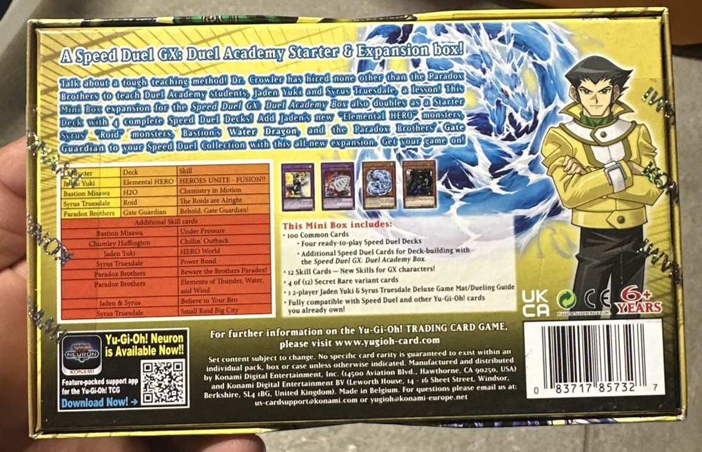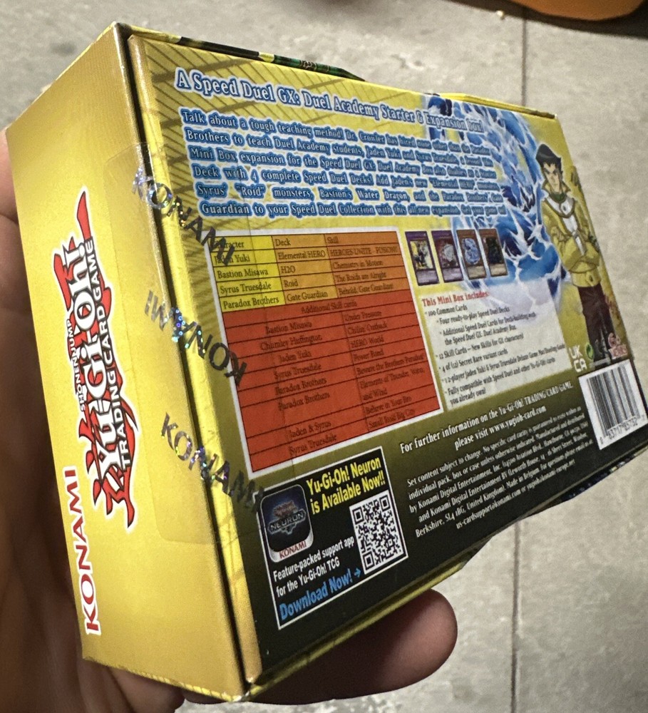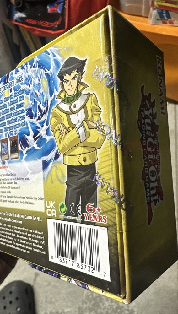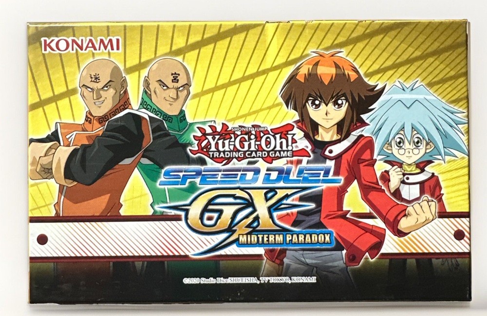 This is a sealed booster box of the Speed Duel GX: Midterm Paradox set, manufactured by Konami. It contains one box of cards that can be used to play the Yu-Gi-Oh! Trading Card Game. The box features a variety of cards that can be used to enhance a player's deck, including new versions of classic cards and new cards that were not included in previous sets. The box is made of paper and is suitable for players aged 6 and up.