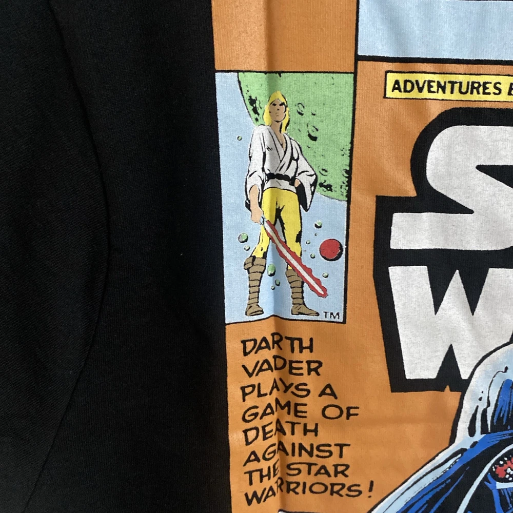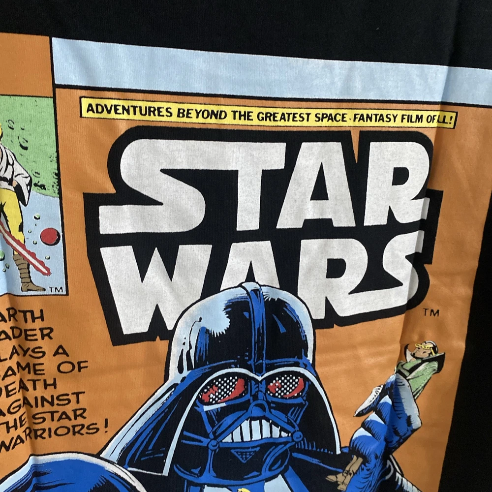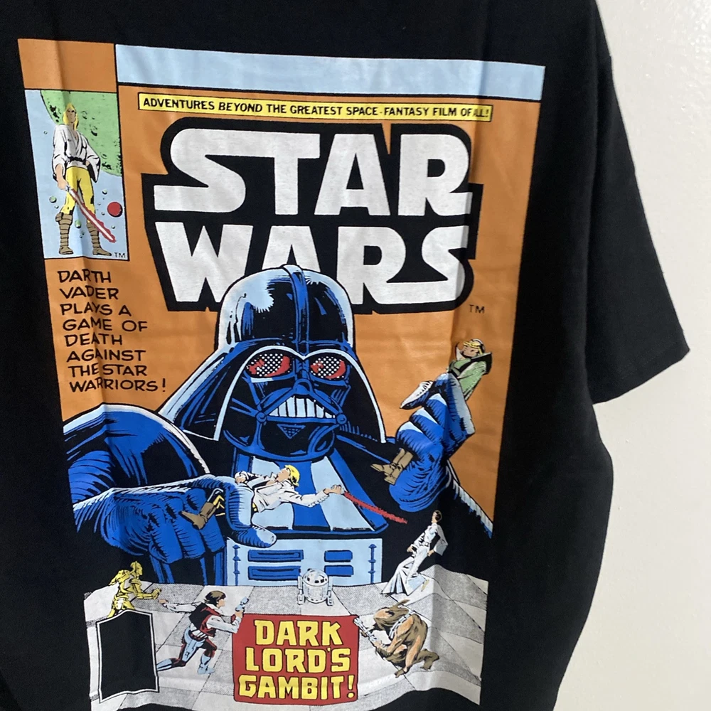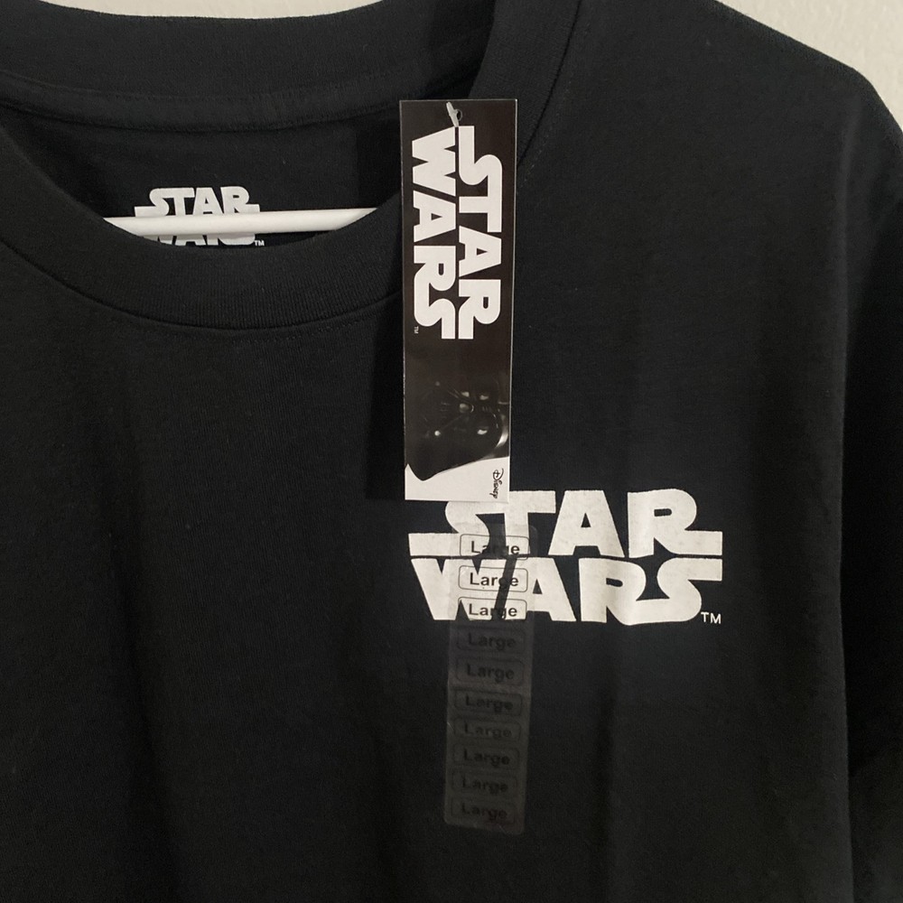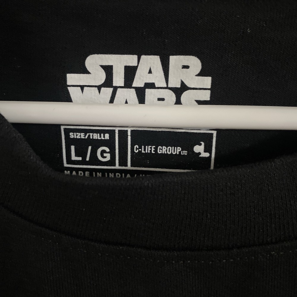 This Star Wars T-shirt is a size L men's basic tee featuring characters like Darth Vader and Luke Skywalker. Made of polyester and cotton knit fabric, it has a crew neck and short sleeves with a graphic print design. The shirt is black with logos and is vintage themed, manufactured in 2020 in India. It is machine washable and part of the Star Wars product line, perfect for fans of the iconic franchise.
