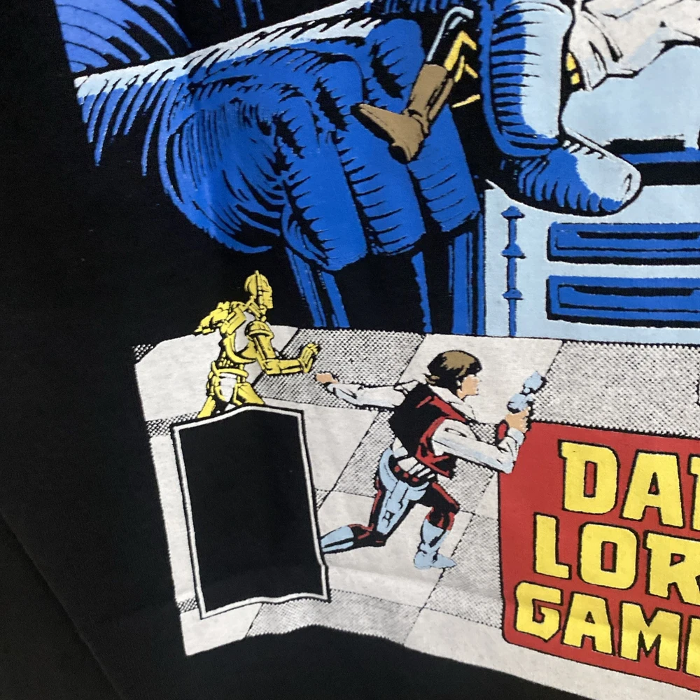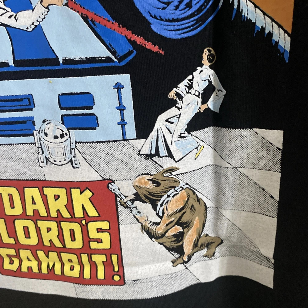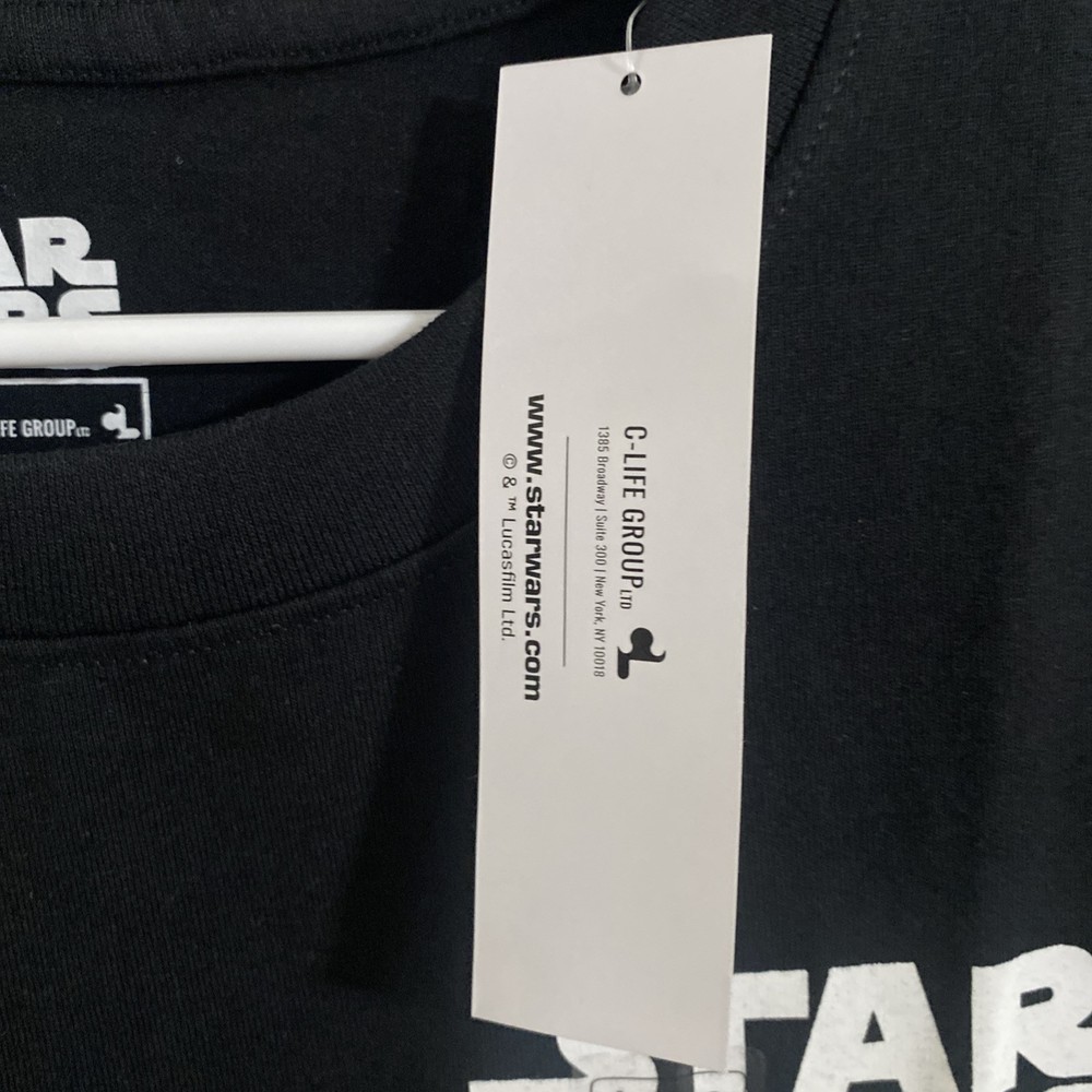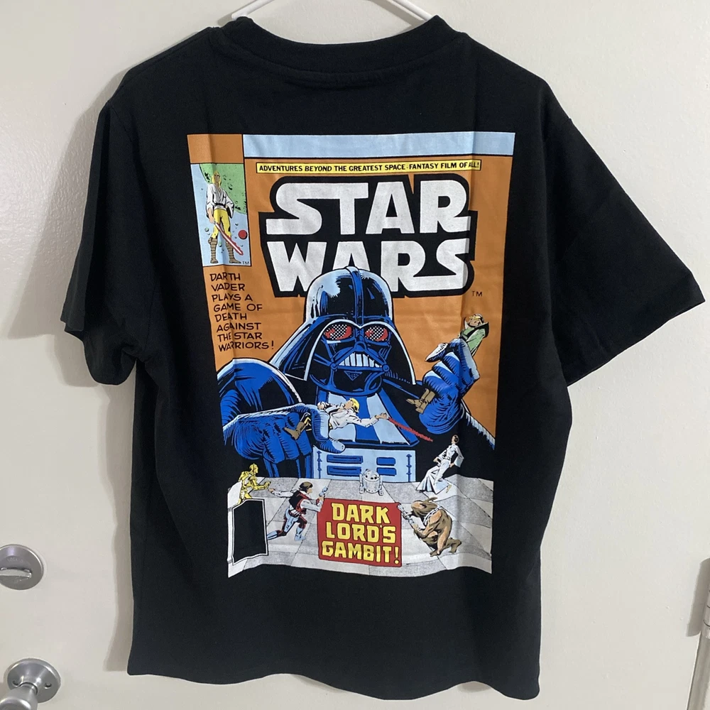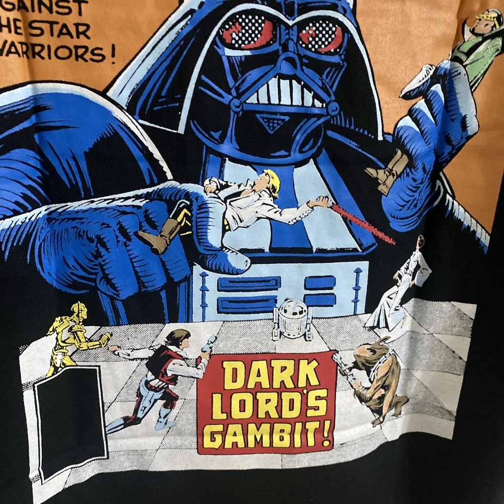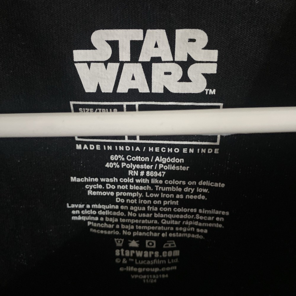 This Star Wars T-shirt is a size L men's basic tee featuring characters like Darth Vader and Luke Skywalker. Made of polyester and cotton knit fabric, it has a crew neck and short sleeves with a graphic print design. The shirt is black with logos and is vintage themed, manufactured in 2020 in India. It is machine washable and part of the Star Wars product line, perfect for fans of the iconic franchise.
