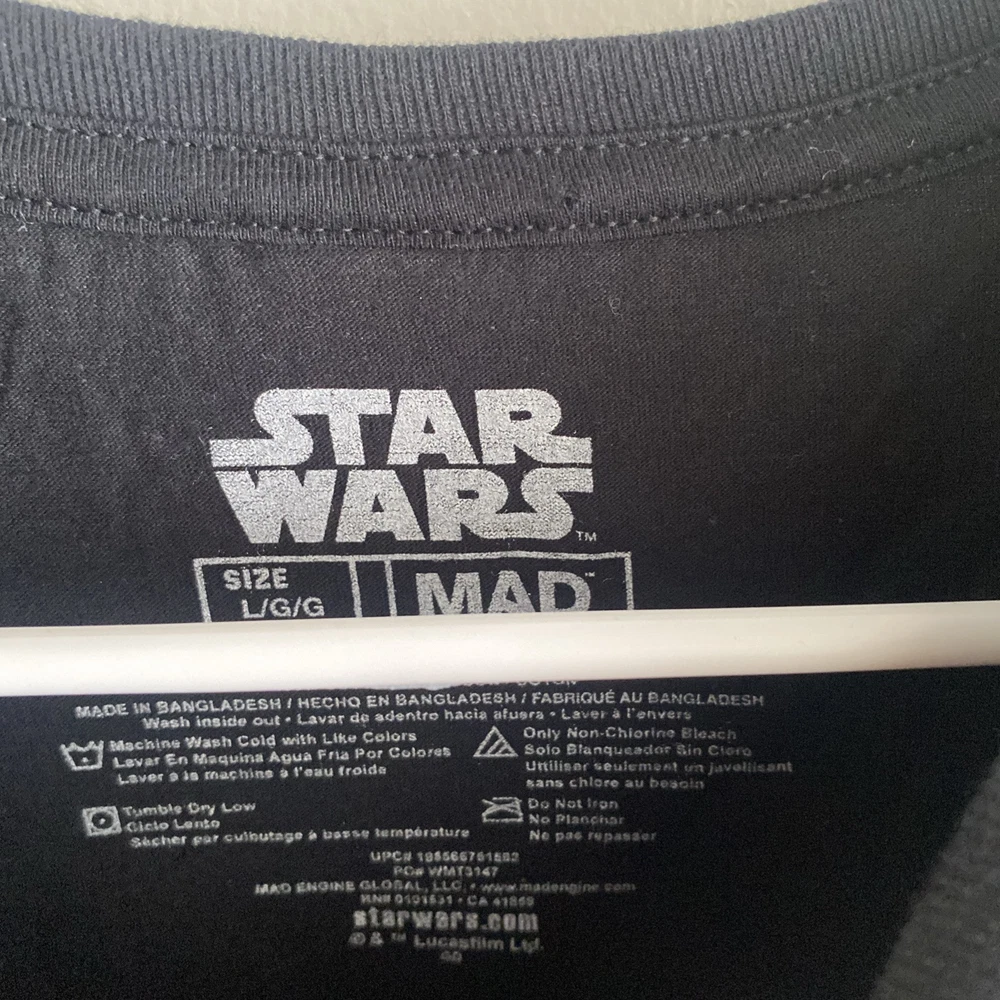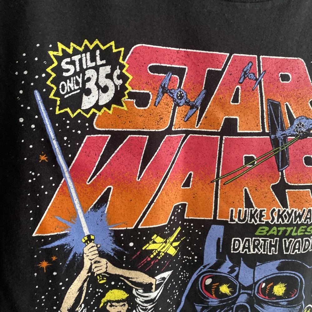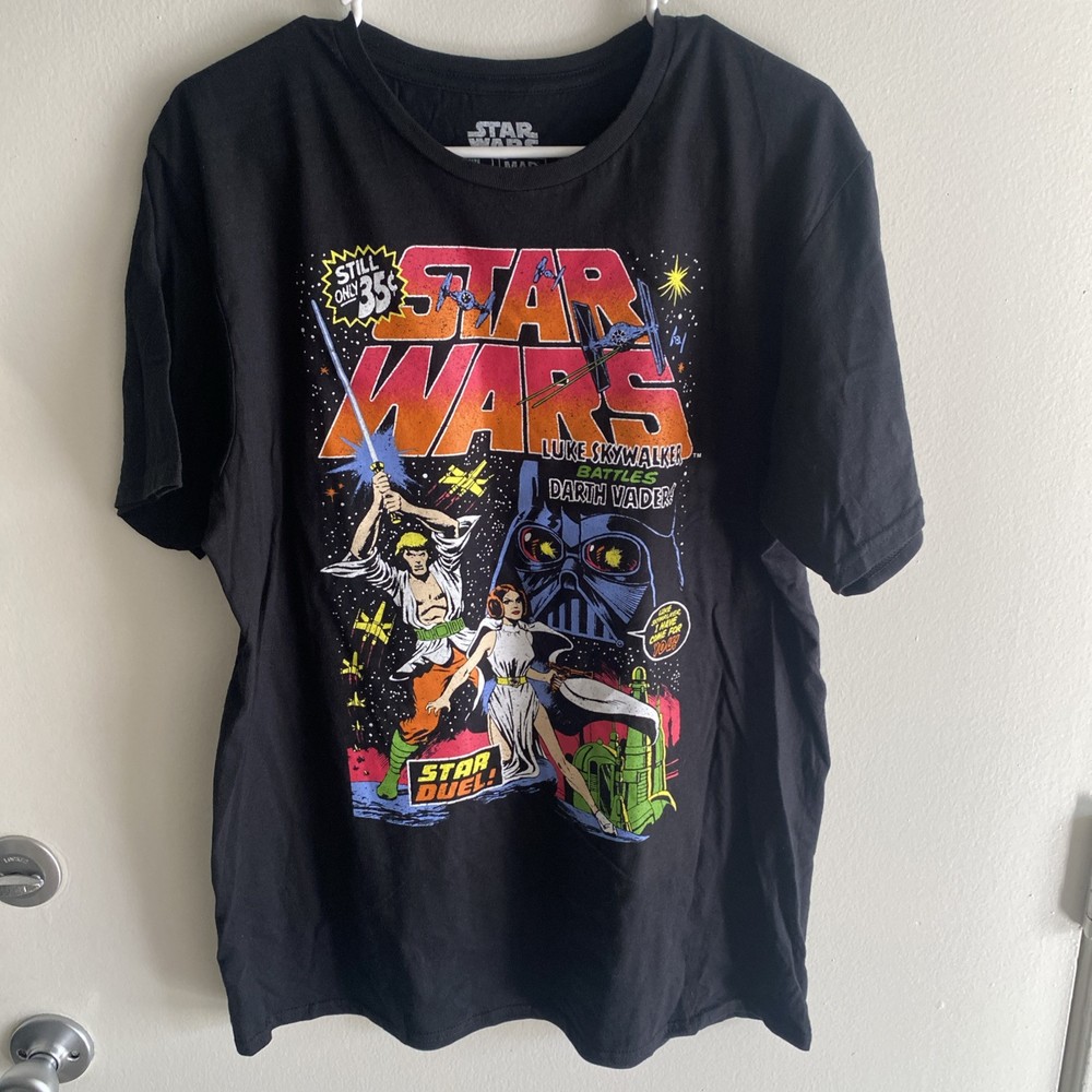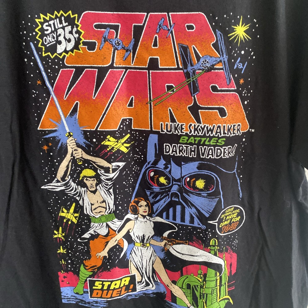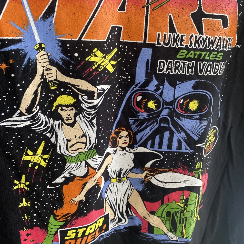 This Star Wars T-Shirt is a size L in black cotton knit fabric. It features a crew neck, short sleeves, and graphic prints of iconic characters like Darth Vader and Luke Skywalker. The shirt is part of Disney's collectible Star Wars line and has a regular fit. It is machine washable and perfect for fans of the Star Wars franchise.