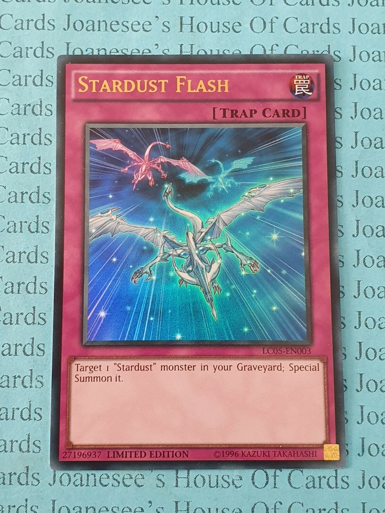 This is an Ultra Rare Holo Trap Stardust Flash Card text: Target 1 "Stardust" monster in your GY; Special Summon it. LC05-EN003 Limited Edition English Mint/NMint Condition Totally Original Konami (or your money back!) I will deliver in safe packaging to keep it in perfect condition. Ideal for players and collectors alike. Check out my other items! I will combine postage costs for multiple purchases. Sign up for my email newsletters by adding my eBay Shop to your favourites