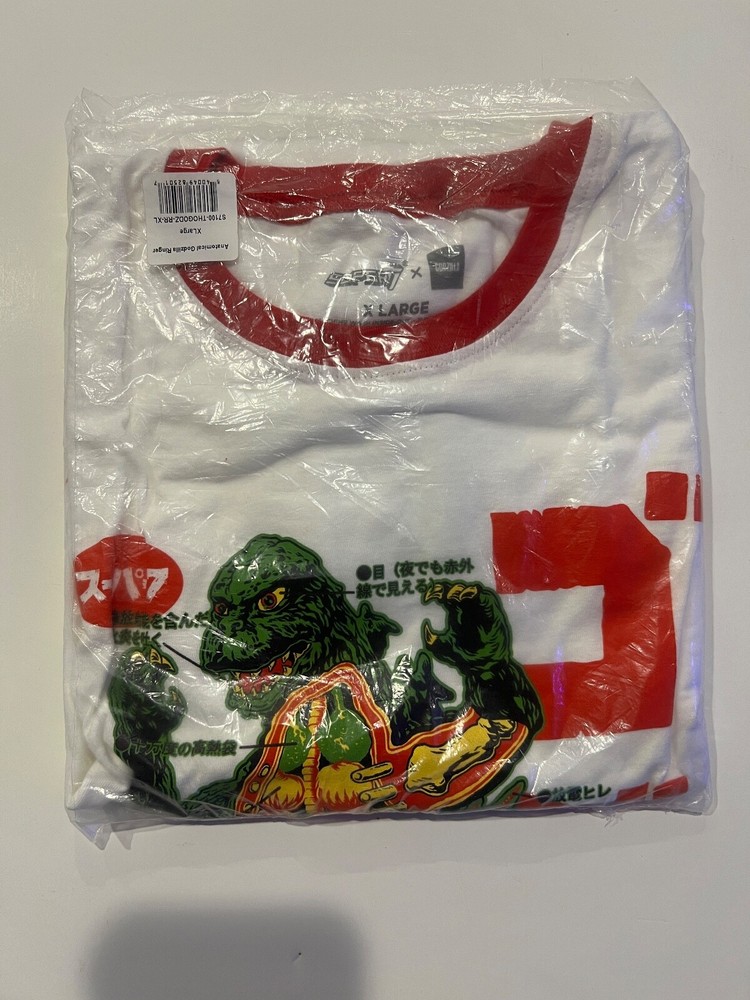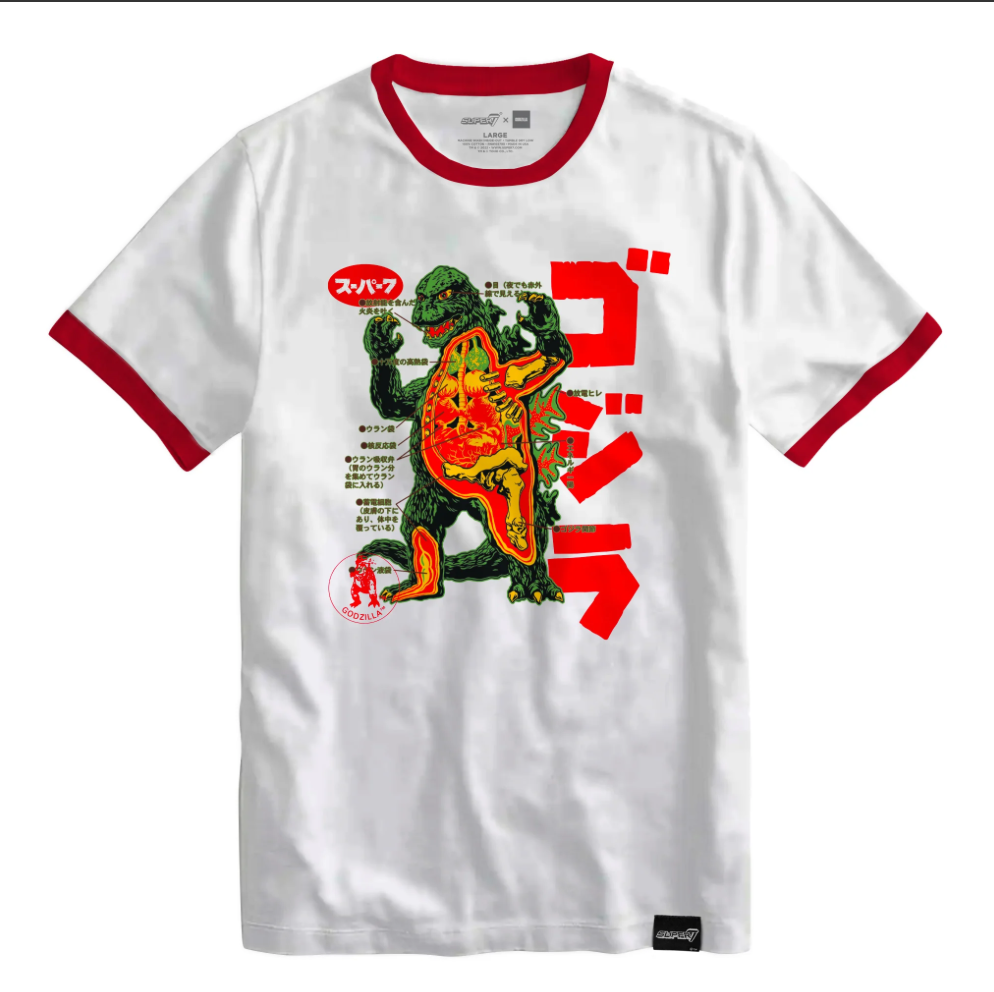 For sale is a brand new, unused Super 7 Toho Anatomical Godzilla Ringer T-Shirt. This has long been discontinued at Super 7. Men’s Size: XL MSRP $35 The King of the Monsters is ready to reign over your T-shirt collection! This 100% cotton Toho Godzilla Anatomical Ringer Tee features an anatomical cutaway diagram of Godzilla with Japanese language notations, inspired by vintage movie posters. On a white shirt with red ringer detail on the collar and sleeves, this machine washable T-shirt is available in sizes S-3X. With the new Toho Godzilla Anatomical T-shirt you’ll be a ringer to win Best Dressed at your favorite Kaiju convention! Details And Specs Weight (lbs) 0.28 lb Size: XL Item for sale is brand new and is pictured. Seller with 100% feedback score of over 1500+ positive feedbacks. Never have had a negative feedback! No international shipping. Will ship through the Global Shipping Program. Shipping and handling time typically takes 1-3 business days from date of purchase.