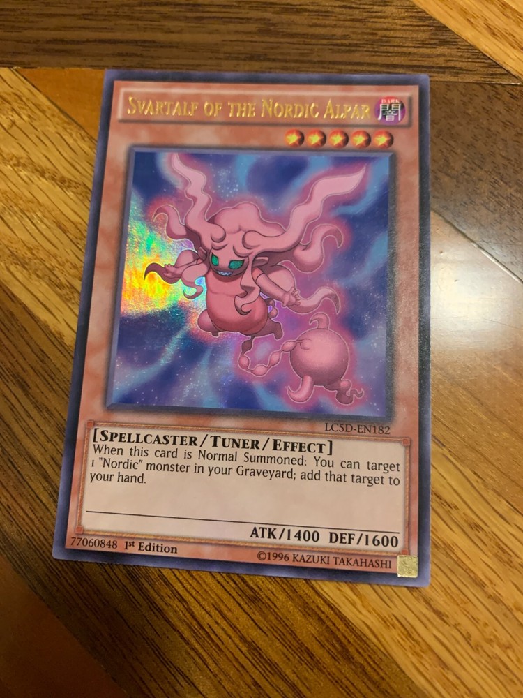 Hello! You are buying one Svartalf of the Nordic Alfar LC5D-EN182 1st Edition Ultra Rare i n very lightly played condition. Reason for very lightly played condition is extremely minor general play/scratchwear on back. See photos for details! As a thank you for buying from me, I will throw in two free Yugioh commons! Thank you so much for looking, have a great day! If there is ever an issue, please let me know so I can do whatever I can to resolve it! Please check out my other items! I have many more single cards!