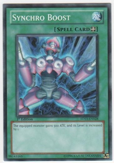 Synchro Boost - 5DS3-EN028 - Common - 1st Edition Image is a stock photo of the card. You will receive the card in Lightly Played condition Condition: Lightly Played ATK/DEF : Attribute : Spell Card Number : 5DS3-EN028 Card Rules : No Rulings Available for this card Card Text : The equipped monster gains 500 ATK, and its Level is increased by 1. Card Type : Equip Spell Edition : 1st Level : Monster Type : Name : Synchro Boost Passcode : 98143165 Rarity : Common Set : Starter Deck: Duelist Tollbox Be sure to visit our store for a wide selection of your favorite cards! We are running specials RIGHT NOW!! Shipping Options: ~Ships in a regular white envelope with a stamp for FREE! (THERE IS NO TRACKING INFORMATION AVAILABLE FOR THE ABOVE METHOD. SHIPPING TIME IS 4-10 BUSINESS DAYS) ~Shipments are handled same or next business day. ~ FREE SHIPPING for each additional card, so shop around our store!
