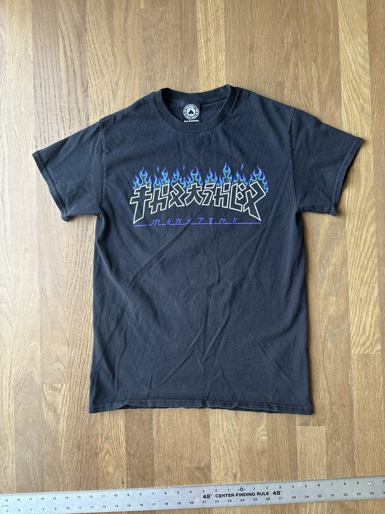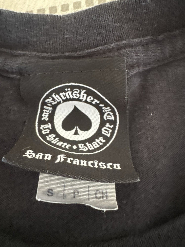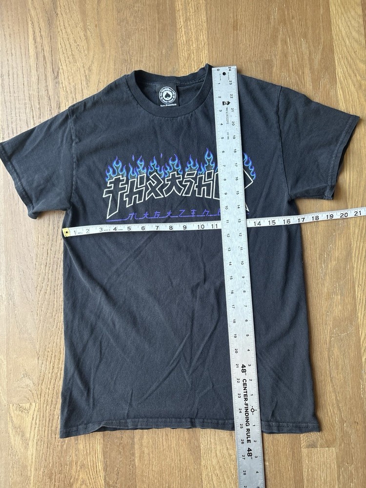 This black Thrasher T-shirt features a stylish design with a charred ss small logo in the front, making it a must-have for any fashion-forward individual. Made from high-quality cotton material, this regular-fit shirt is comfortable and durable, perfect for everyday wear. The shirt is suitable for men of all sizes, with a size type of regular and a size of S. The sleeve length is also regular, making it a versatile addition to any wardrobe. Whether you're going out with friends or running errands, this Thrasher T-shirt is sure to make a statement. H