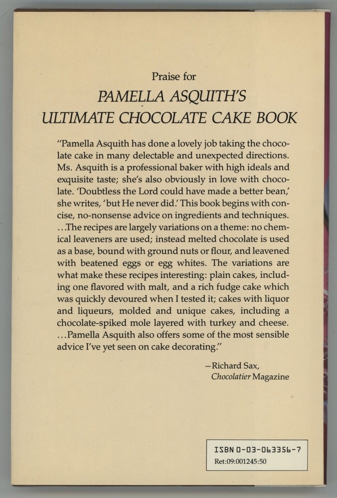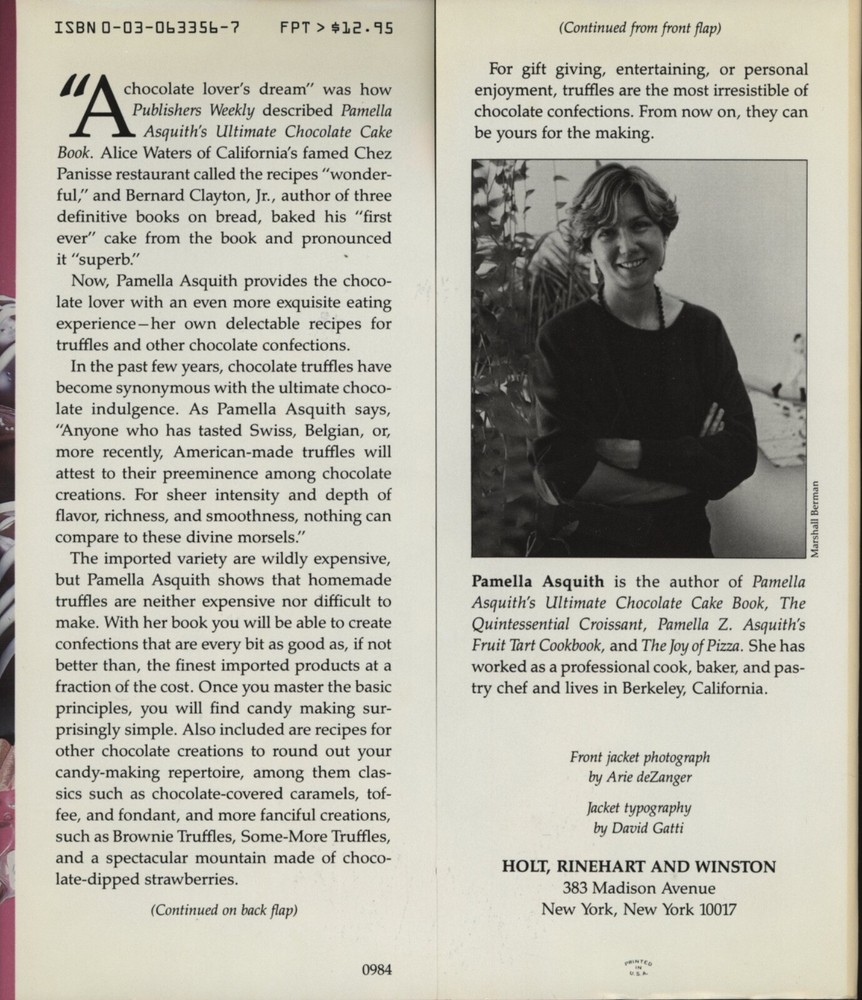 Author: Asquith, Pamela Title: Truffles And Other Chocolate Confections Illustrator: Laura Hartman Publisher: Holt, Rinehart and Winston Place: New York Date: 1984 Pages: viii, 120 ISBN: 0030633567 Binding: Hardcover Dimensions: 5.85 x 8.5 x .6 (.6 lbs) Condition: VERY GOOD very good dj Book Id: MAIN042500I