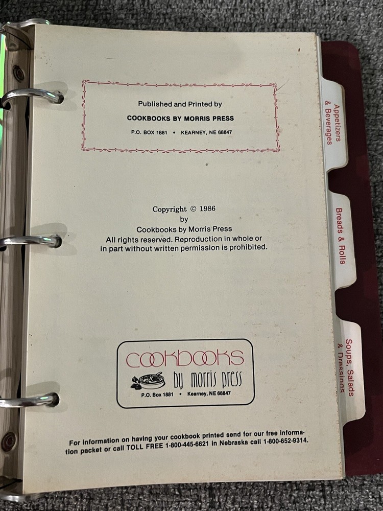 Binder bound cookbook. From Talbot Park Baptist Church in Norfolk, Virginia. Published in 1986. Great condition. Smoke free home. A little yellowing of the pages due to vintage age but otherwise excellent condition.