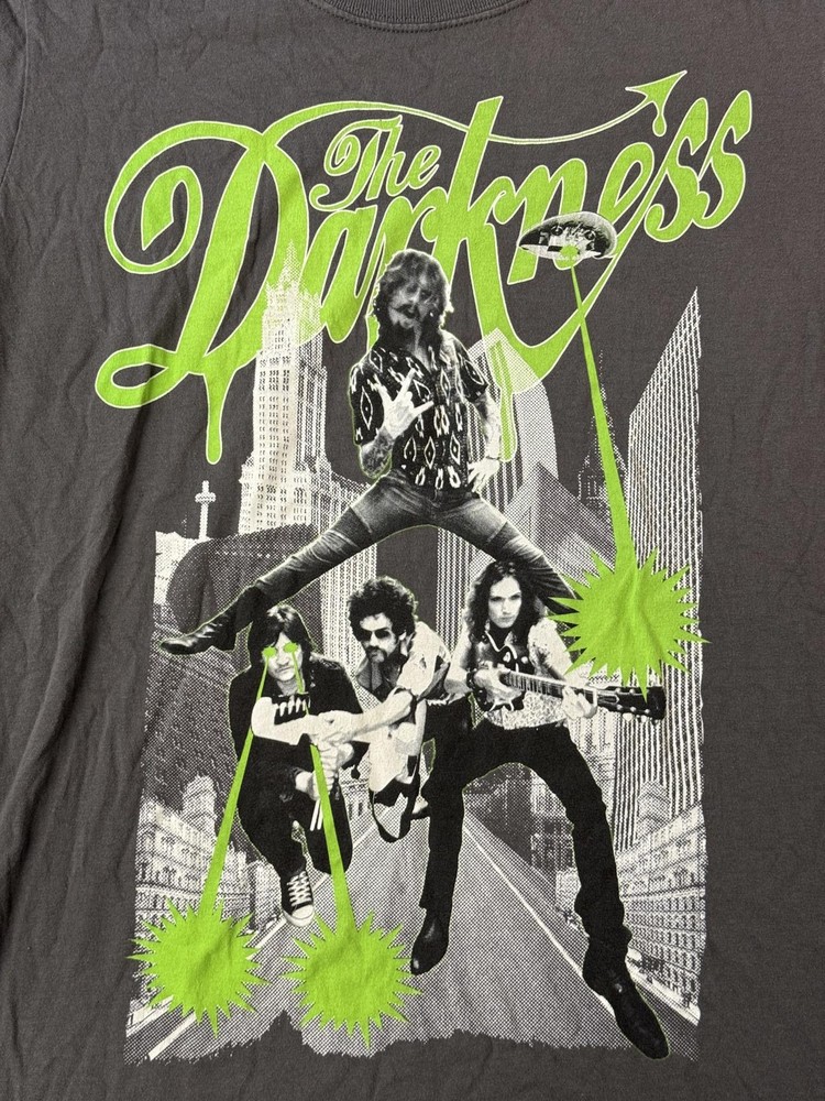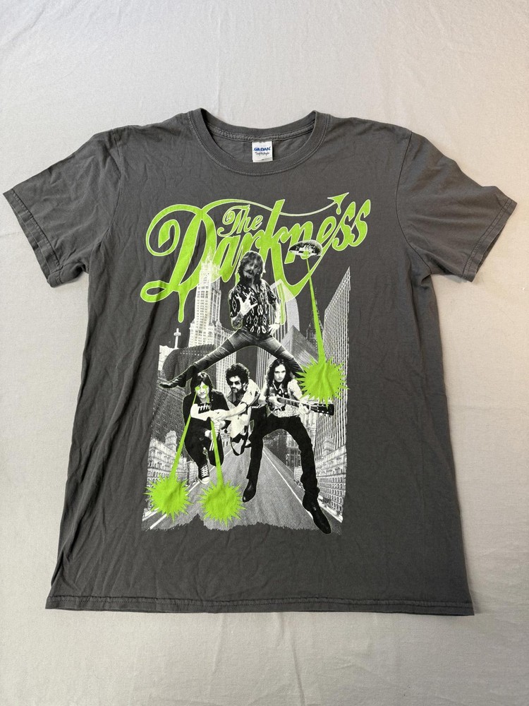 The Darkness Band T-shirt Godzilla City Tee Justin Hawkins Singer SIZE: Medium Brand: Gildan Material: 100% Cotton Condition: Good / Used Sizing: M See photos for measurements Photos of the Length (side of collar) & Width (pit to pit) are in inches If you have any questions, need more pics... let me know :)