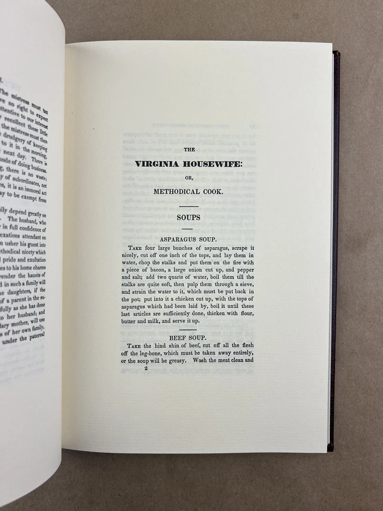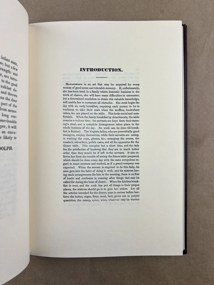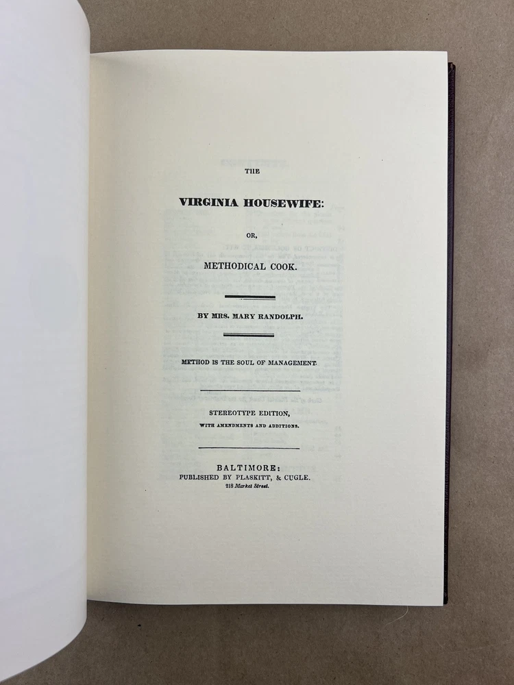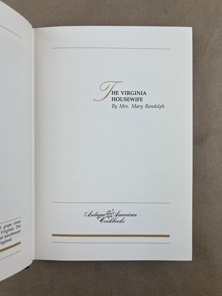 The Virginia Housewife Mrs. Mary Randolph Antique American Cookbooks/Oxmoor, 1984 Facsimile Edition, 1824 Limited Edition 1/4 Leatherbound in Very Good condition. Minimal edge/shelf wear. Book is pre-owned but seemingly seldom read. Tight and square binding, bright cover, and no writing inside. Nice reading copy. Review pictures for condition. Please ask any questions before purchase.