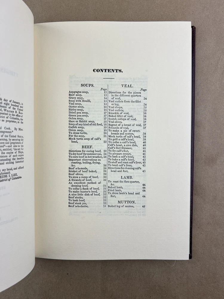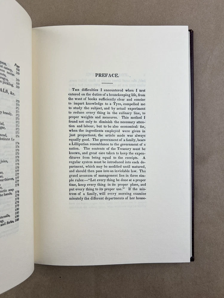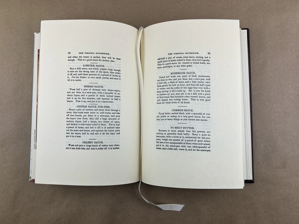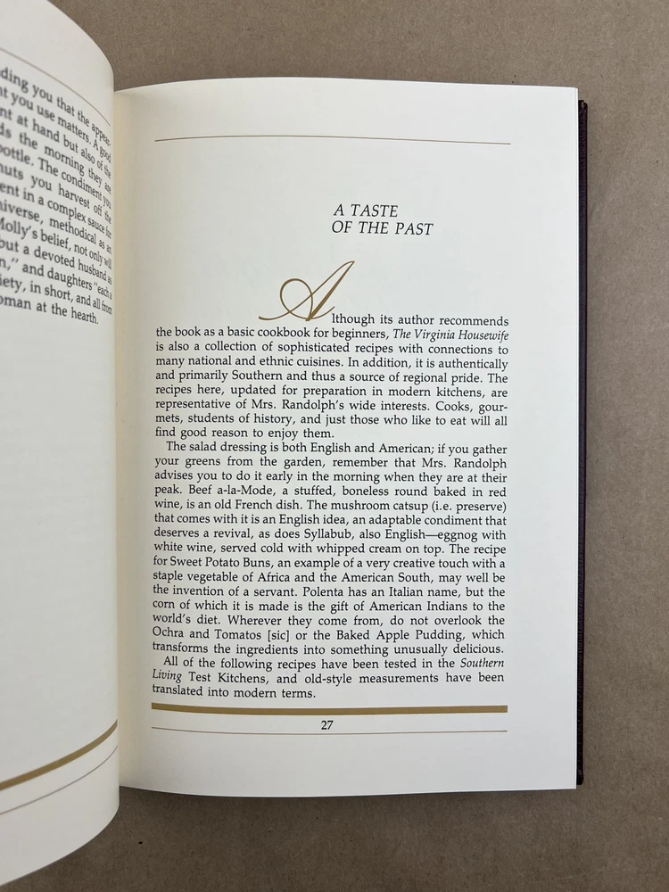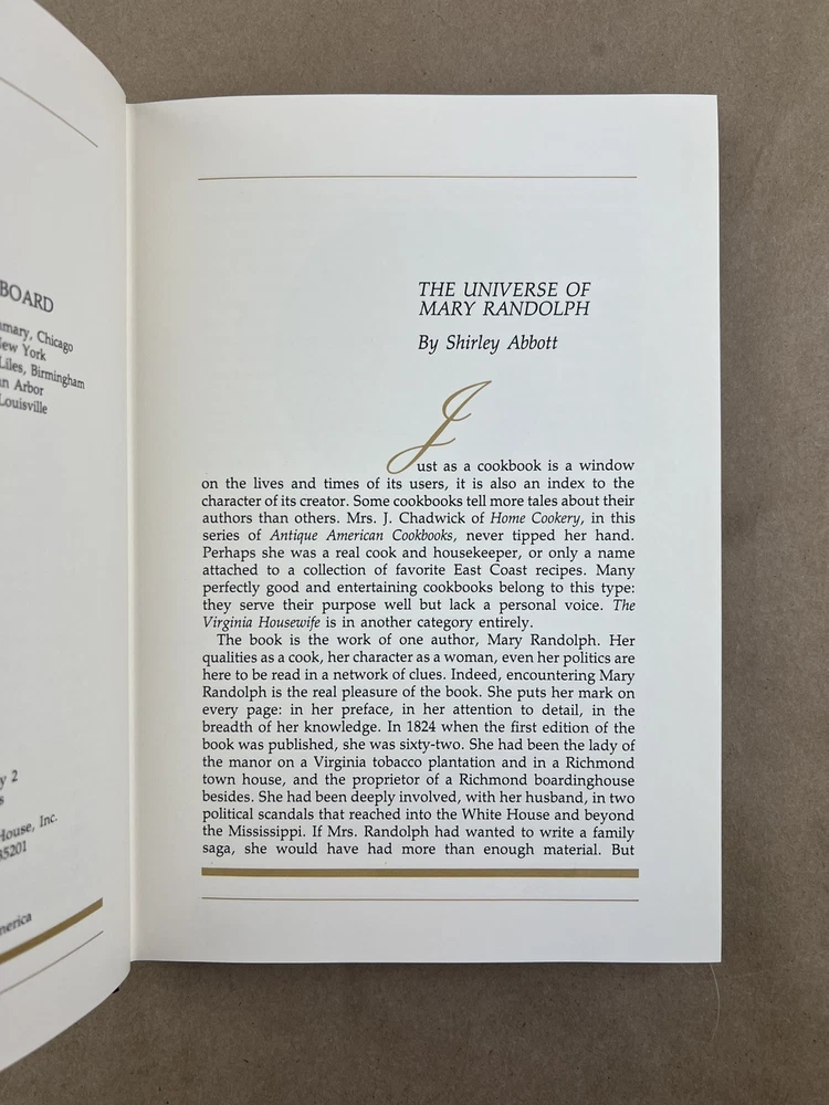 The Virginia Housewife Mrs. Mary Randolph Antique American Cookbooks/Oxmoor, 1984 Facsimile Edition, 1824 Limited Edition 1/4 Leatherbound in Very Good condition. Minimal edge/shelf wear. Book is pre-owned but seemingly seldom read. Tight and square binding, bright cover, and no writing inside. Nice reading copy. Review pictures for condition. Please ask any questions before purchase.