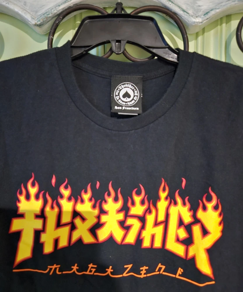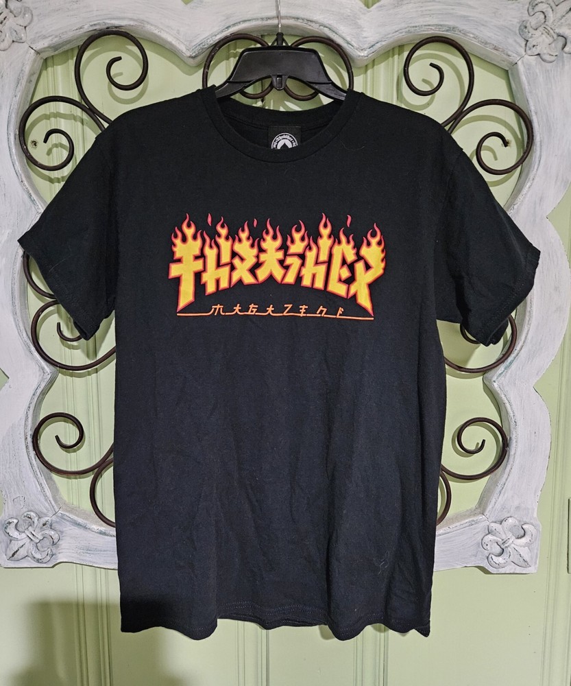 Show off your love for the skateboard culture with this Thrasher Godzilla Flame T-Shirt in size Medium. The iconic Thrasher brand brings you this stylish and comfortable short sleeve tee that features a fierce Godzilla graphic engulfed in flames. The black color and regular fit make it perfect for any casual occasion. This t-shirt is a must-have for any Thrasher fan or anyone who loves unique and eye-catching designs. It is made of high-quality materials that ensure durability and comfort. Get your hands on this limited edition tee today and add a touch of edgy style to your wardrobe.