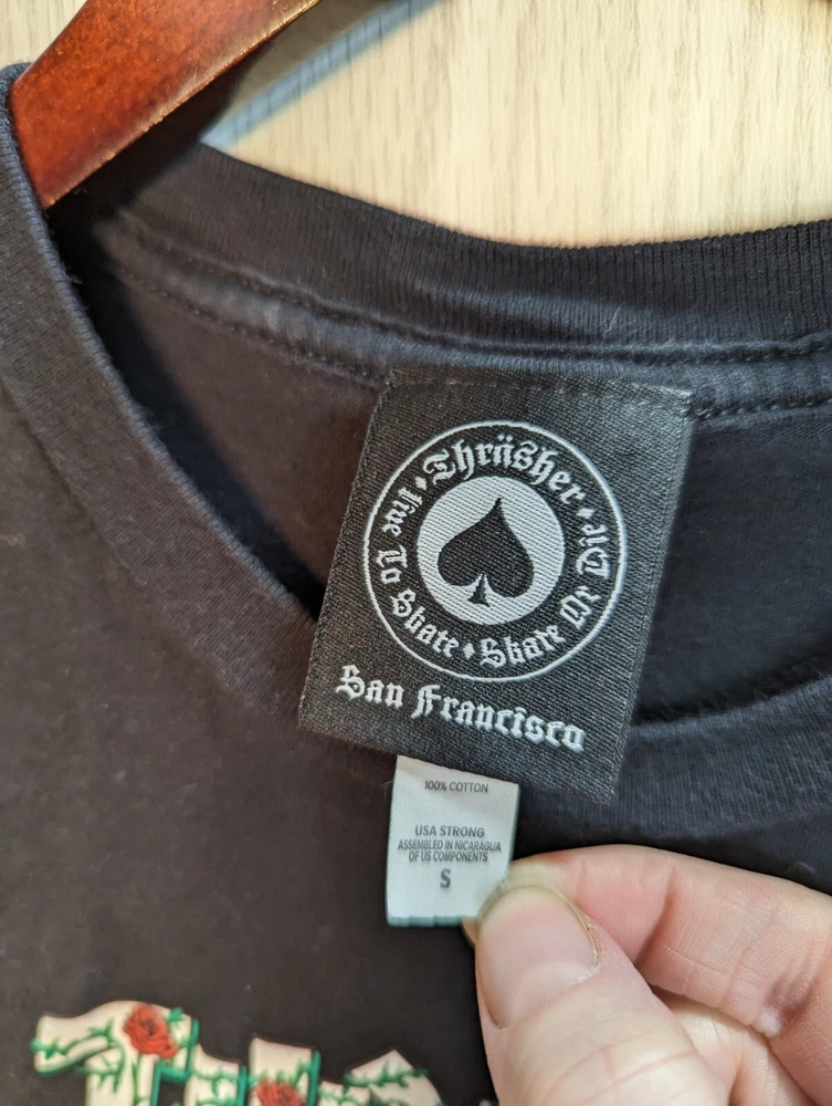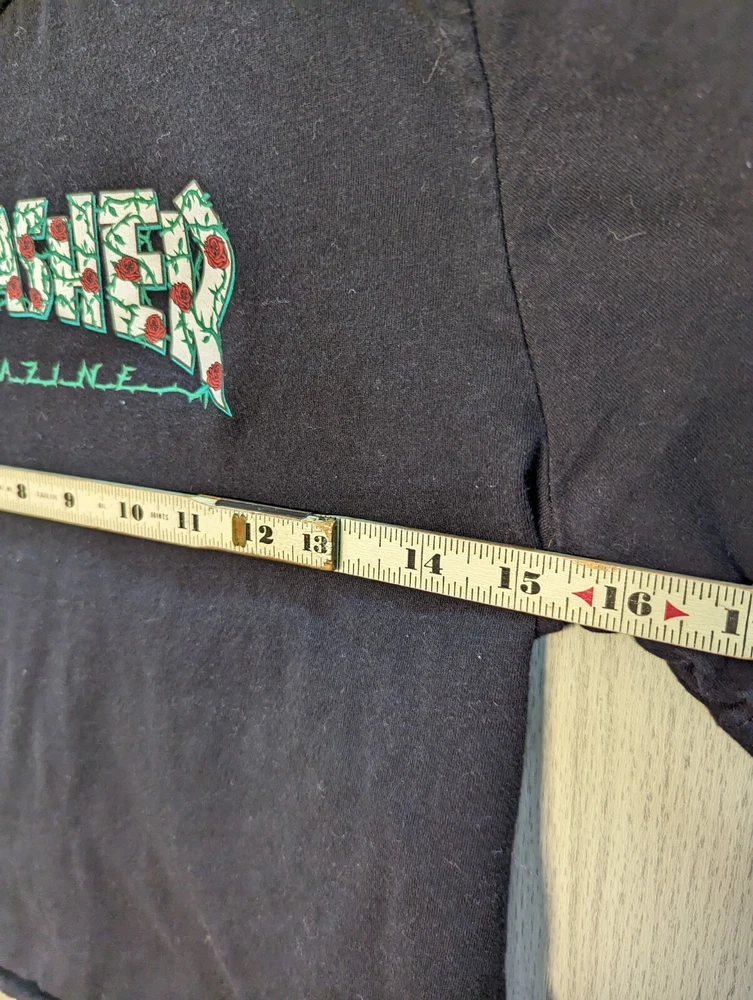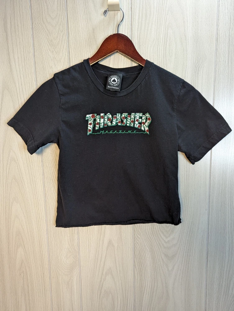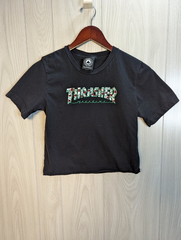 Thrasher Magazine Rose Vine LOGO Cropped Skateboard Black T Shirt Adult Small. Please see photos for a better idea of the condition and measurements