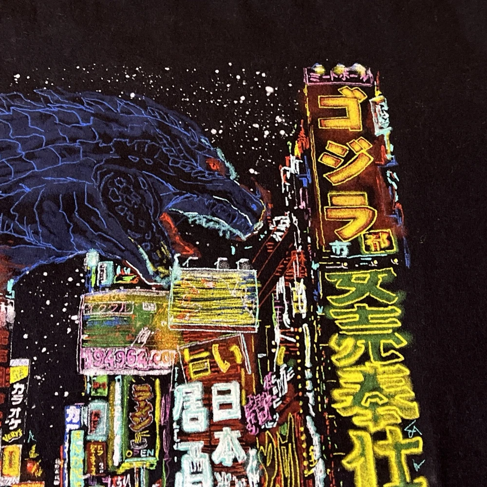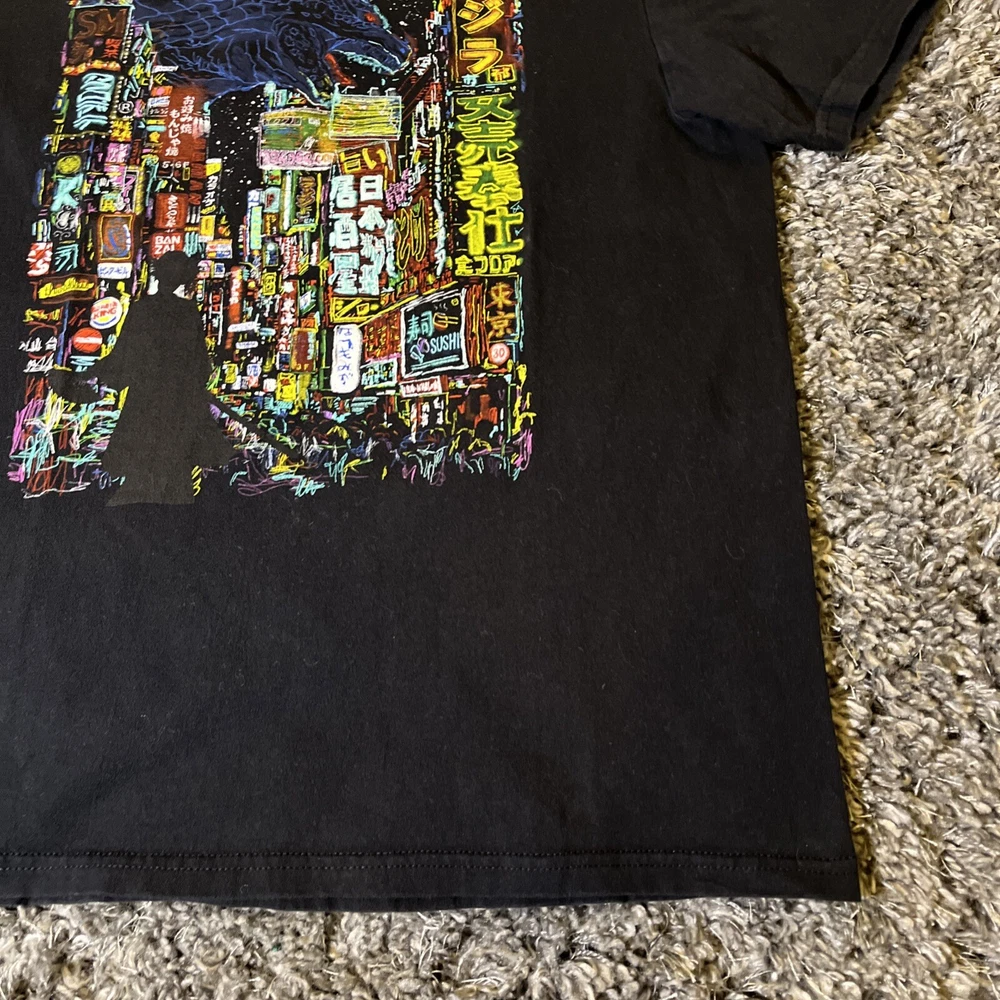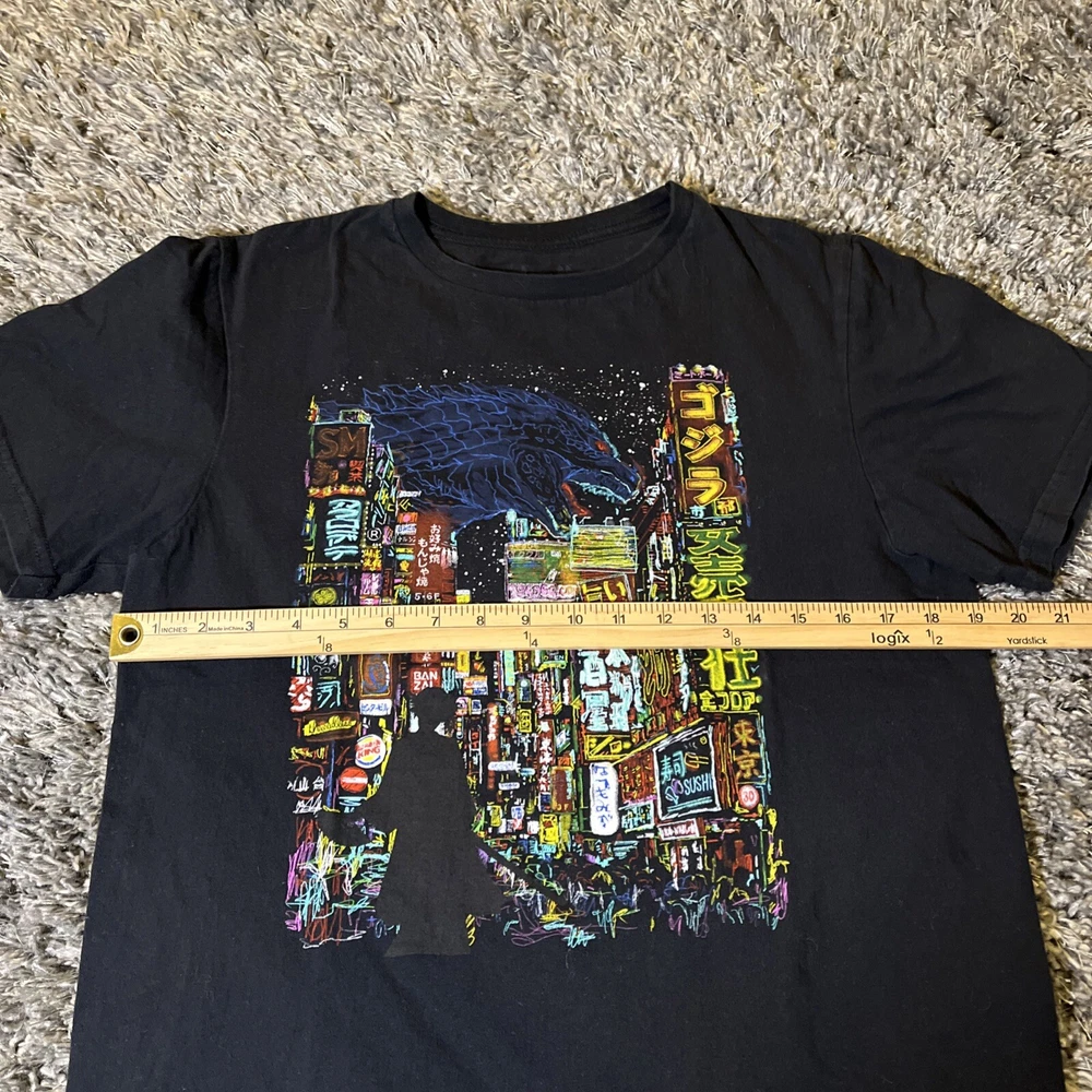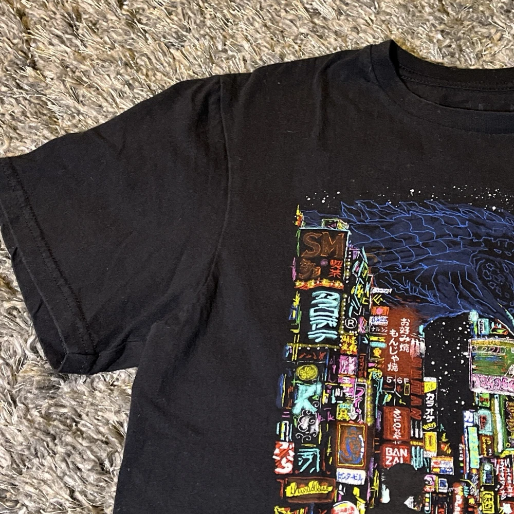 This is a medium-sized Threadless T-shirt featuring a graphic print of Godzilla in a neon Kaiju city setting. The design has an anime-inspired style with a kooky and loveable theme. Made of lightweight cotton knit fabric, this crew neck T-shirt with short sleeves is suitable for all seasons. Ideal for fans of anime, Japan, and outdoor themes, this unisex adults' tee is machine washable and suitable for everyday wear.