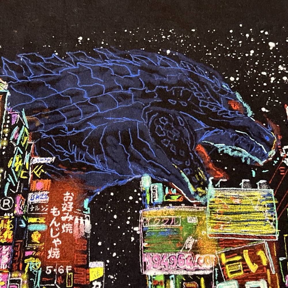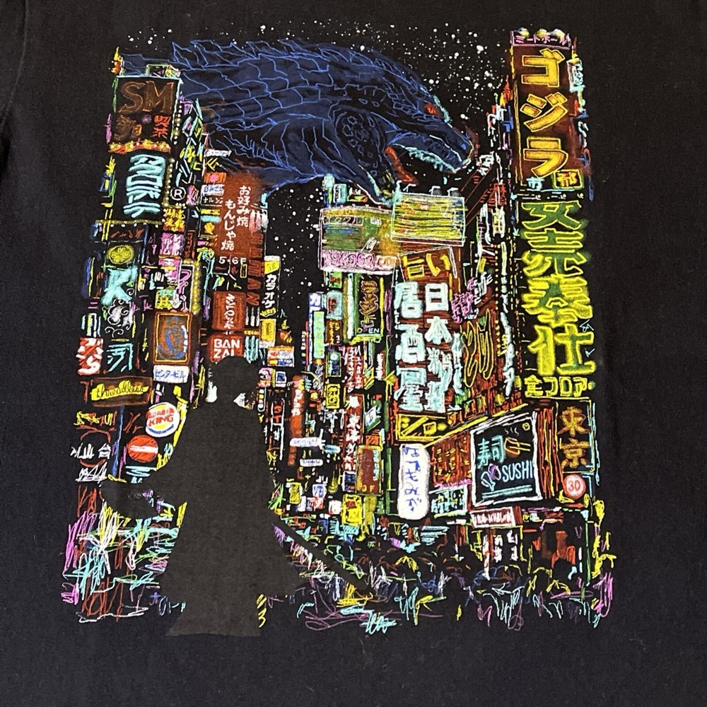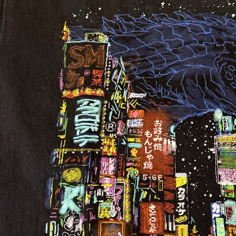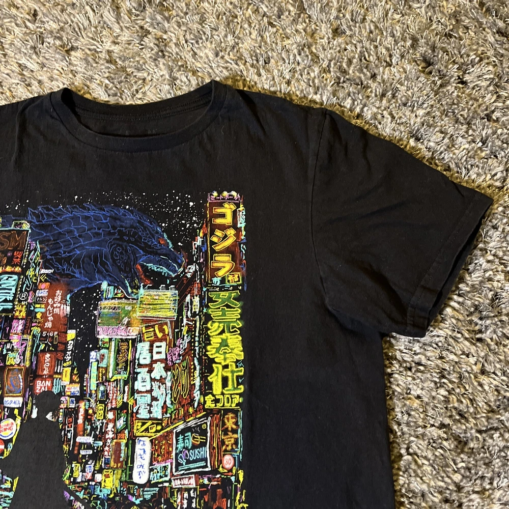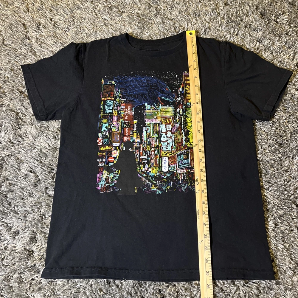 This is a medium-sized Threadless T-shirt featuring a graphic print of Godzilla in a neon Kaiju city setting. The design has an anime-inspired style with a kooky and loveable theme. Made of lightweight cotton knit fabric, this crew neck T-shirt with short sleeves is suitable for all seasons. Ideal for fans of anime, Japan, and outdoor themes, this unisex adults' tee is machine washable and suitable for everyday wear.
