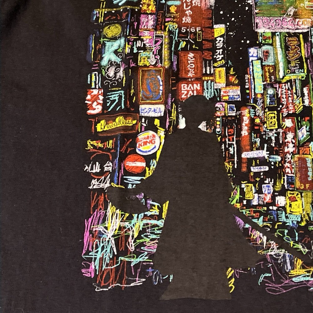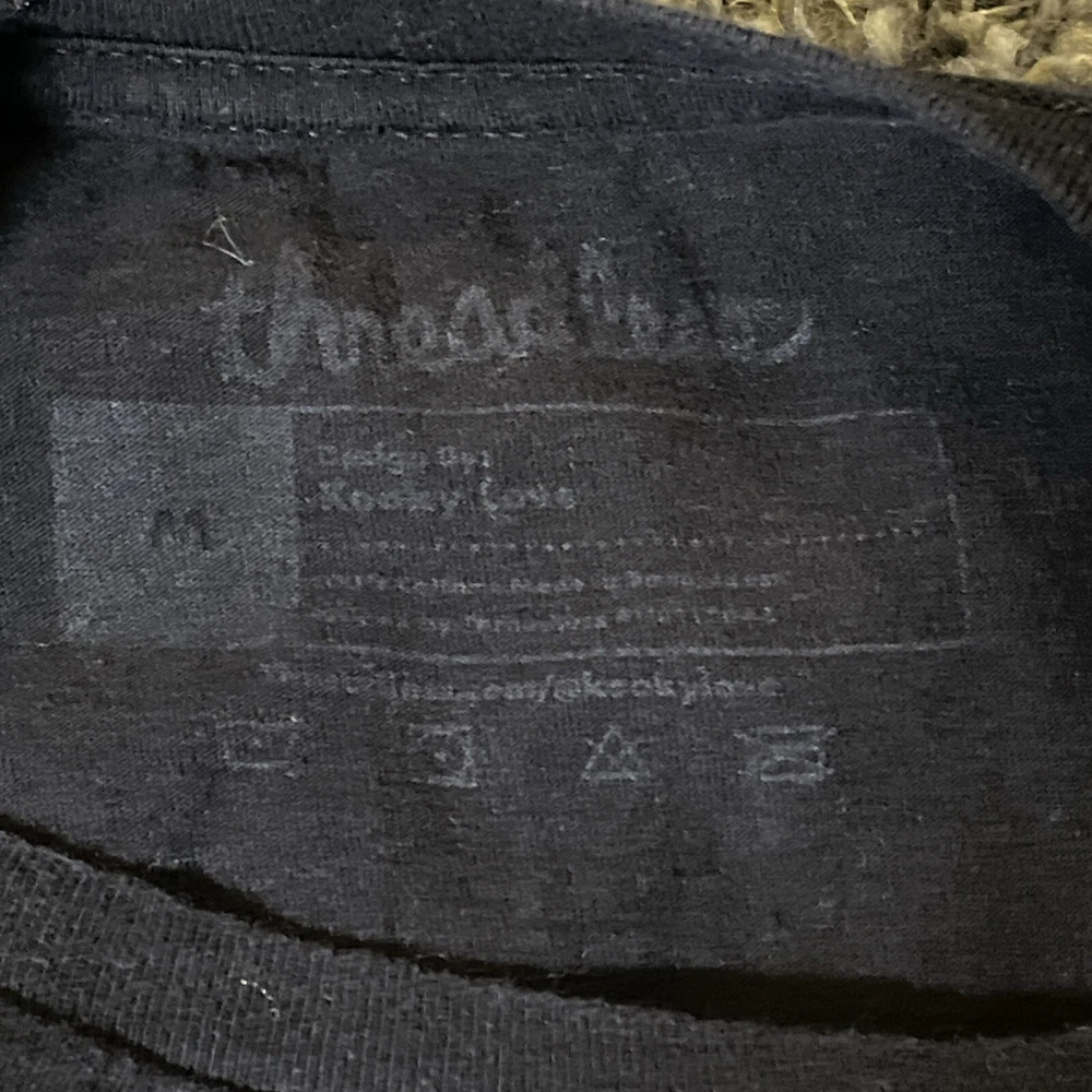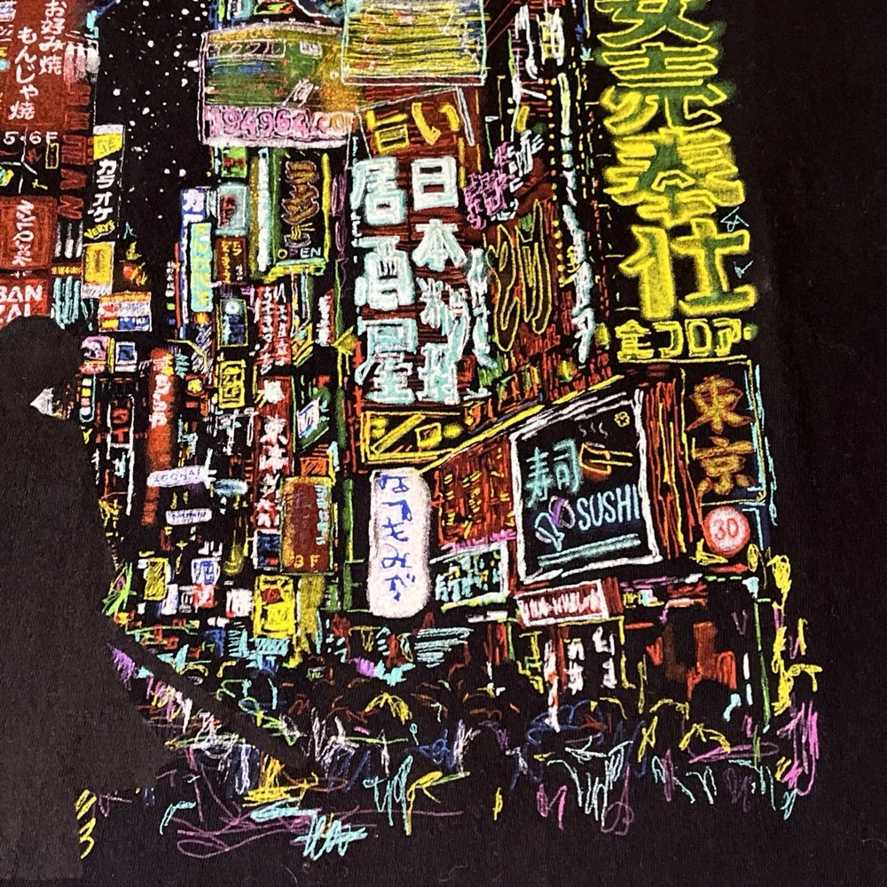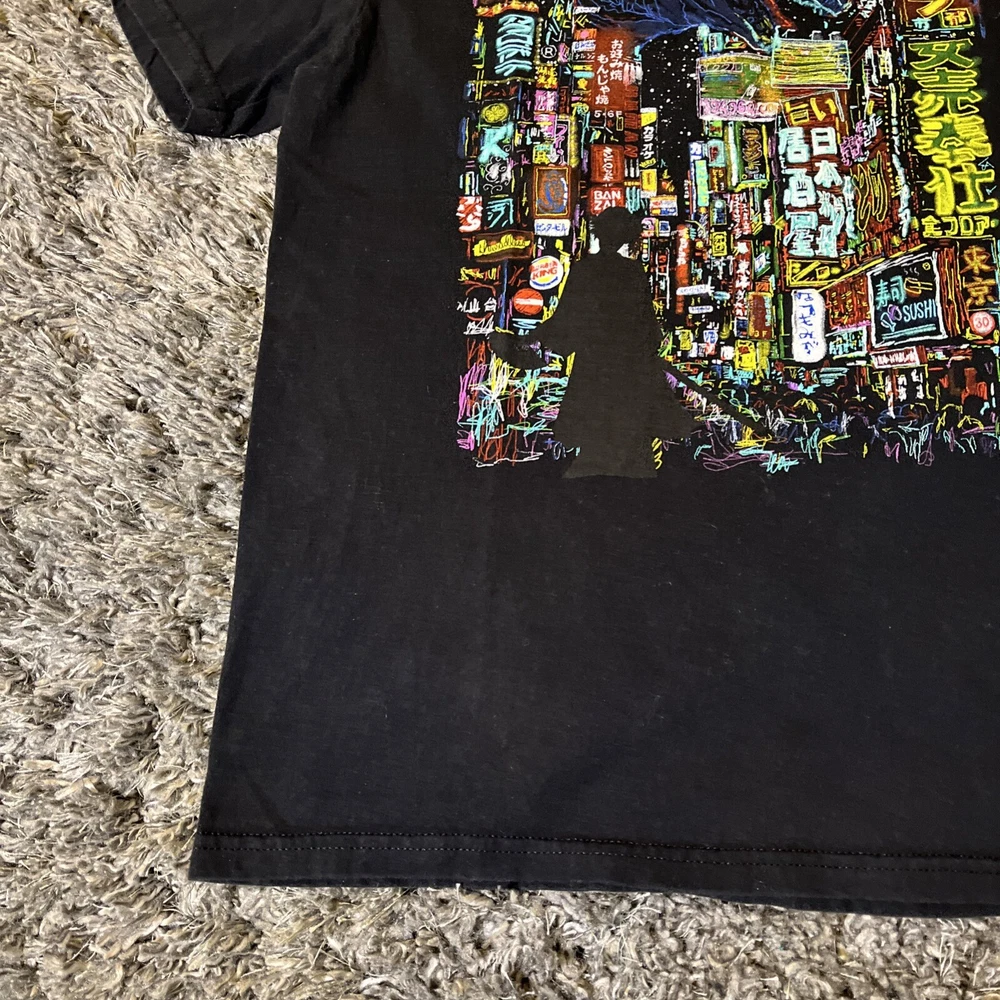 This is a medium-sized Threadless T-shirt featuring a graphic print of Godzilla in a neon Kaiju city setting. The design has an anime-inspired style with a kooky and loveable theme. Made of lightweight cotton knit fabric, this crew neck T-shirt with short sleeves is suitable for all seasons. Ideal for fans of anime, Japan, and outdoor themes, this unisex adults' tee is machine washable and suitable for everyday wear.