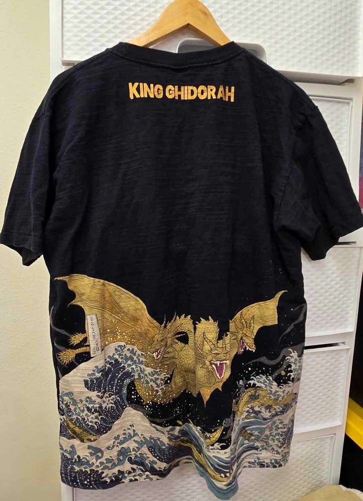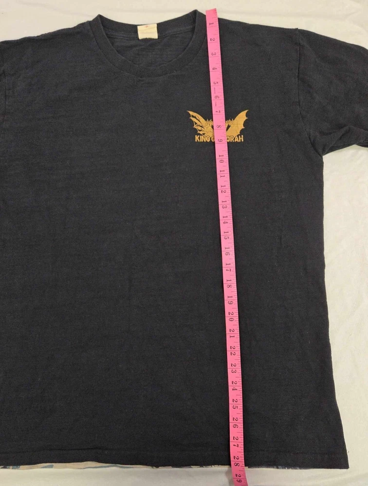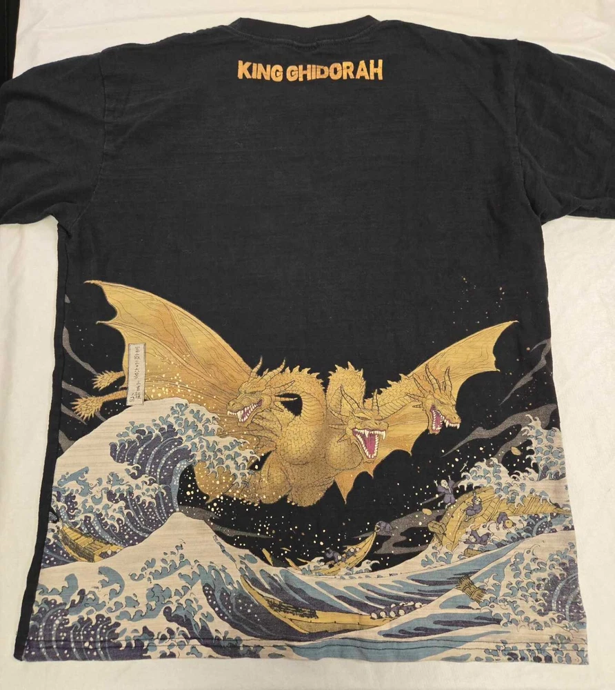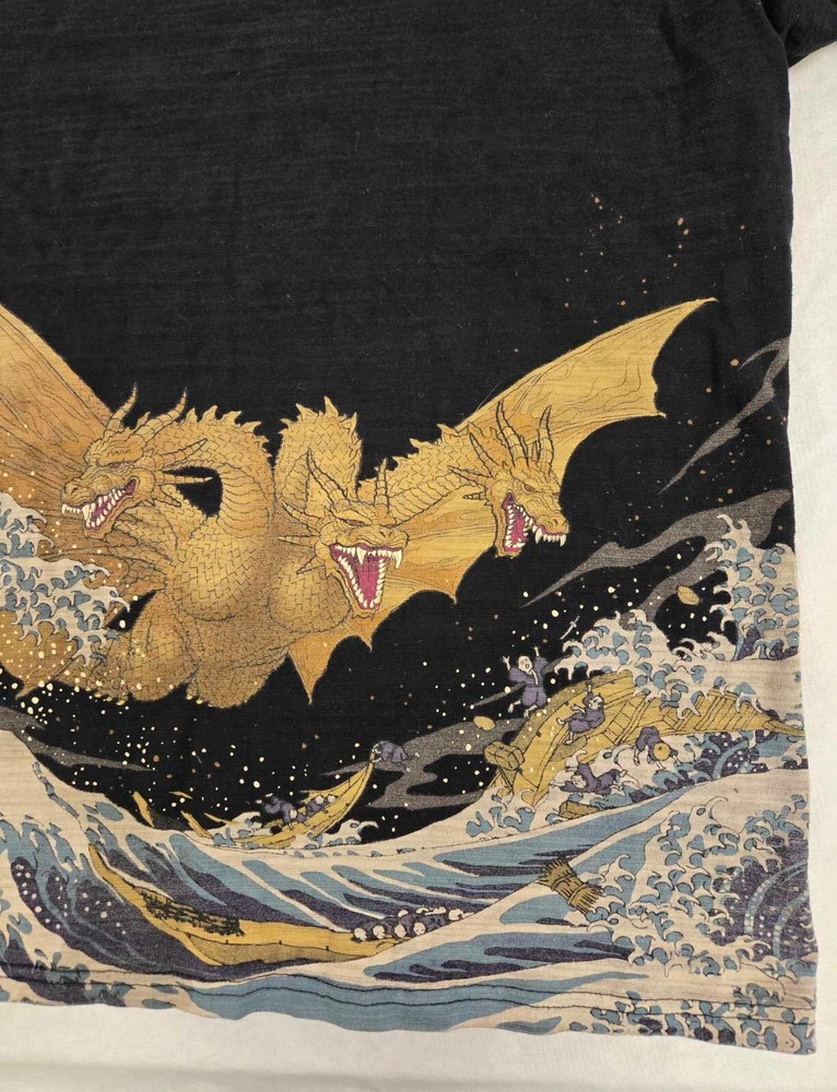 King Ghidorah Godzilla Ukiyo-e Wave T-Shirt XXL TOHO Japan Folcart Hokusai Style Black Authentic licensed Godzilla x King Ghidorah graphic t-shirt featuring a striking ukiyo-e inspired wave print, reminiscent of Hokusai’s iconic Great Wave . Officially produced by Folcart Co., Ltd. for TOHO Studios , this collectible shirt features: Size : XXL (Chest 96–102cm) Color : Black with full back artwork Material : 100% Cotton Style No. : GZ-UT-008 Made in China under Japanese license Condition : very good Front features gold King Ghidorah crest on the chest; back showcases a vivid full-panel print of King Ghidorah rising from stylized waves. A must-have for fans of classic Kaiju, Japanese art mashups, and vintage-style Godzilla apparel. Rare and hard to find, especially in XXL. inv. 126