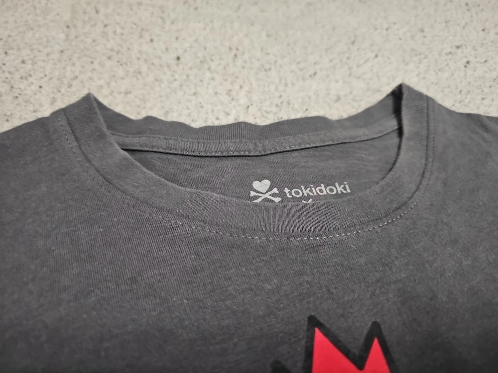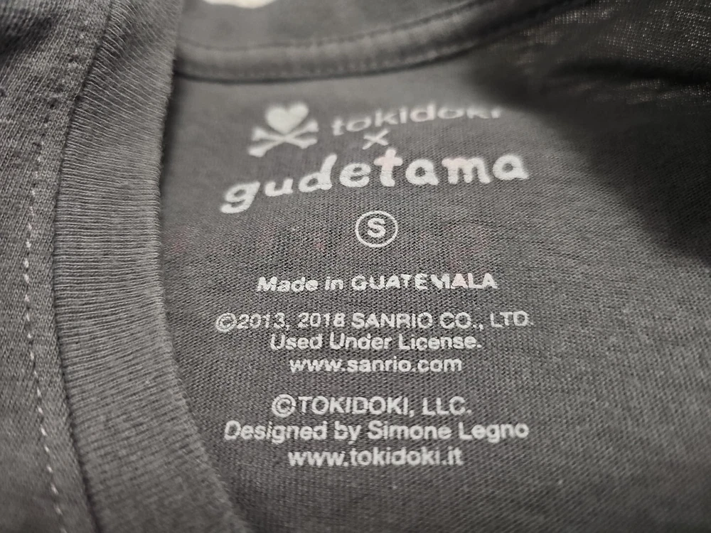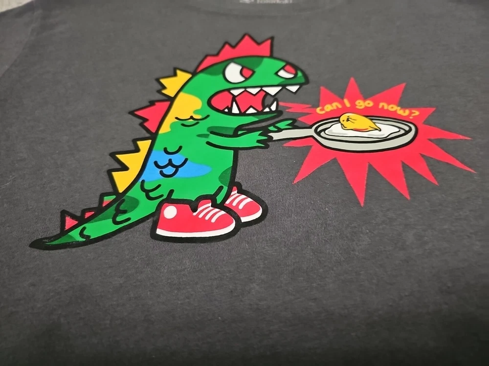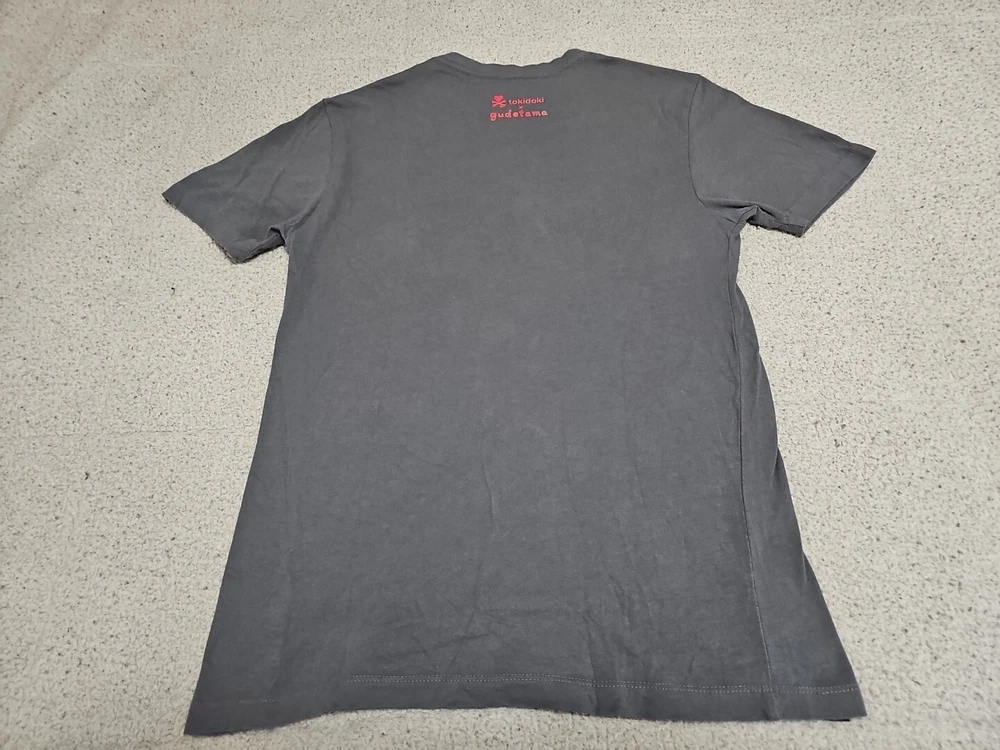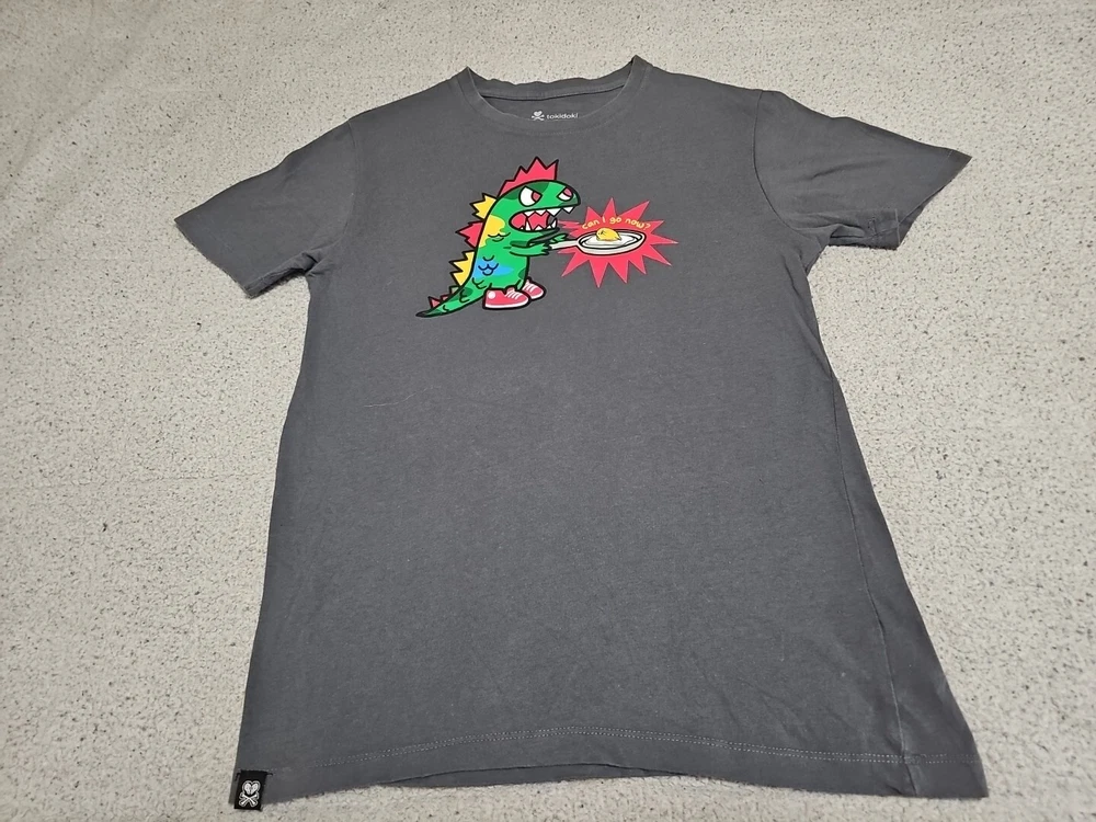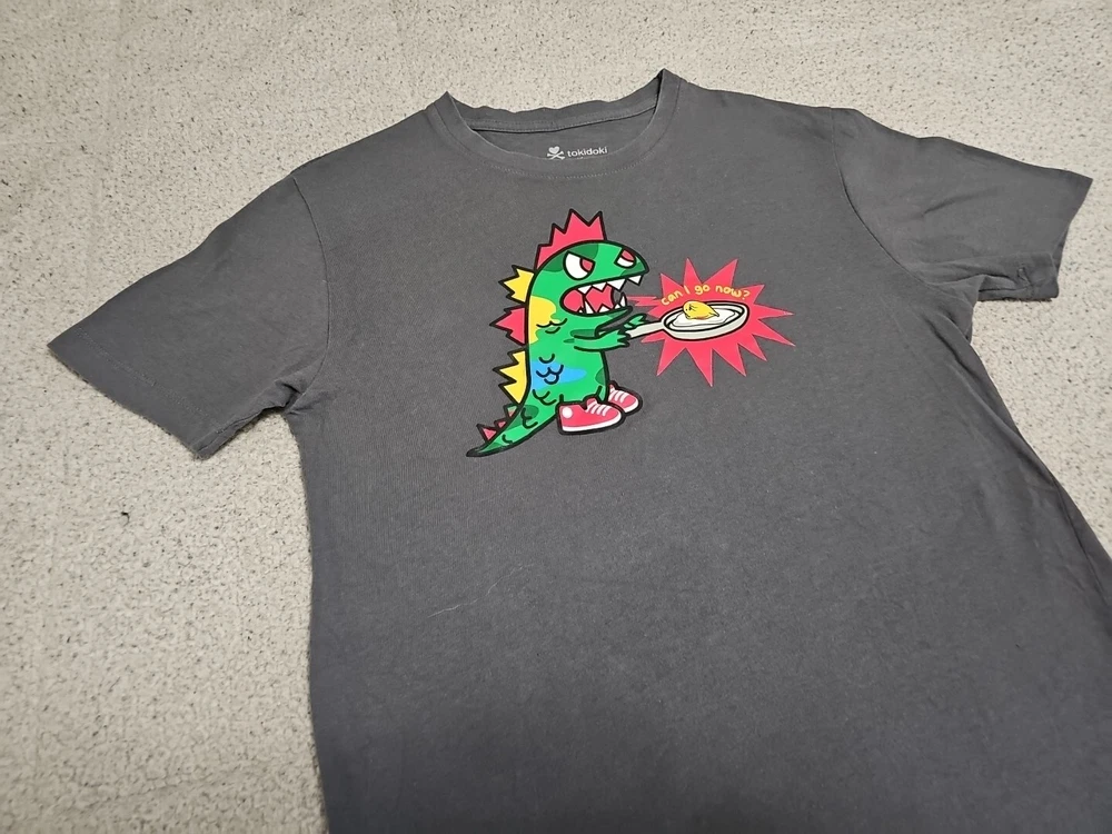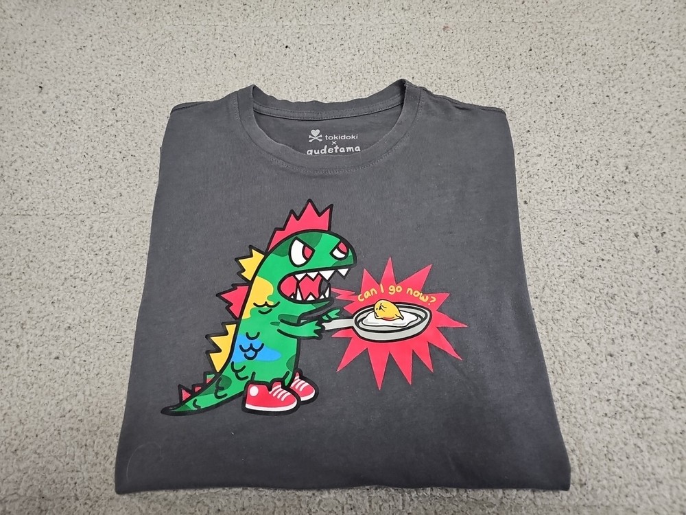 This Tokidoki x Gudetama t-shirt features a unique graphic print of the iconic Godzilla character and the Gudetama Egg with the phrase "Can I Go Now?" The short-sleeved shirt has a collard neck and pullover closure, made from 100% cotton material. It is a size small and a regular fit for women. The shirt is designed by tokidoki, a well-known brand, and is perfect for fans of Godzilla and those who appreciate unique clothing. It is made in Guatemala and is a great addition to any wardrobe. MEASURES 17" FROM PIT TO PIT MEASURES 26" FROM TOP TO BOTTOM