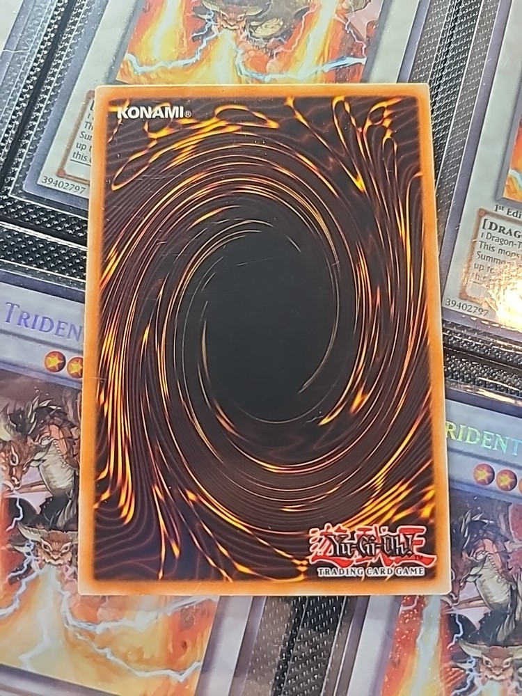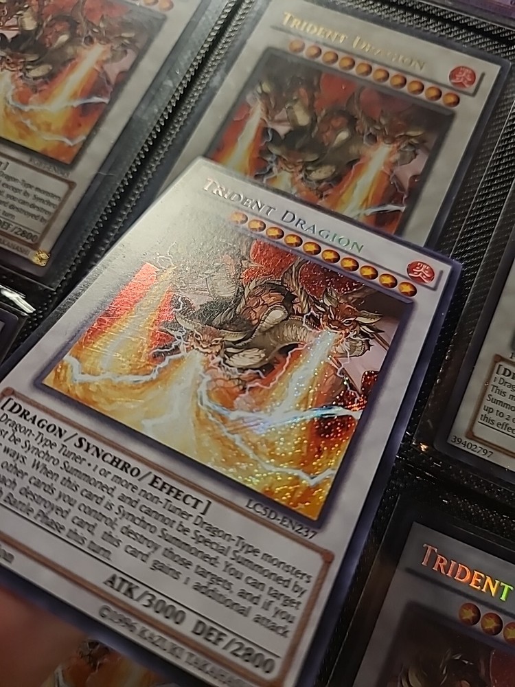 The Trident Dragion LC5D-EN237 is a Secret Rare card from the Legendary Collection 5D's set of the Yu-Gi-Oh! TCG. It is an Effect/Synchro type card with an attack power of 3000 and a defense toughness of 2800. The card features the creature/monster type Dragon and has the attribute/MTG color Fire. The card is in its 1st Edition and is manufactured by Konami.