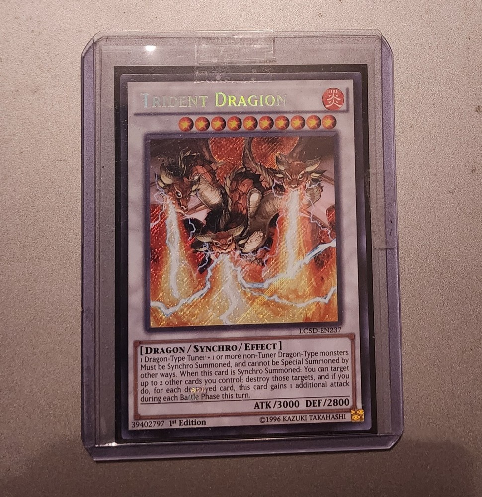 Absolutely love this Secret Rare Trident Dragion! The artwork is stunning, and its effect makes it a game-changer—extra attacks for destroying your own cards? Brutal in the right deck! Pulling a 1st Edition from the Legendary Collection 5D's set feels awesome. A must-have for Dragon-Type Synchro fans!