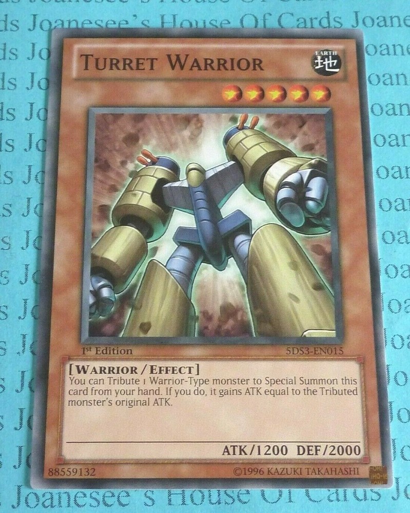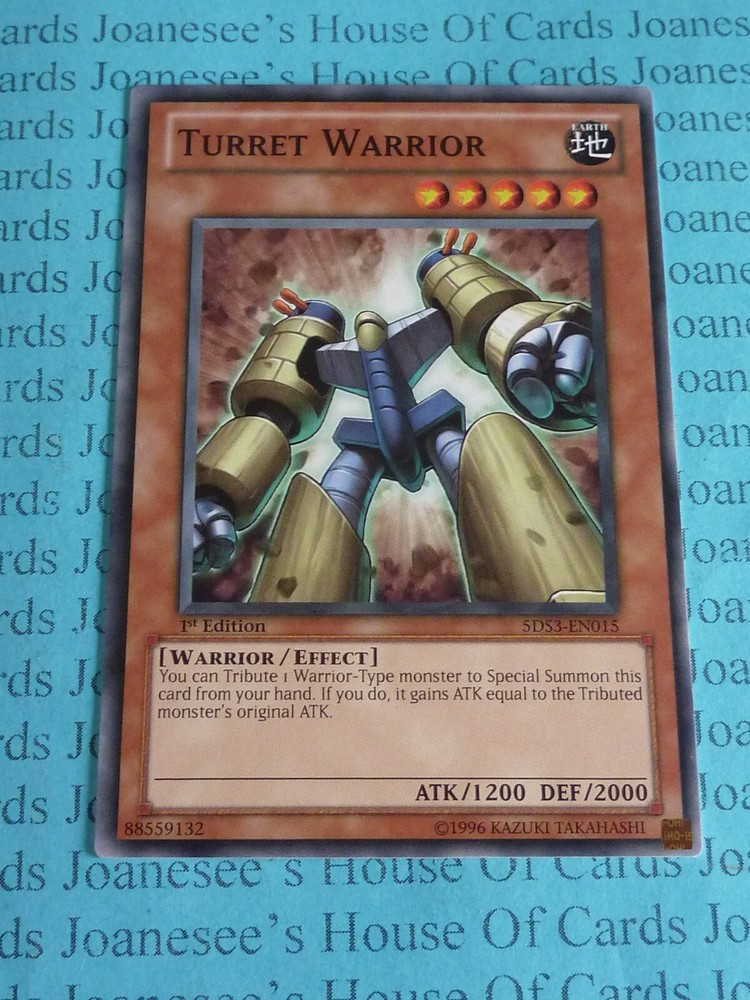 This is the Common Earth Warrior Turret Warrior 5 Stars ATK/1200 DEF/2000 Card text: You can Special Summon this card (from your hand) by Tributing 1 Warrior-Type monster, and if you do, it gains ATK equal to the Tributed monster's original ATK. 5DS3-EN015 1st Edition English Mint/NMint Condition Totally Original Konami (or your money back!) I will deliver in safe packaging to keep it in perfect condition. Ideal for players and collectors alike. Check out my other items! I will combine postage costs for multiple purchases. Sign up for my email newsletters by adding my eBay Shop to your favourites