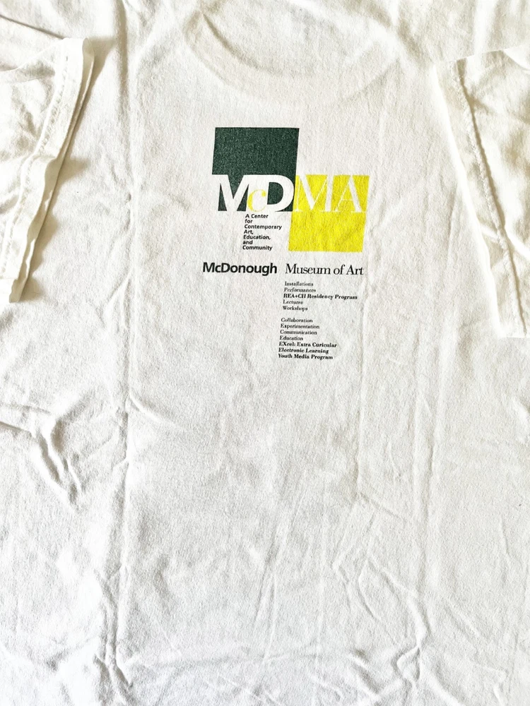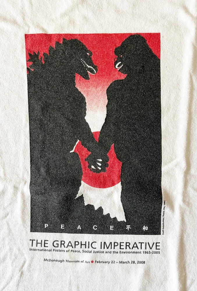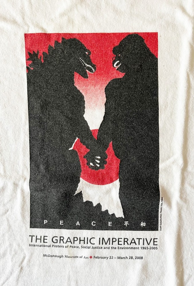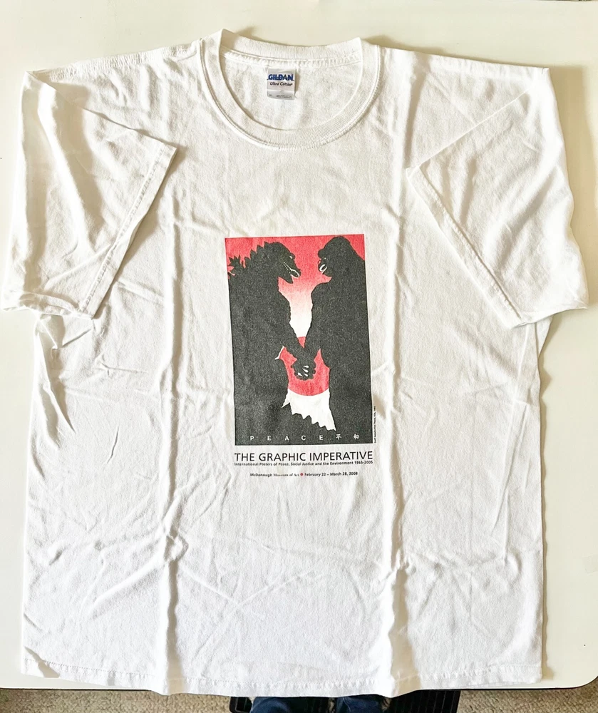 Unisex XL white t-shirt with Godzilla and King Kong holding hands graphic image. The image is a poster for peace designed by Steff Geissbuhler in 1985. The poster image was used on a promotional t-shirt for the exhibition Graphic Imperative: International Posters on Peace, Social Justice and The Environment 1965–2005 , held at the McDonough Museum in Youngstown, Ohio, February 22 – March 28, 2008 (museum logo and info printed on the back of the shirt). A very small batch of these t-shirts were printed. This is definitely a collector's item! The shirt is bright white (sorry for the grayness of the photo). sizing: Armpit to armpit: 24" (48") Shoulder to bottom hem: 29.5" Shoulder to armpit: 11"
