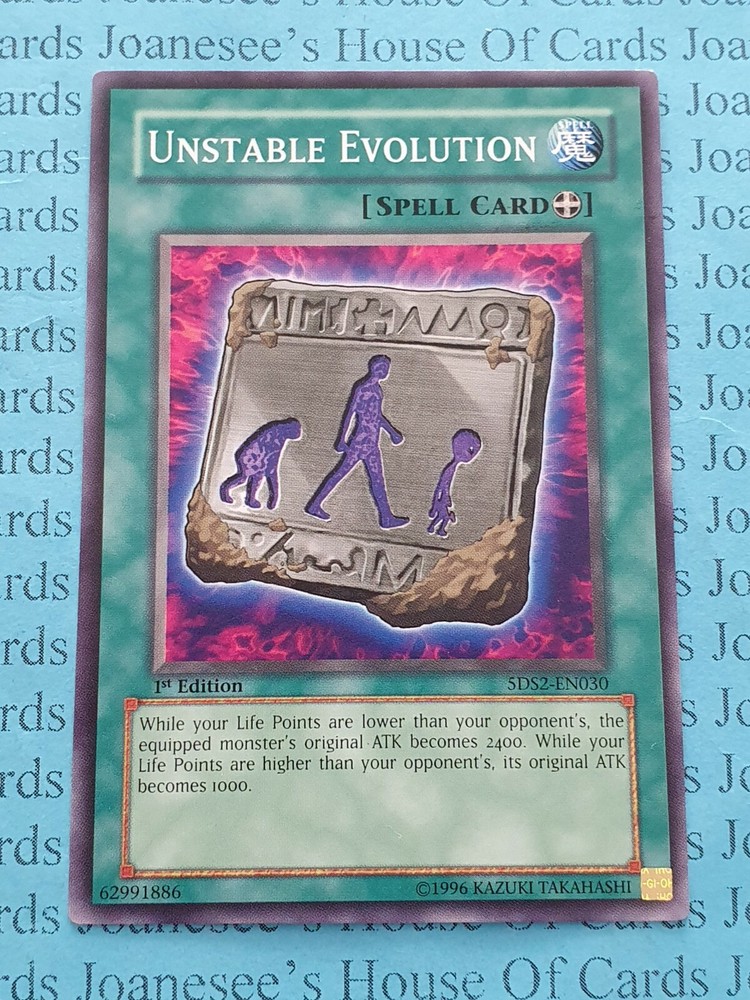 This is a Common Spell Unstable Evolution Card text: While your LP is lower than your opponent's, the equipped monster's original ATK becomes 2400. While your LP is higher, the equipped monster's original ATK becomes 1000. 5DS2 -EN030 1st Edition English Mint/NMint Condition Totally Original Konami (or your money back!) I will deliver in safe packaging to keep it in perfect condition. Ideal for players and collectors alike. Check out my other items! I will combine postage costs for multiple purchases. Sign up for my email newsletters by adding my eBay Shop to your favourites