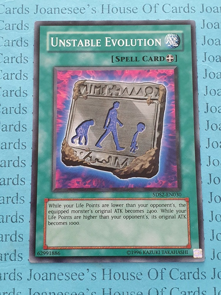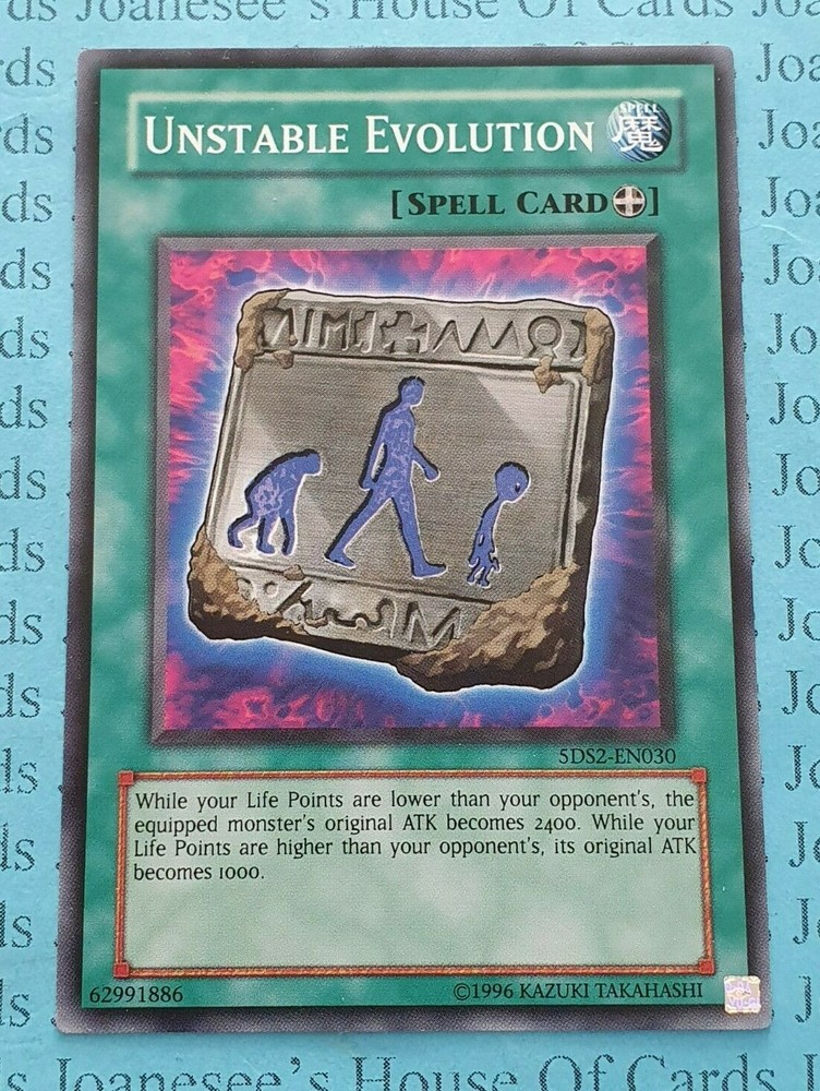 This is a Common Spell Unstable Evolution Card text: While your LP is lower than your opponent's, the equipped monster's original ATK becomes 2400. While your LP is higher, the equipped monster's original ATK becomes 1000. 5DS2 -EN030 Unlimited Edition English Mint/NMint Condition Totally Original Konami (or your money back!) I will deliver in safe packaging to keep it in perfect condition. Ideal for players and collectors alike. Check out my other items! I will combine postage costs for multiple purchases. Sign up for my email newsletters by adding my eBay Shop to your favourites