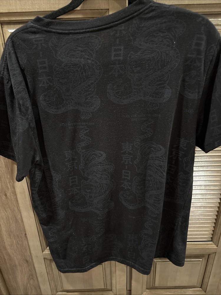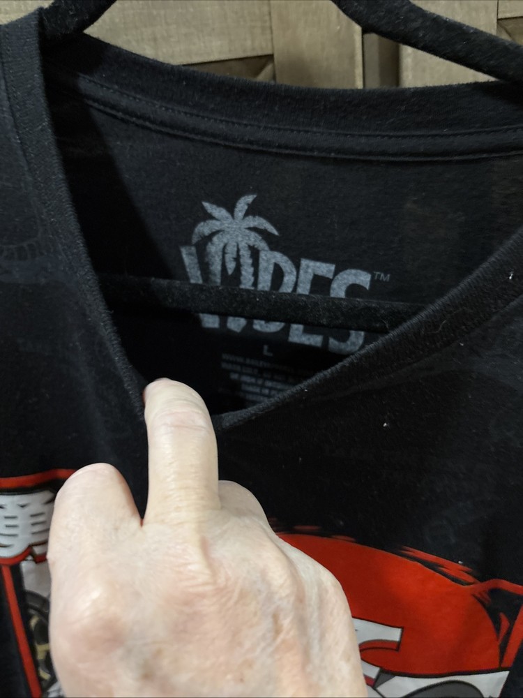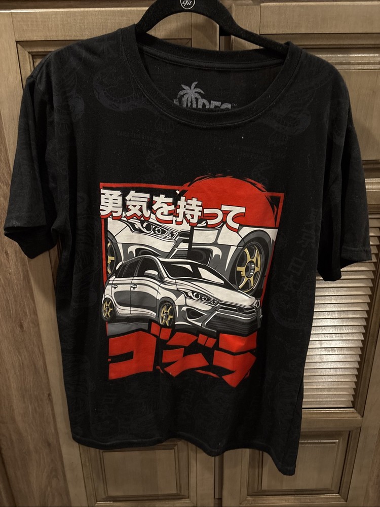 This is a Men's Size L T-shirt from the VIBES brand featuring a design inspired by the iconic Japanese character Godzilla. The shirt has a Crew Neck and Short Sleeves, made of a Polyester and Cotton blend in a Multicolor pattern. The T-shirt embraces a Pop culture theme, showcasing a fusion of influences including Speed Racer and a nod to Tokyo, Japan. With a Regular fit and a vibrant, colorful design, this garment is perfect for fans of movie monsters and retro pop culture. Excellent condition crisp black.