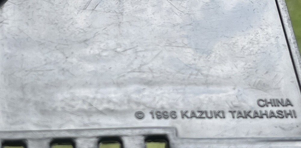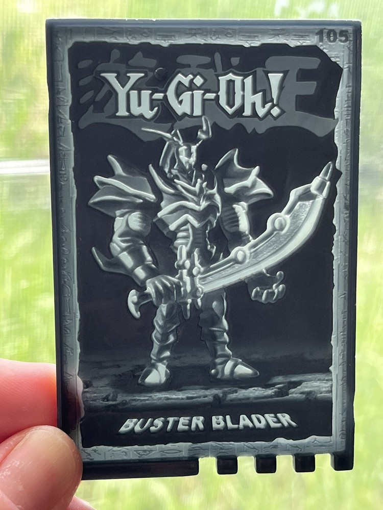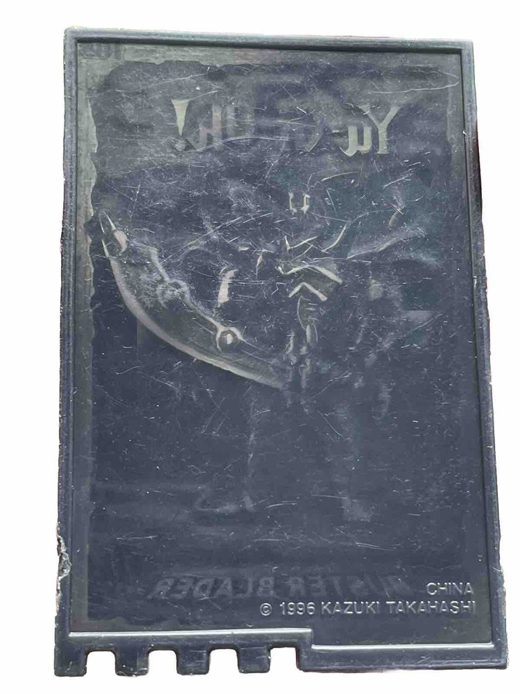 The product is a vintage 1996 Kazuki Takahashi Yu-Gi-Oh 3D Effect Card featuring Buster Blader. This card belongs to the Yu-Gi-Oh franchise and TV show. Made of plastic with a black color, this card is a unique collectible item from the 1990s, making it a sought-after item for fans and collectors of anime and manga.