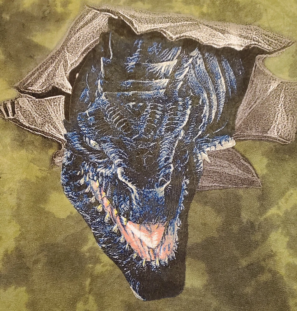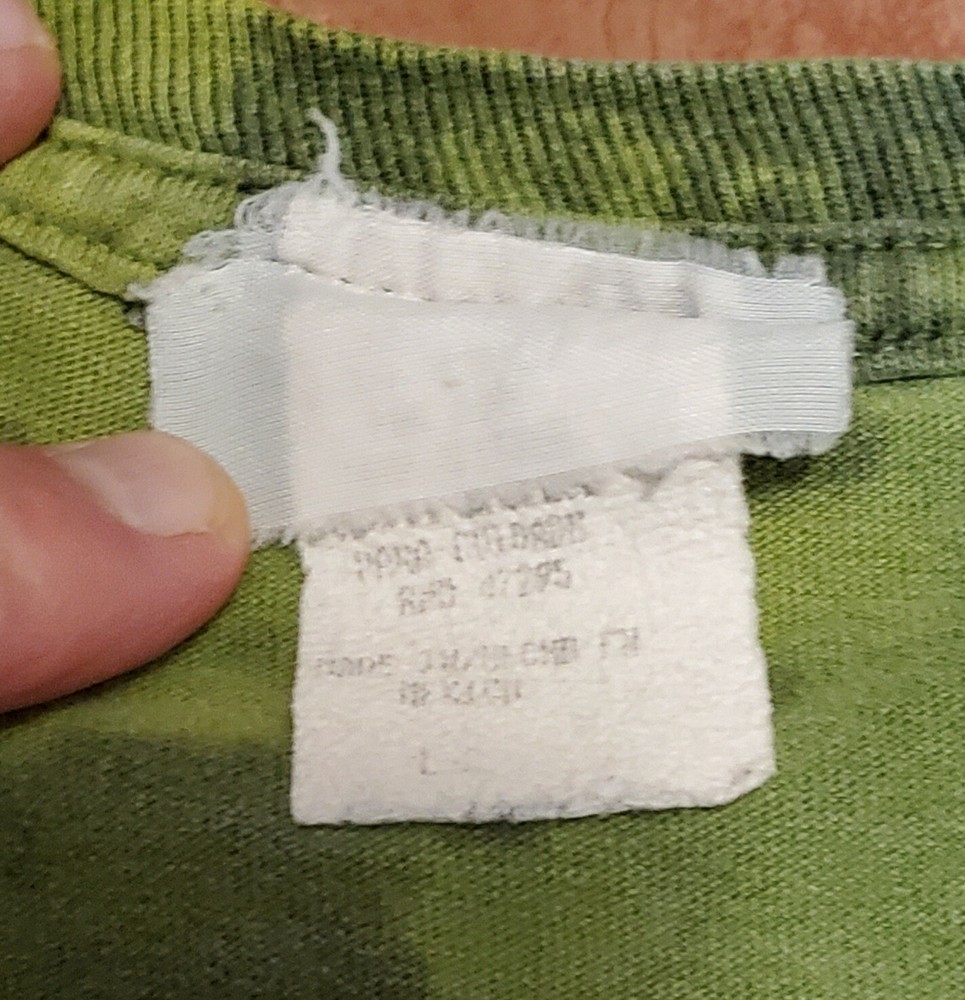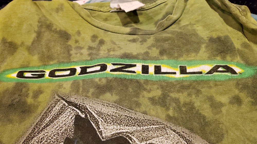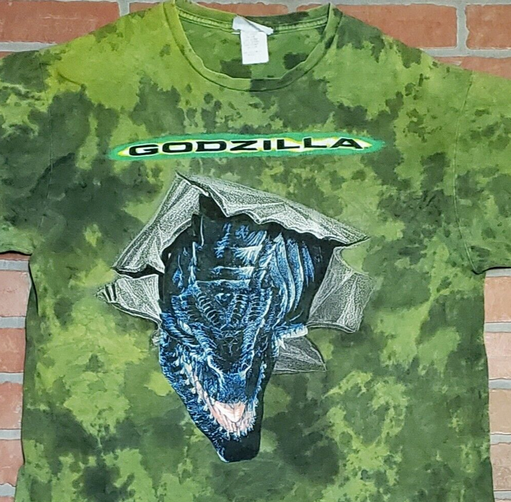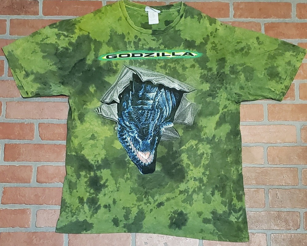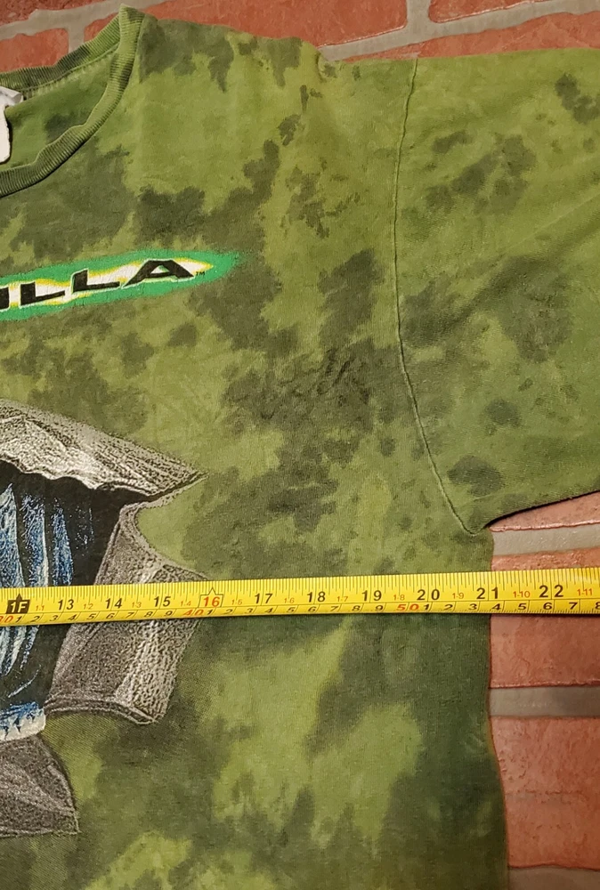 Up for sale is a VERY RARE VINTAGE 1998 Official GODZILLA Movie Promo t shirt estimated size is an EXTRA LARGE (XL see measurements below). Condition is Pre-owned. Shipped USPS Ground Advantage. This RARE VINTAGE dark/light green/camouflage style t shirt has a large colorful image Godzilla breaking through a wall along with the words " Godzilla" printed on the front of the shirt. A great looking VINTAGE Godzilla movie promo t shirt suitable for wearing. A nice Godzilla / Japanese Monster / Movie collectible. This t shirt shows some signs of wash and wear, and age. The print shows some signs of wash, wear and age and some slight fading and some slight cracking (see photos # 1-4). The print is colorful and vivid with lots of detail. The tags are faded and one of them is washed out (see photos # 4,5 ). There are some missing stitches on the hem of the left front sleeve (see photo # 7 ), and on the back bottom hem of the shirt (see photos # 11,12). PLEASE REVIEW ALL OF THE PHOTOS CLOSELY TO CHECK THE CONDITION FOR YOURSELF. PLEASE USE THE ZOOM FEATURE TO CLOSELY INSPECT THE ITEM. The tag on this VINTAGE t shirt is washed out and unreadable. I am estimating the size to be approximately an EXTRA LARGE (XL) in size. Please see measurements below- The measurements of the shirt are approximately (measured flat): pit to pit - 21 inches hem to collar - 29 inches PLEASE CHECK ALL OF THE PHOTOS FOR SIZING TO BE SURE IT WORKS FOR YOU! (see photos # 8,9) I will ship within three business days after payment clears. I will contact the buyer if it will take longer to ship for some reason. I will only ship within the U.S.A.. Please feel free to contact me with any questions or concerns.
