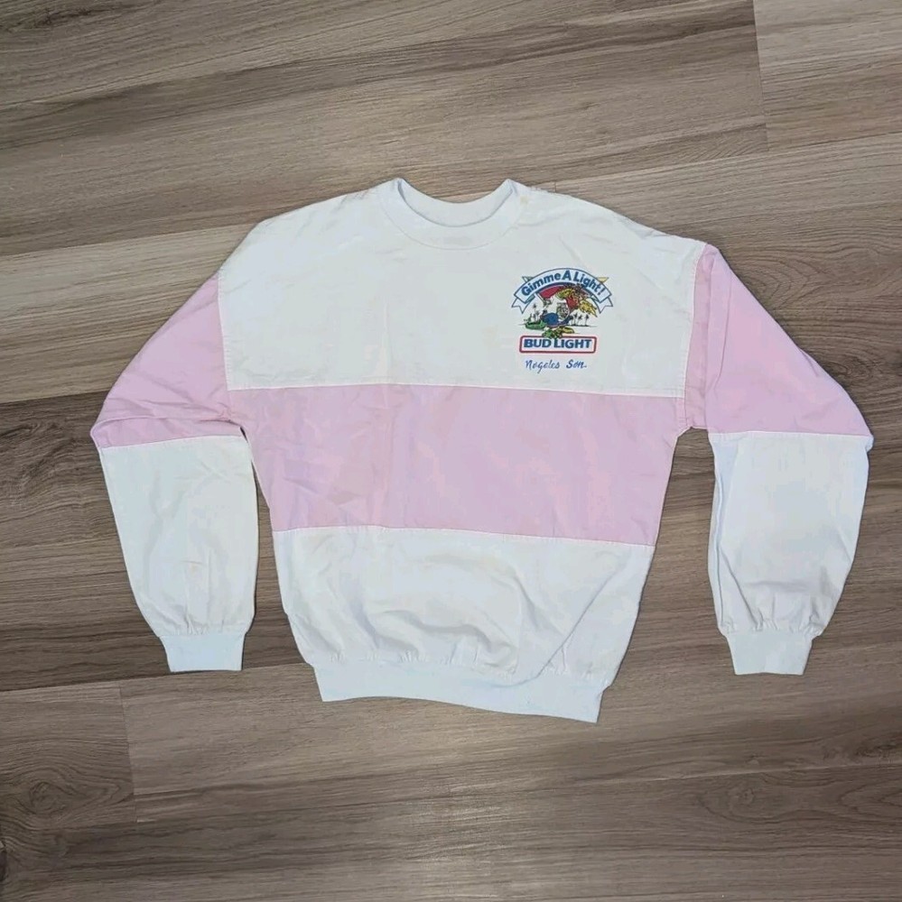 Rare true vintage 80s white and pink Bud Light long sleeve shirt. Size small, 100% cotton. Small stain on collar and inner right sleeve as pictured. Lightweight and oversized for a baggy 80s feel. 🌴🐊🍺 9.3oz shipped