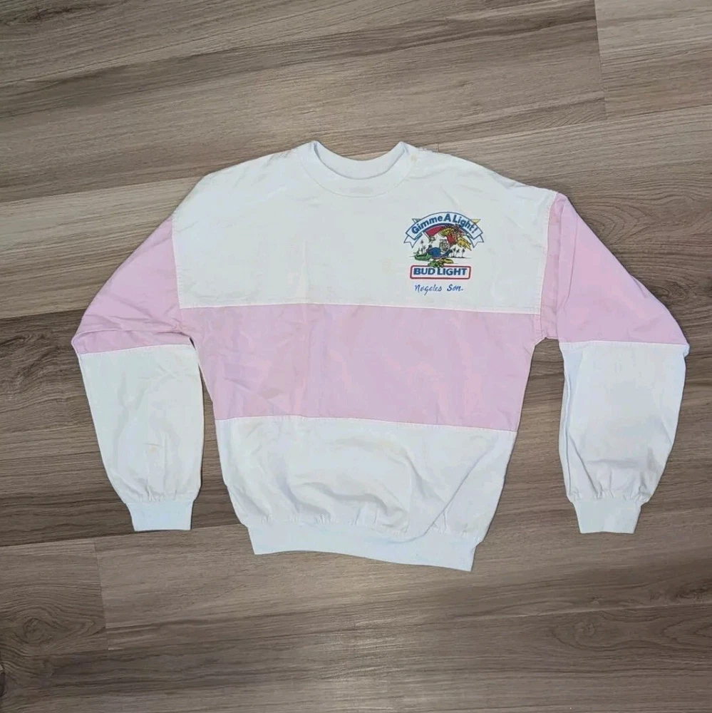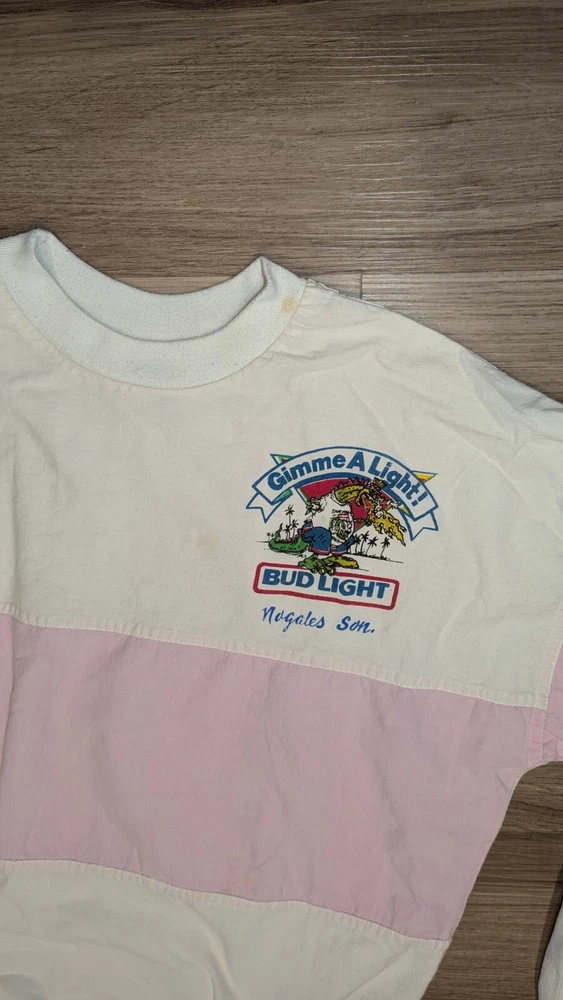 Rare true vintage 80s white and pink Bud Light long sleeve shirt. Size small, 100% cotton. Small stain on collar and inner right sleeve as pictured. Lightweight and oversized for a baggy 80s feel. 🌴🐊🍺...
