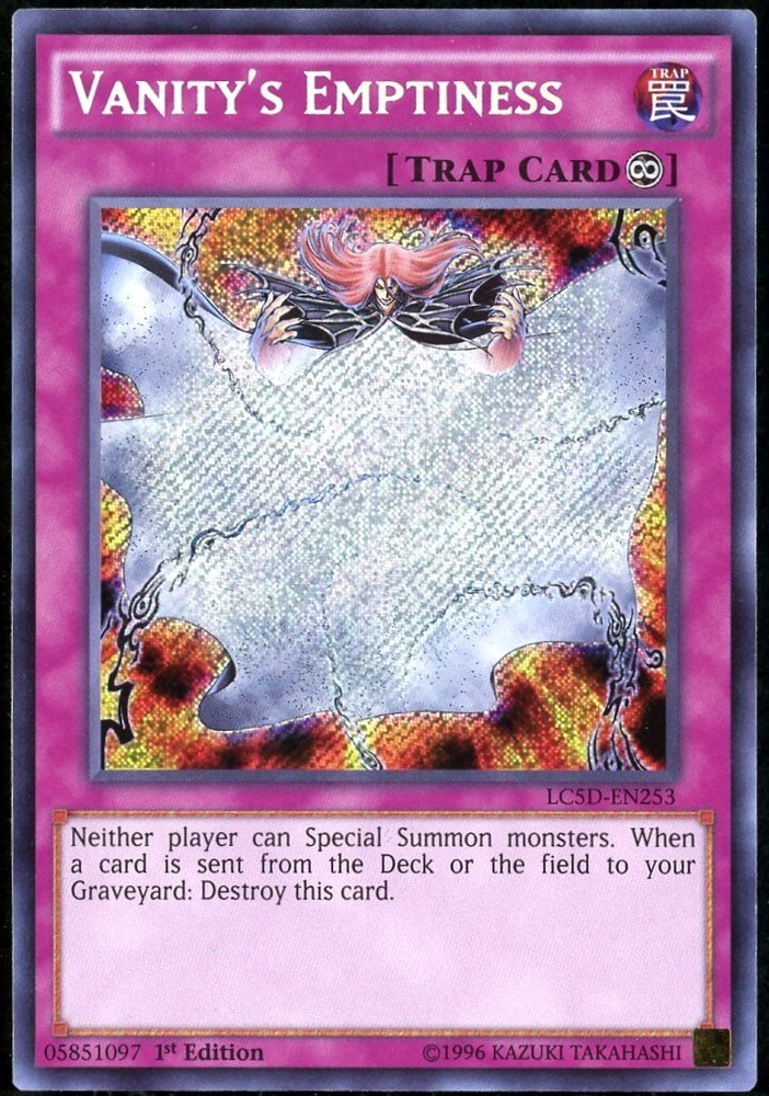 Card: Vanity's Emptiness Rarity: Secret Rare Condition: LP Card Notes : Minor scuffing on the back of the card . Please view photos for scans of the card! Shipping in an eBay trading card envelope. I ship international through eBay International Shipping. Interested in more than one card? Check out in the same order to save on shipping! Please contact me if you have any questions.