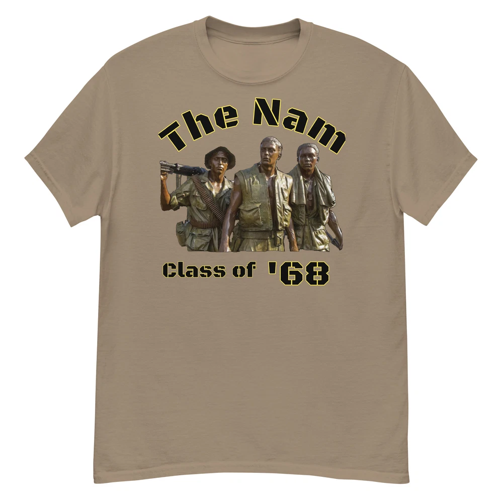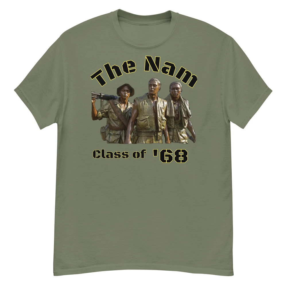 Hello and THANK YOU for looking! THE NAM CLASS OF 68- TELL ME WHAT YEAR YOU WERE THERE!!!! I CAN MAKE YOU ONE WITH YOUR YEAR OF SERVICE...(THANK YOU FOR YOUR SERVICE) PLEASE MEASURE AND MAKE SURE OF YOUR SIZE BEFORE ORDERING. NEW DESIGNS DAILY. CHECK OUT MY STORE. THE ULTIMATE COOL AND COMFORTABLE TEE SHIRT FOR ALL SEASONS - THIS IS ONE OF A KIND ART NOT FOUND IN ANY OTHER STORE IN THE WORLD. GREAT FOR GIFT OR WEAR DAILY SEE SIZE CHART AND MEASURE YOURSELF FOR A PERFECT FIT.. Welcome to Aurelio Designs, where we design “Art to Wear” clothes and T-Shirts. We aim to make you the coolest person in the room! PLEASE make sure you visit our store- as we are coming out with new designs daily that you won’t generally find in searches. Again, Please Click on “AURELIO DESIGNS STORE” and visit the store! This cool shirt is a year round go-to garment for all your indoor or outdoor activities. Comfortable fit with a crew-neck and designed with an artistic flair! Walking wearable art! This is sure to be a tee that you'll wear time and time again which we think will enrich your wardrobe and make you the coolest person in the room or on the street. The 100% cotton men's classic tee will help you land a more structured look. It sits nicely, maintains sharp lines around the edges, and goes perfectly with layered streetwear outfits. Plus, it's extra trendy now! • 100% cotton • Sport Grey is 90% cotton, 10% polyester • Ash Grey is 99% cotton, 1% polyester • Heather colors are 50% cotton, 50% polyester • Fabric weight: 5.0–5.3 oz/yd² (170-180 g/m²) • Open-end yarn • Tubular fabric • Taped neck and shoulders • Double seam at sleeves and bottom hem • Blank product sourced from Honduras, Nicaragua, Haiti, Dominican Republic, Bangladesh, Mexico Size guide LENGTH (inches) WIDTH (inches) SLEEVE LENGTH (inches) S 28 18 15 ⅝ M 29 20 17 L 30 22 18 ½ XL 31 24 20 2XL 32 26 21 ½ 3XL 33 28 22 ¾ 4XL 34 30 24 ¼ LENGTH (cm) WIDTH (cm) SLEEVE LENGTH (cm) S 71.1 45.7 39.7 M 73.7 50.8 43.2 L 76.2 55.9 47 XL 78.7 61 50.8 2XL 81.3 66 54.6 3XL 83.8 71.1 58 4XL 86.4 76.2 61.5