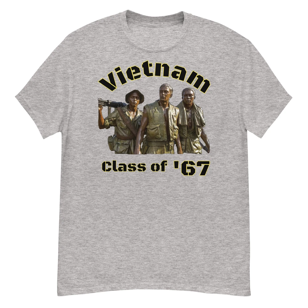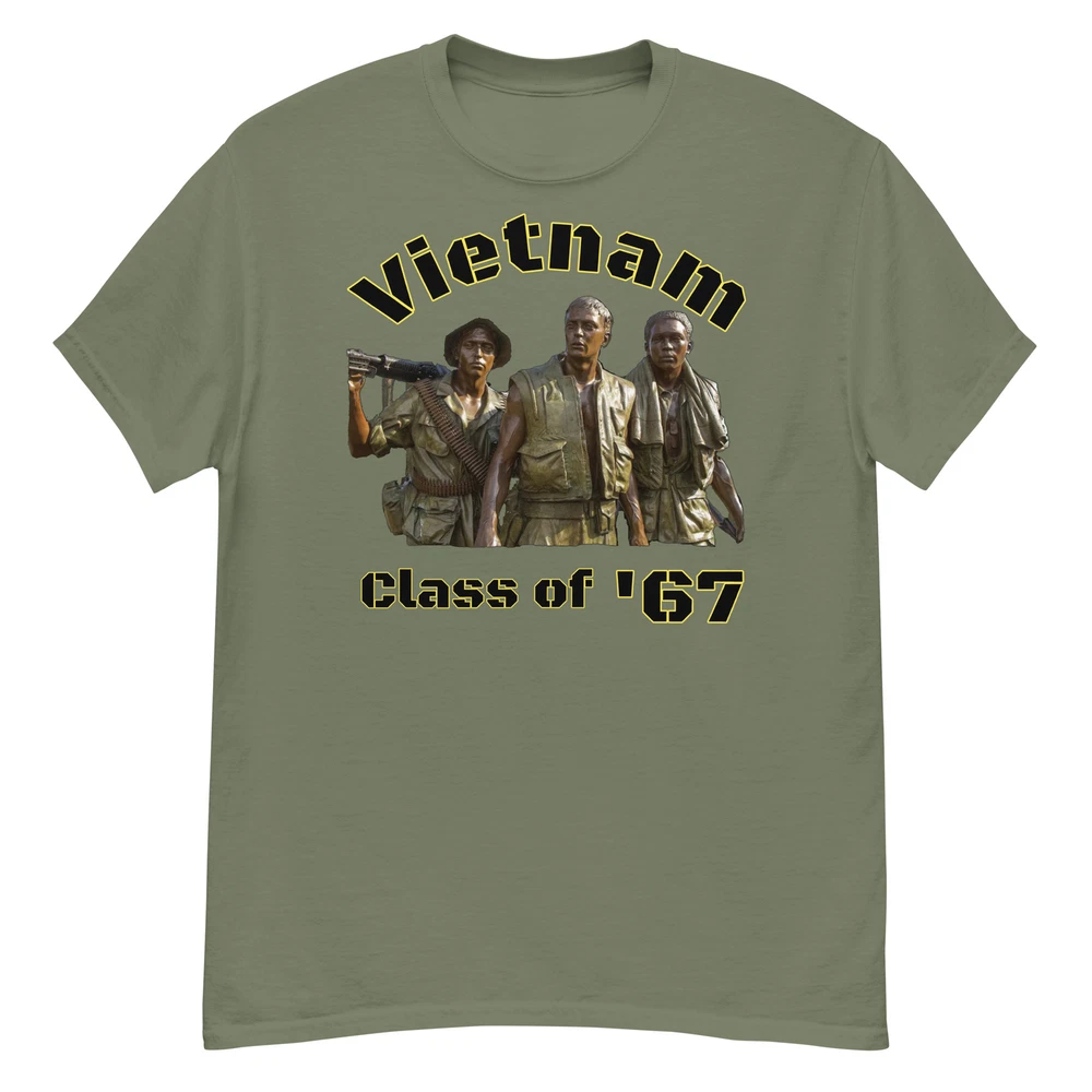 Hello and THANK YOU for looking! THE NAM CLASS OF '67- TELL ME WHAT YEAR YOU WERE THERE!!!! I CAN MAKE YOU ONE WITH YOUR YEAR OF SERVICE...(THANK YOU FOR YOUR SERVICE) PLEASE MEASURE AND MAKE SURE OF YOUR SIZE BEFORE ORDERING. NEW DESIGNS DAILY. CHECK OUT MY STORE. THE ULTIMATE COOL AND COMFORTABLE TEE SHIRT FOR ALL SEASONS - THIS IS ONE OF A KIND ART NOT FOUND IN ANY OTHER STORE IN THE WORLD. GREAT FOR GIFT OR WEAR DAILY SEE SIZE CHART AND MEASURE YOURSELF FOR A PERFECT FIT.. Welcome to Aurelio Designs, where we design “Art to Wear” clothes and T-Shirts. We aim to make you the coolest person in the room! PLEASE make sure you visit our store- as we are coming out with new designs daily that you won’t generally find in searches. Again, Please Click on “AURELIO DESIGNS STORE” and visit the store! This cool shirt is a year round go-to garment for all your indoor or outdoor activities. Comfortable fit with a crew-neck and designed with an artistic flair! Walking wearable art! The 100% cotton men's classic tee will help you land a more structured look. It sits nicely, maintains sharp lines around the edges, and goes perfectly with layered streetwear outfits. Plus, it's extra trendy now! • 100% cotton • Sport Grey is 90% cotton, 10% polyester • Ash Grey is 99% cotton, 1% polyester • Heather colors are 50% cotton, 50% polyester • Fabric weight: 5.0–5.3 oz/yd² (170-180 g/m²) • Open-end yarn • Tubular fabric • Taped neck and shoulders • Double seam at sleeves and bottom hem • Blank product sourced from Honduras, Nicaragua, Haiti, Dominican Republic, Bangladesh, Mexico Size guide LENGTH (inches) WIDTH (inches) SLEEVE LENGTH (inches) M 29 20 17 L 30 22 18 ½ XL 31 24 20 2XL 32 26 21 ½ 3XL 33 28 22 ¾ LENGTH (cm) WIDTH (cm) SLEEVE LENGTH (cm) M 73.7 50.8 43.2 L 76.2 55.9 47 XL 78.7 61 50.8 2XL 81.3 66 54.6 3XL 83.8 71.1 58