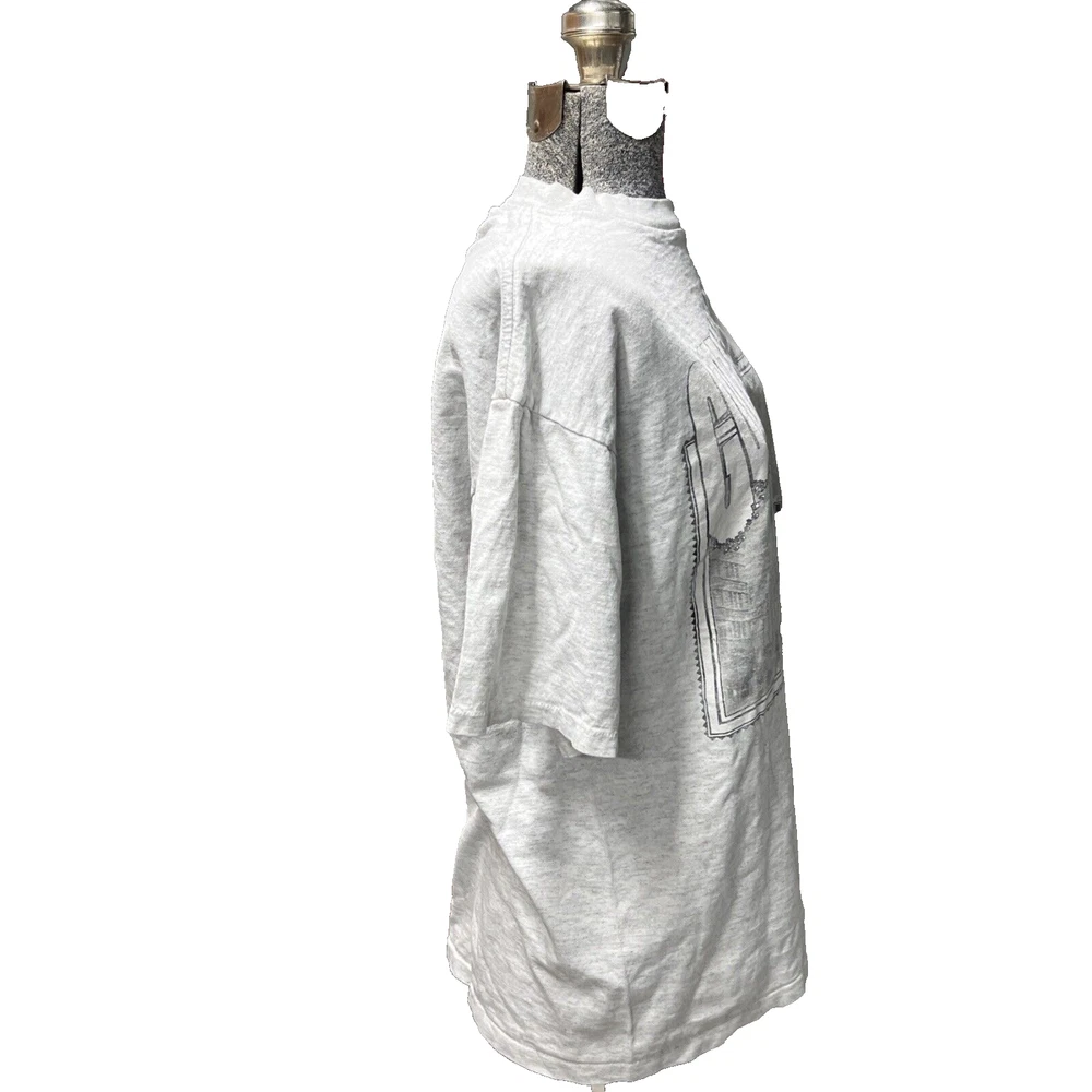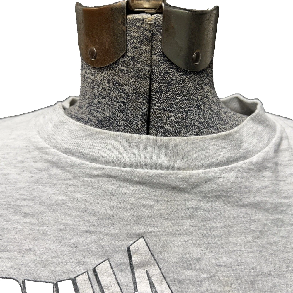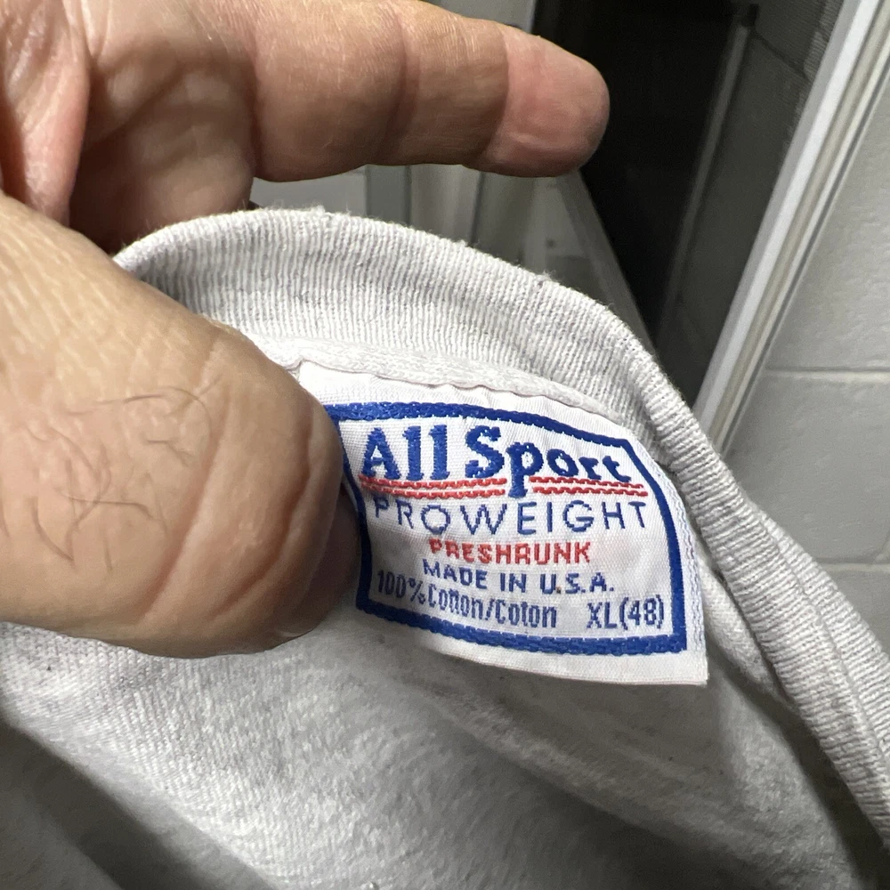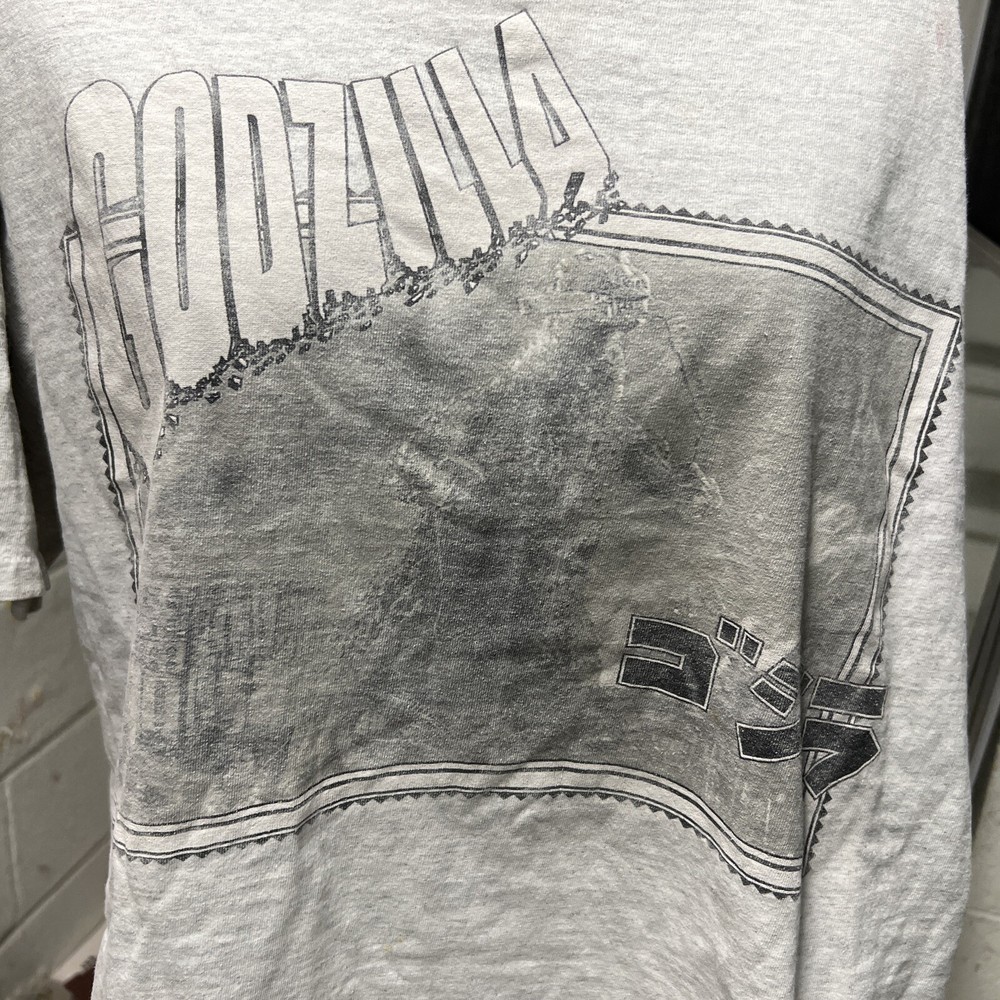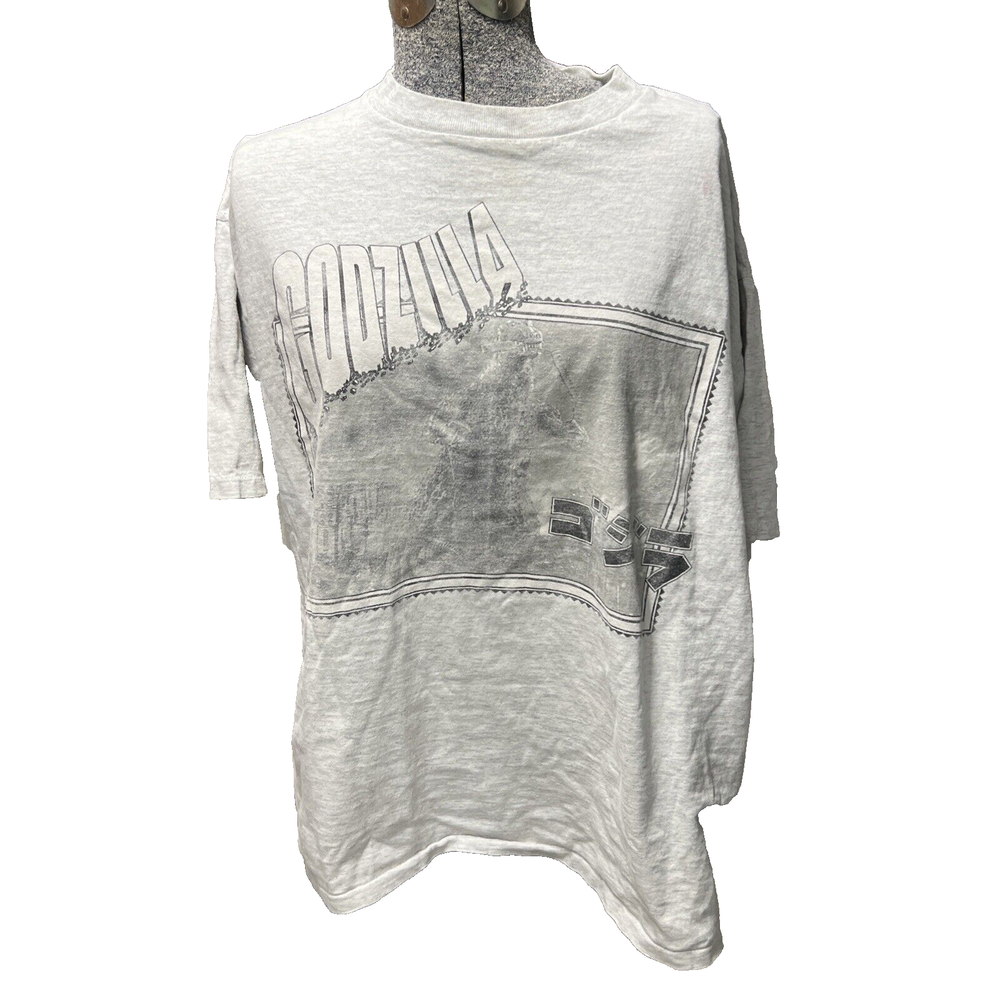 This is a vintage 1994 Toho Godzilla Kings Of The Monsters T-shirt made by All Sport. It features a graphic print of Godzilla from the movie. The shirt has a crew neck and short sleeves, and is made of cotton. It is a size XL and has a regular fit. The shirt is single stitched and was manufactured in the United States during the 1990s. The shirt is gray in color and has a horror and monster theme.