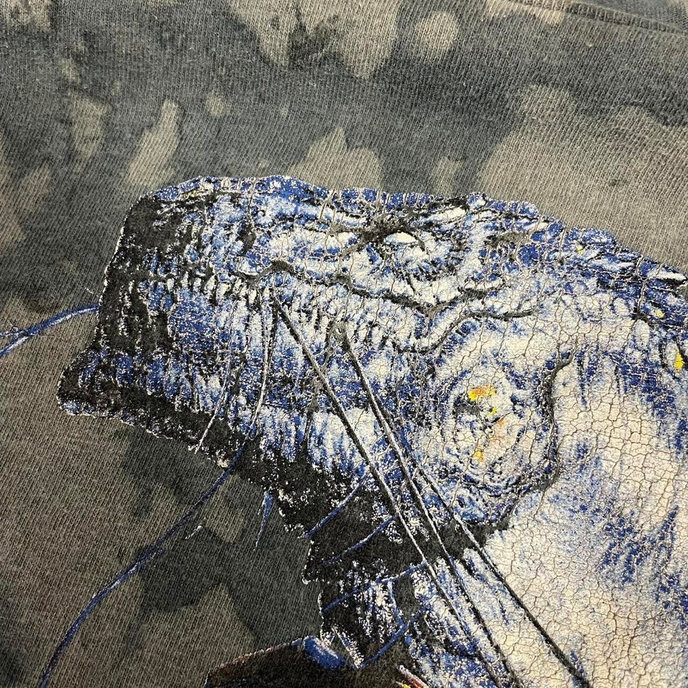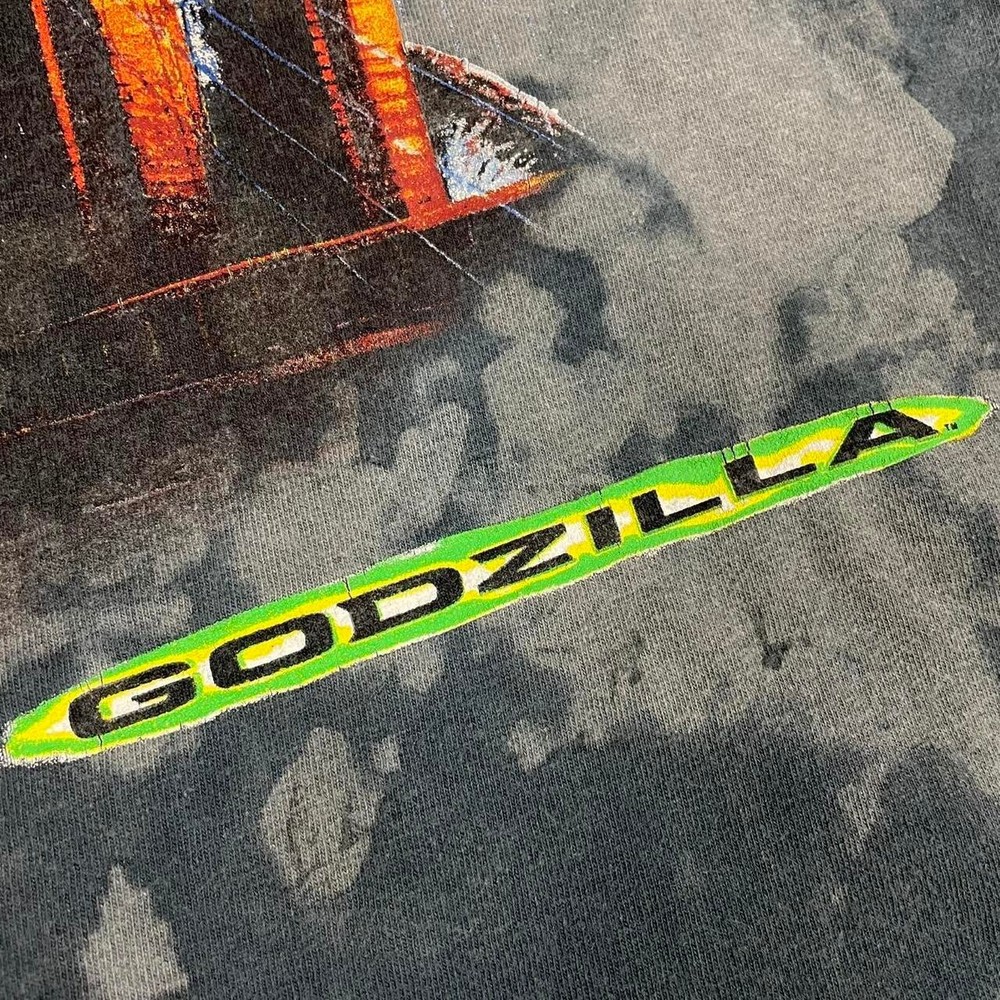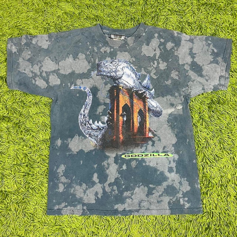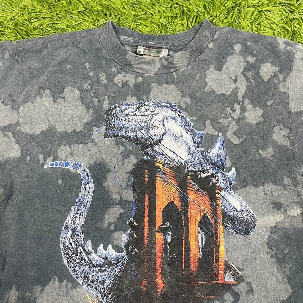 Size Medium ( 19.5" X 25" ) Capture the nostalgia of the classic 1998 Godzilla movie with this vintage promo t-shirt, featuring an eye-catching break through tie-dye design. Crafted from soft, breathable cotton, this medium-sized, regular fit tee boasts a comfortable round neck and short sleeves, perfect for casual outings or movie fandom gatherings.Adorned with a solid gray color that complements the bold graphics, this double-sided t-shirt is a testament to the enduring legacy of the Godzilla franchise. Made in the United States, it's a unique piece for collectors and fans alike, celebrating the iconic character with a timeless appeal.