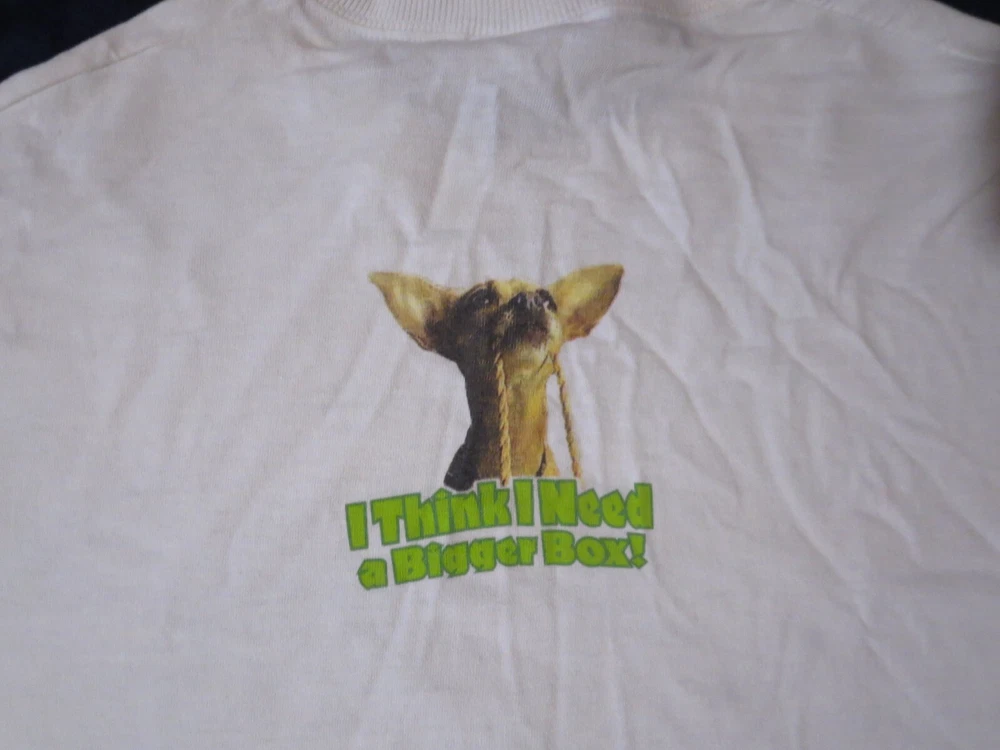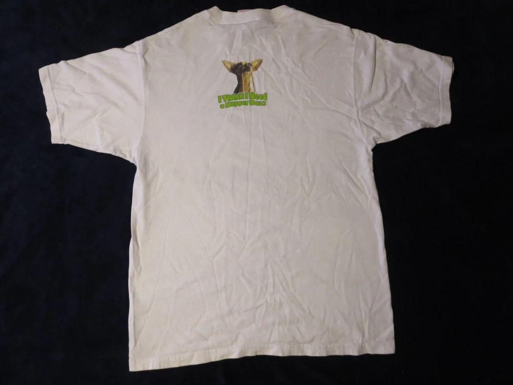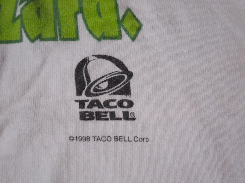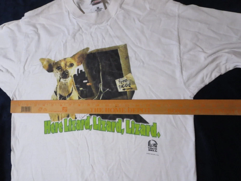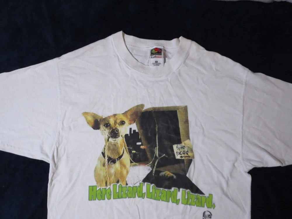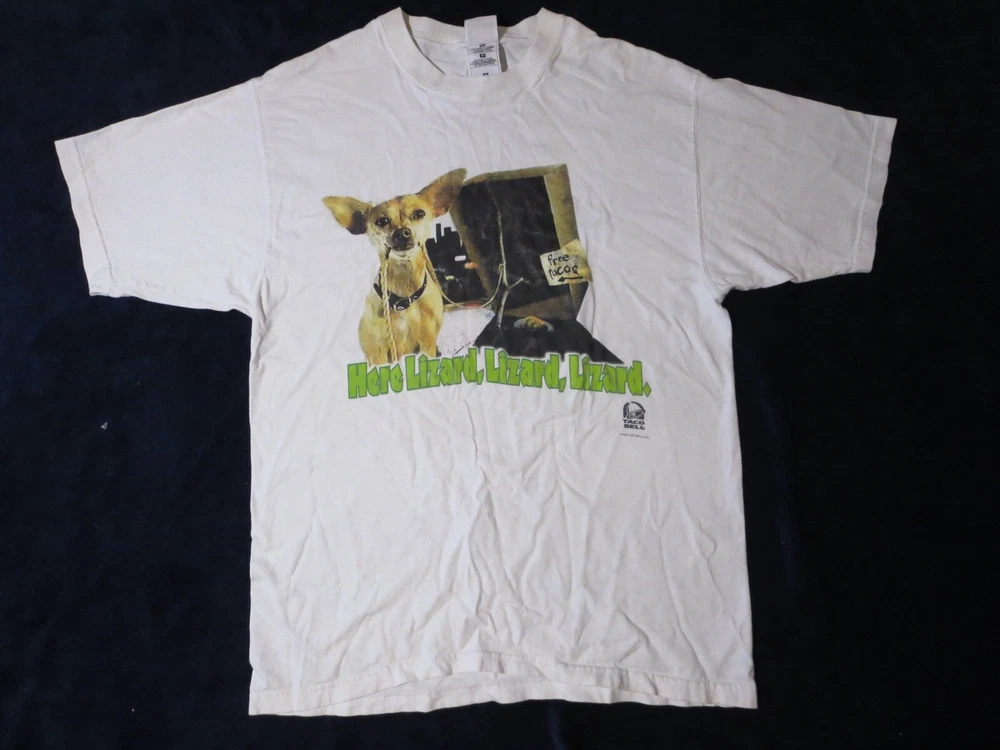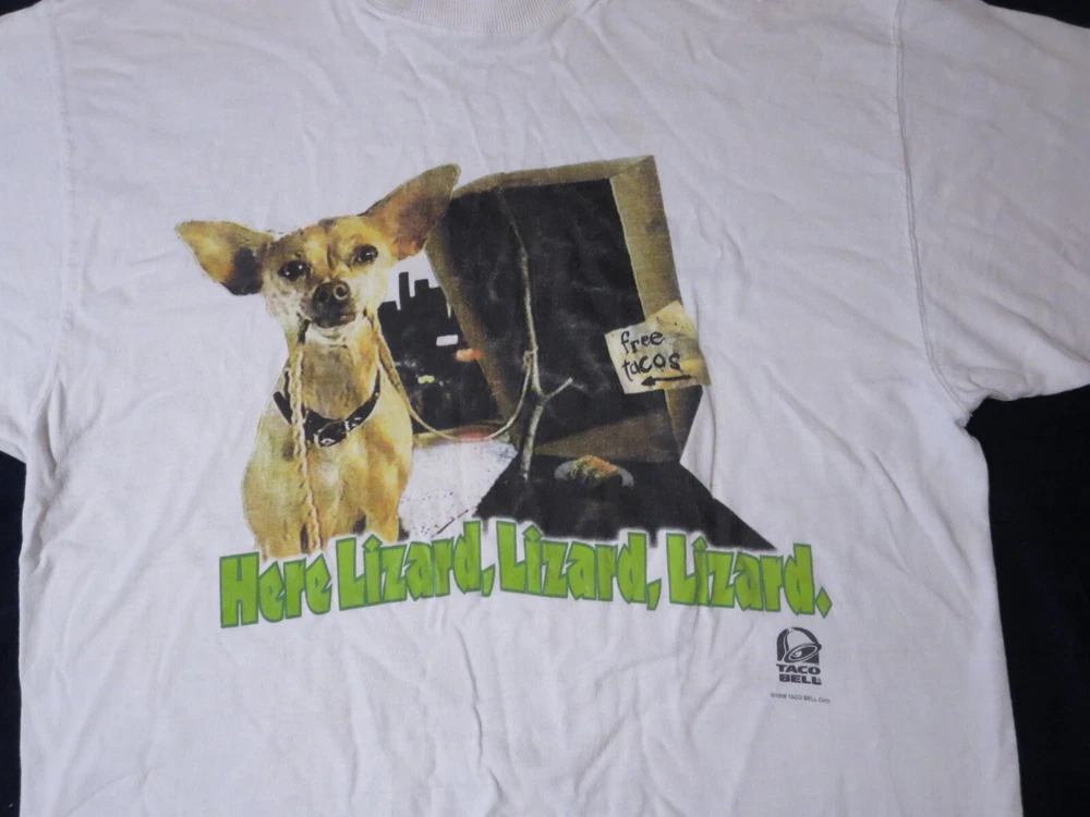 This vintage Taco Bell Chihuahua T-shirt is a must-have for any collector of unique graphic prints. The shirt features a white cotton fabric with a regular fit, perfect for any casual occasion. The shirt's graphic print showcases the iconic Taco Bell brand and the beloved character Lizard, making it a great addition to any wardrobe. This T-shirt is available in size medium and is perfect for men who love comfortable and stylish clothing. ***Small Hole Pictured***