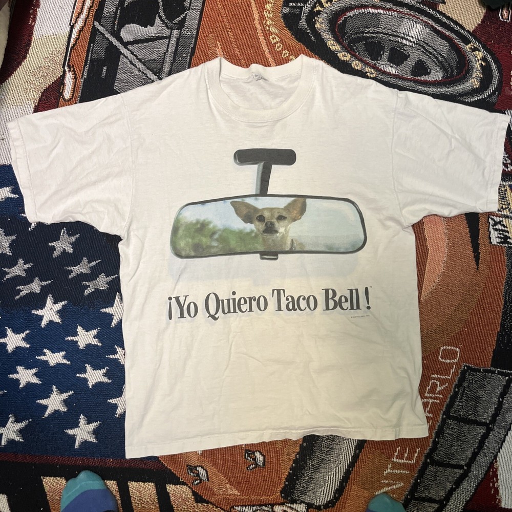 This vintage Taco Bell graphic shirt is a must-have for any fast food or movie memorabilia collector. Featuring a crew neck and short sleeves, this white cotton t-shirt is perfect for all seasons and has a regular fit. The shirt is designed with a double-sided graphic print of the beloved character Belle from the 80s and 90s movie Godzilla. The shirt is made in the United States and is easy to care for. It is a great addition to any retro-themed outfit and is perfect for fans of fast food and movie characters. Get this unique piece of clothing today and add it to your collection!