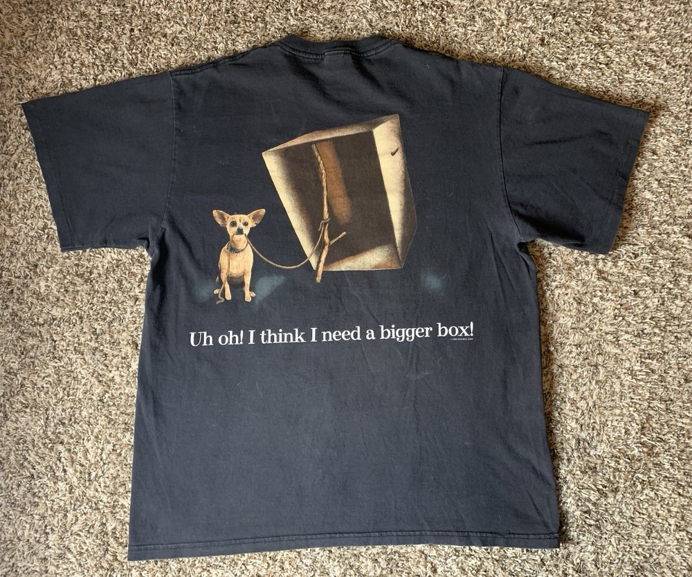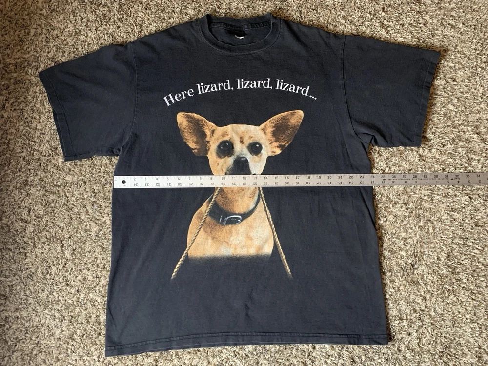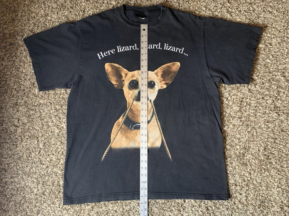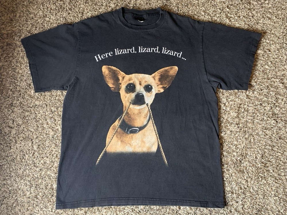 The Vintage 1998 Taco Bell Shirt in size XL is a unique piece featuring a Godzilla movie promo design, showcasing a larger box with a Chihuahua. This black t-shirt is a must-have for collectors and fans of quirky and nostalgic clothing items. Made with quality material, this regular fit shirt is perfect for men looking to make a statement with their wardrobe choices. The shirt is a great addition to any vintage collection or for those who appreciate pop culture references from the late 90s.