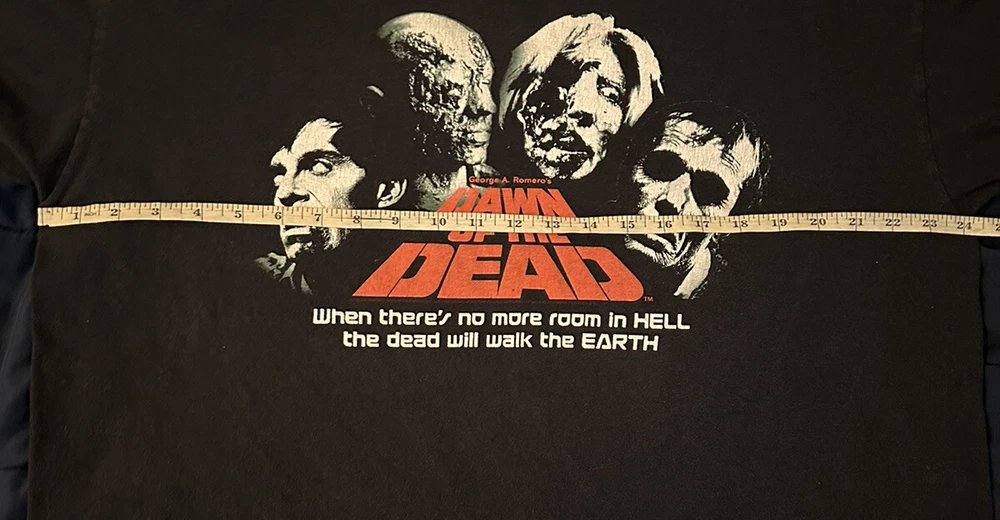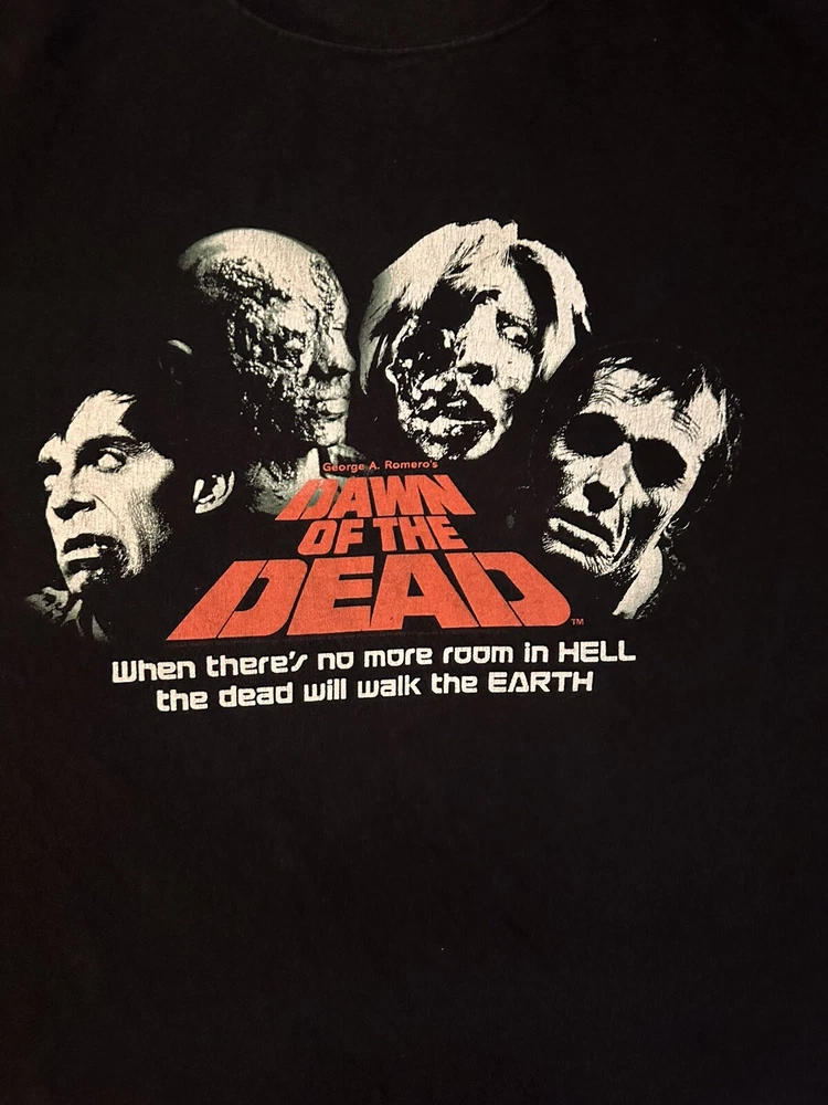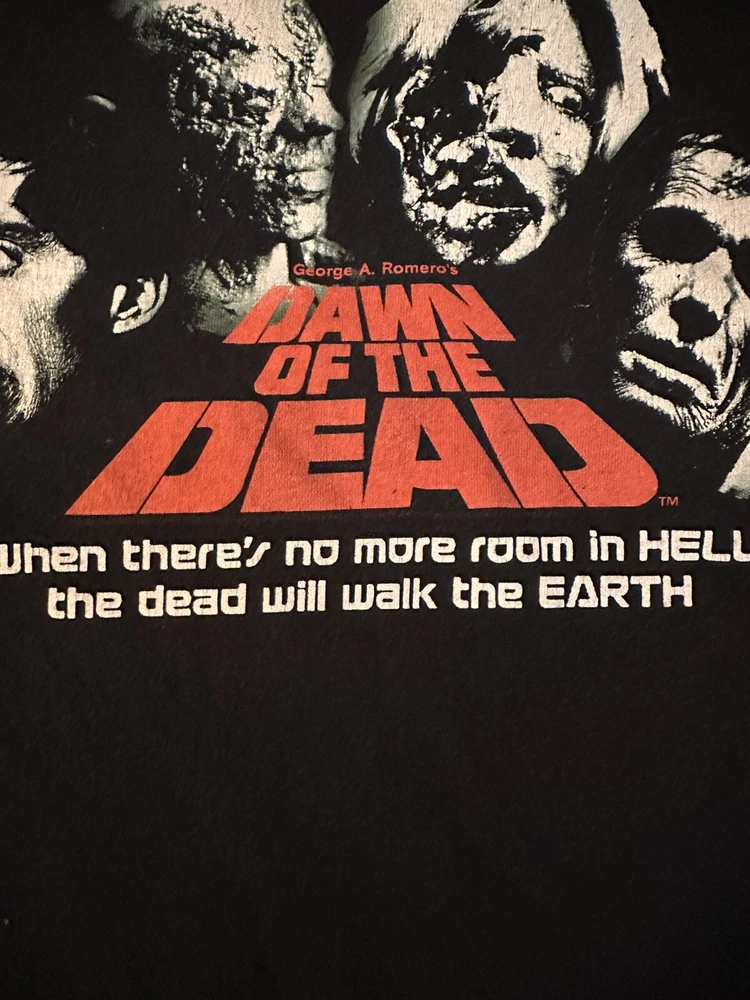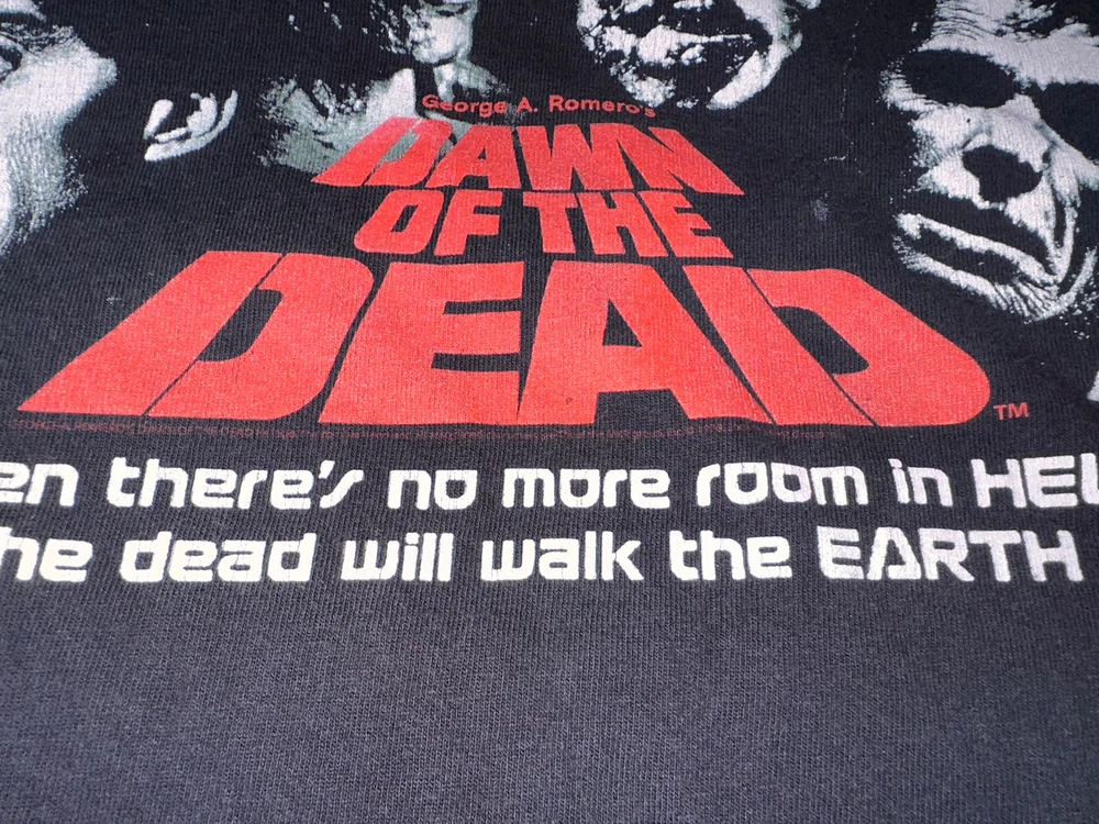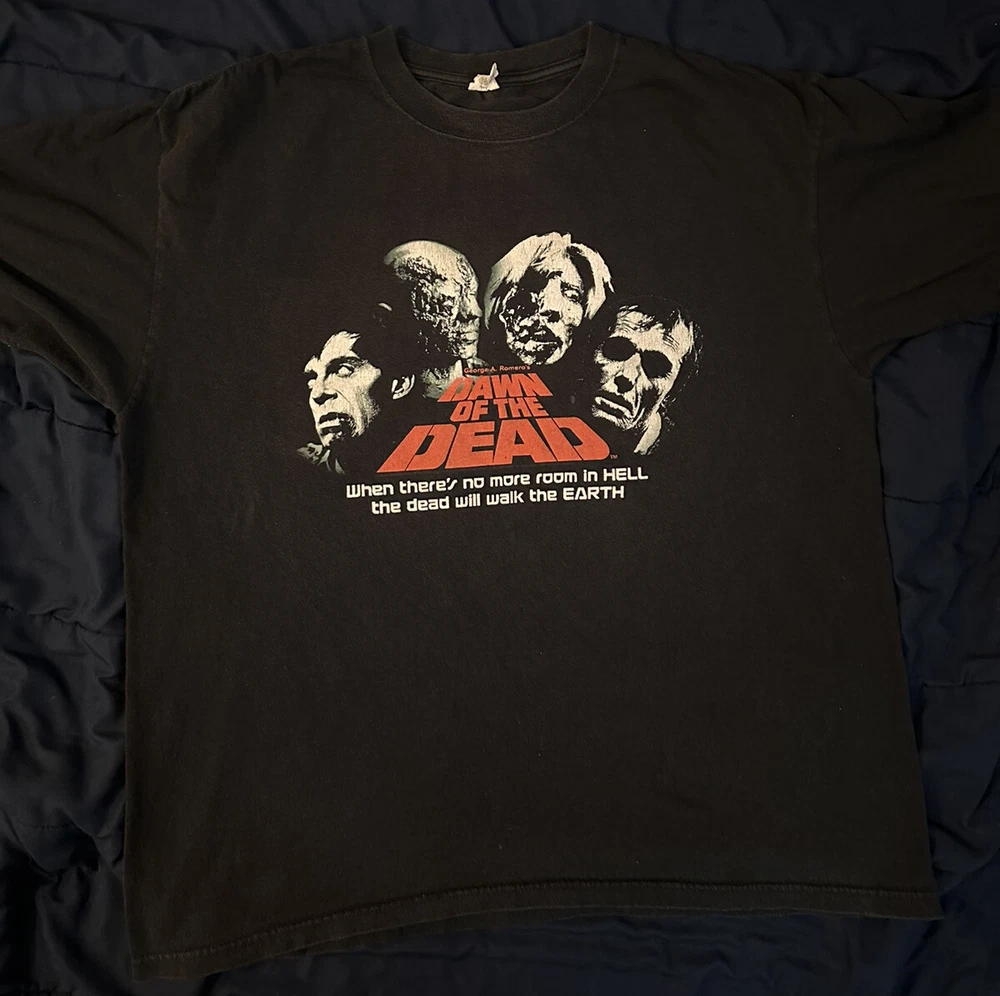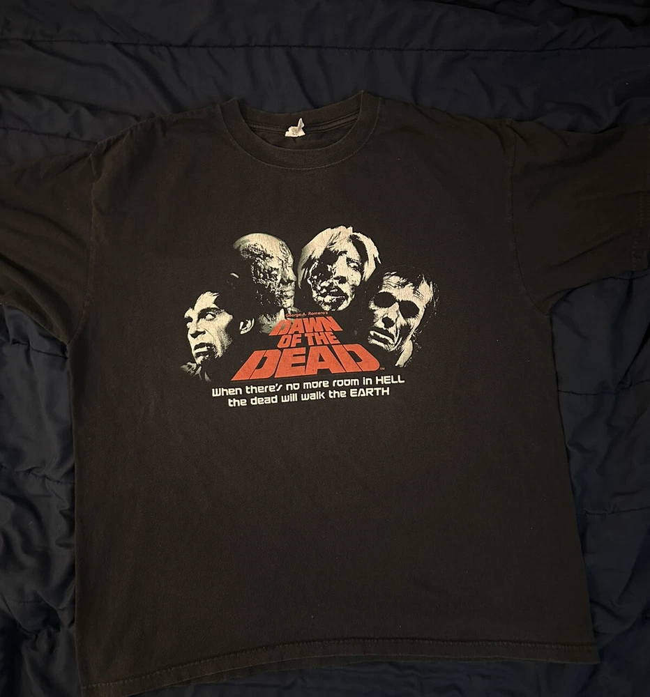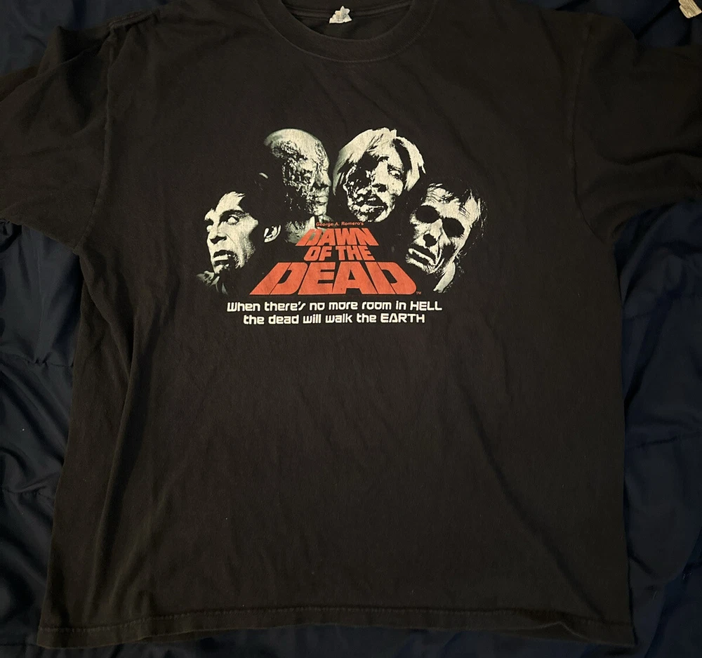 Experience the nostalgia of the early 2000s with this vintage zombie movie t-shirt featuring the iconic "Dawn of the Dead" film promo art. Made from comfortable cotton fabric, this black anvil t-shirt is perfect for fans of horror movies and vintage fashion. The graphic print showcases the classic artwork from the film, making it a must-have for collectors and enthusiasts alike. This crew neck t-shirt comes in size XL and features short sleeves, making it ideal for summer wear. The shirt is easy to care for and is machine washable. Whether you're a fan of horror movies, vintage fashion, or just looking for a unique addition to your wardrobe, this t-shirt is sure to impress.