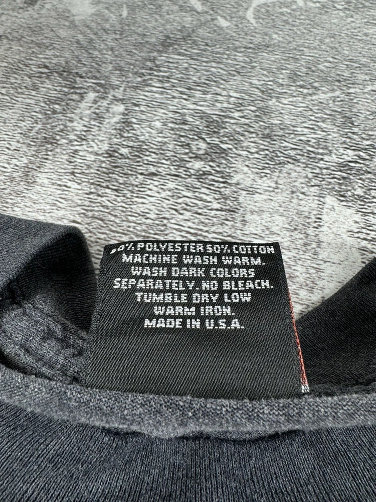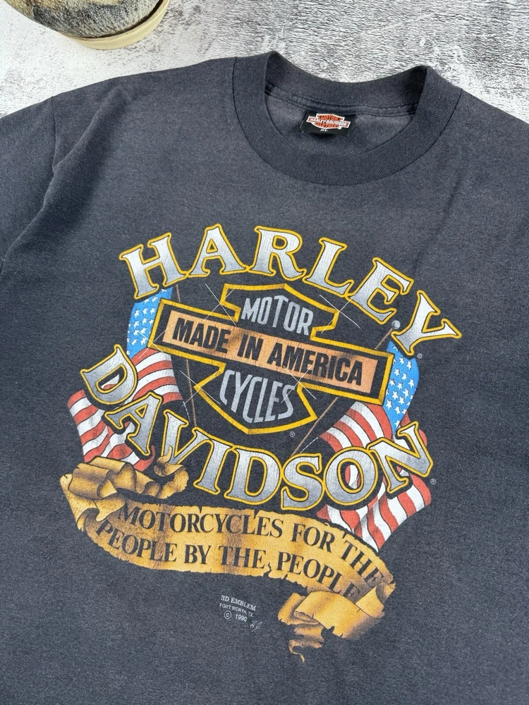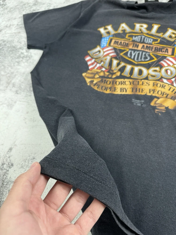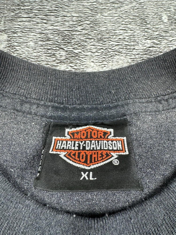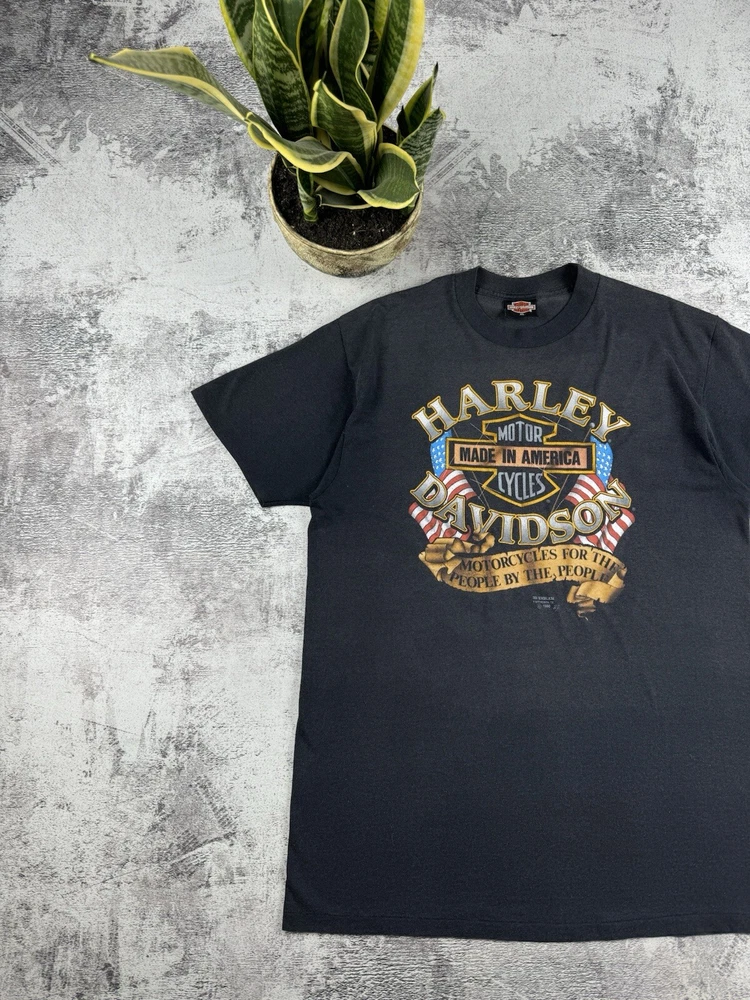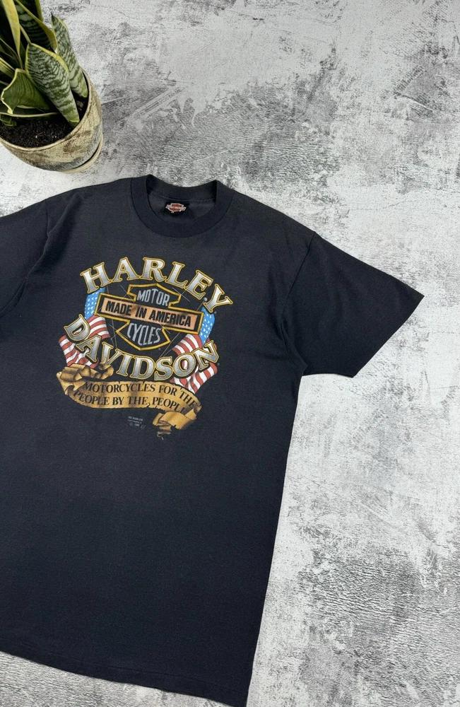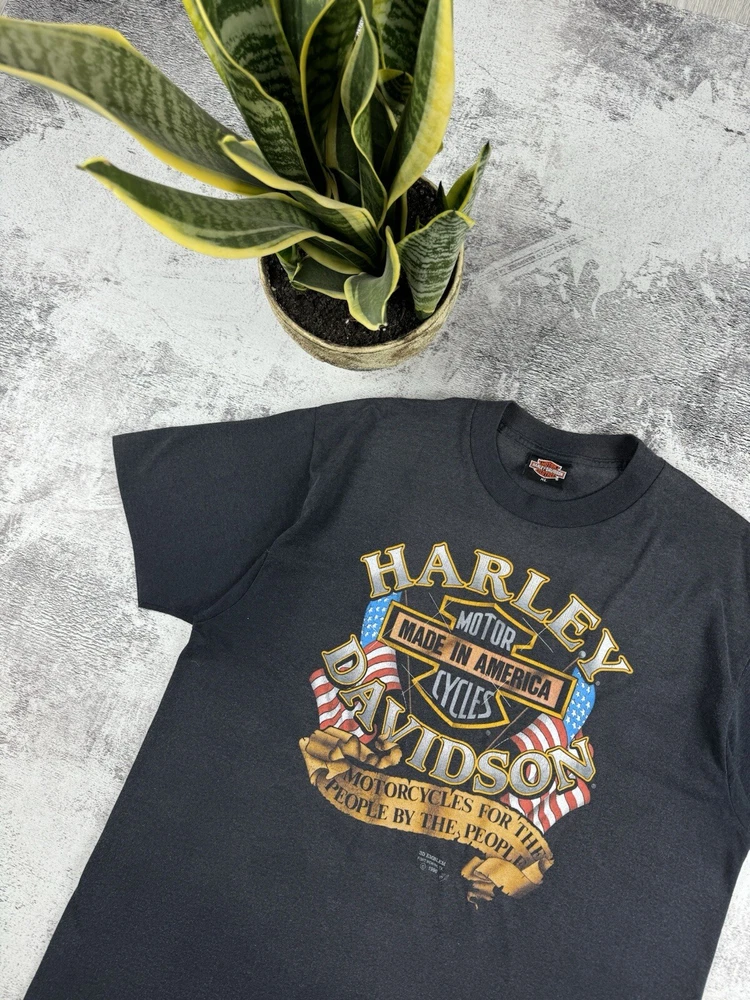 This vintage Harley-Davidson t-shirt features a unique graphic print of an eagle flying over a motorcycle with the iconic brand logo. The shirt is made of comfortable jersey fabric and has short sleeves, a crew neckline, and a regular fit. It is machine washable and suitable for all seasons. The shirt is perfect for fans of the biker, Italian, punk, geek, bird, metal, retro, designer, rainbow, horse, hip hop, military, cars, movie, army, USA, rock, hippie, owl, grunge, California, city, classic, Florida, love, music, London, Indian, 80s, 90s, Doc McStuffins, Kim Possible, Sailor Moon, Captain America, Epic, Calvin & Hobbes, Pirates of the Caribbean, A Bug's Life, Aerosmith, Finding Nemo, Futurama, Phineas and Ferb, Charmed, Cardcaptor Sakura, Beyblade, Battlestar Galactica, Despicable Me, Nancy Drew, Free!, Dragon Tales, God of War, Godzilla,