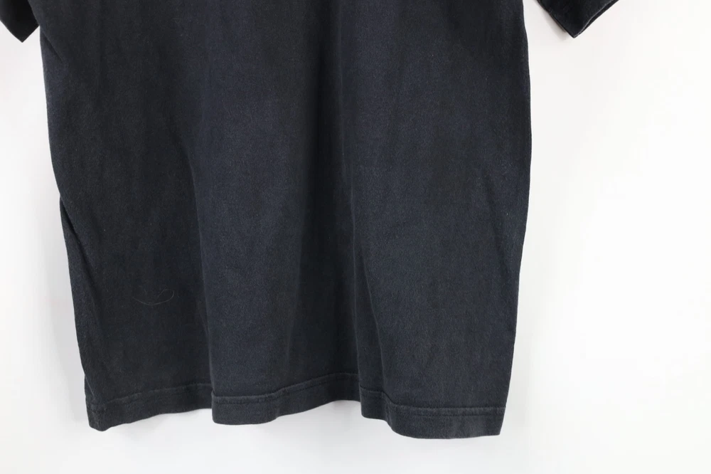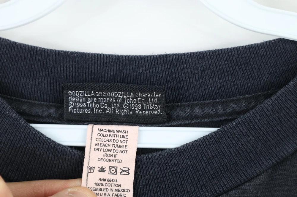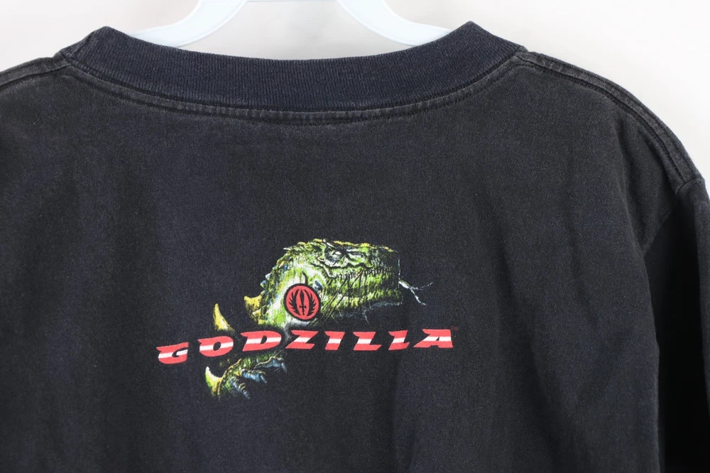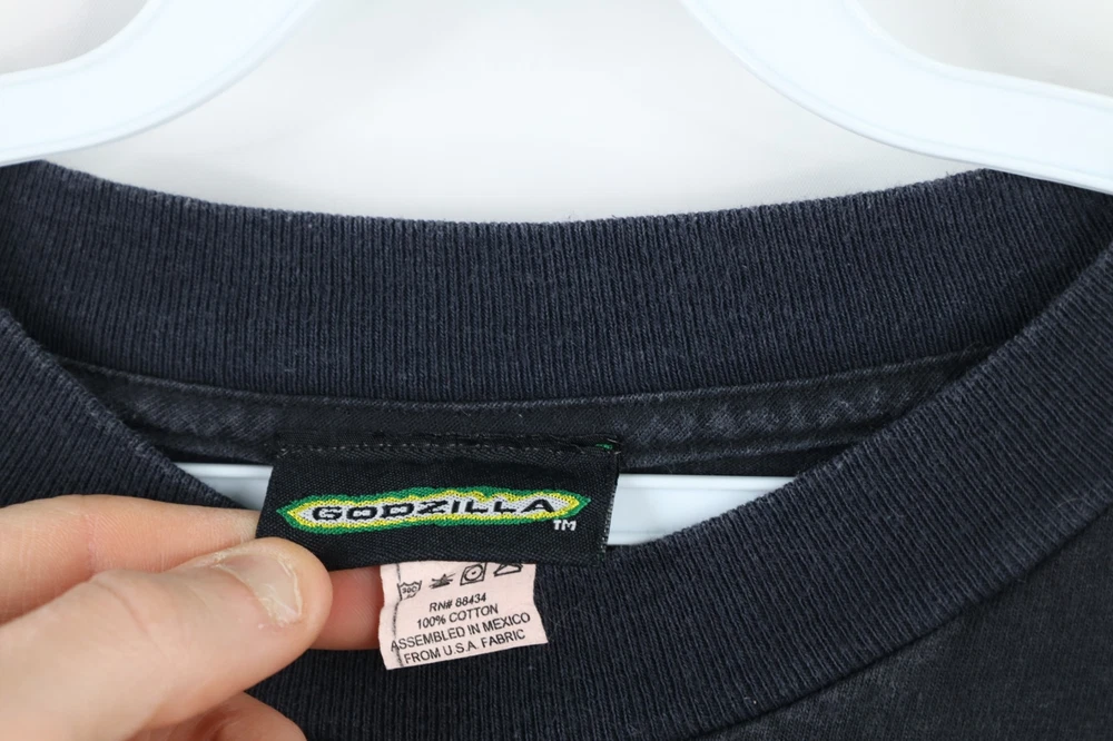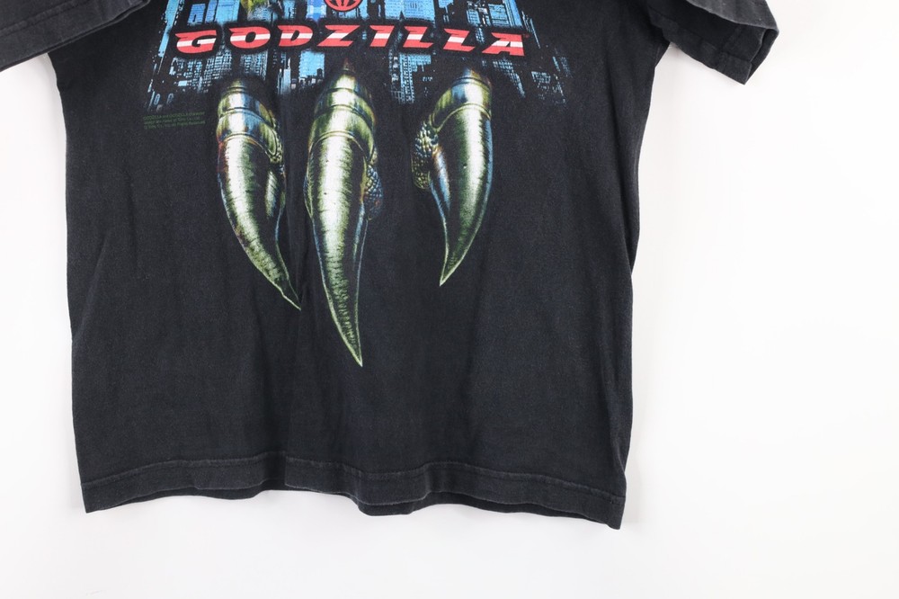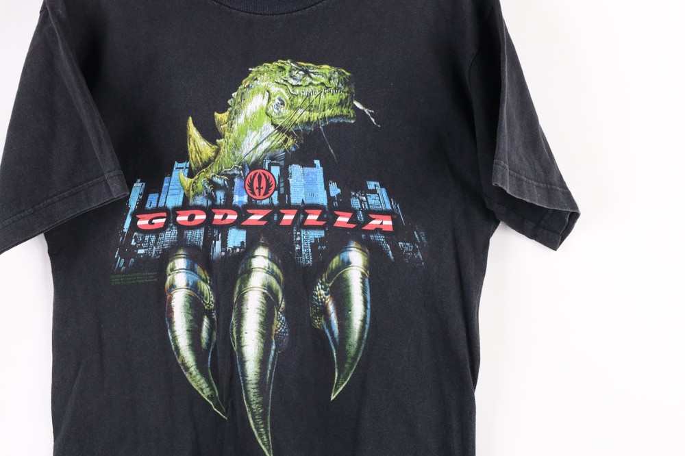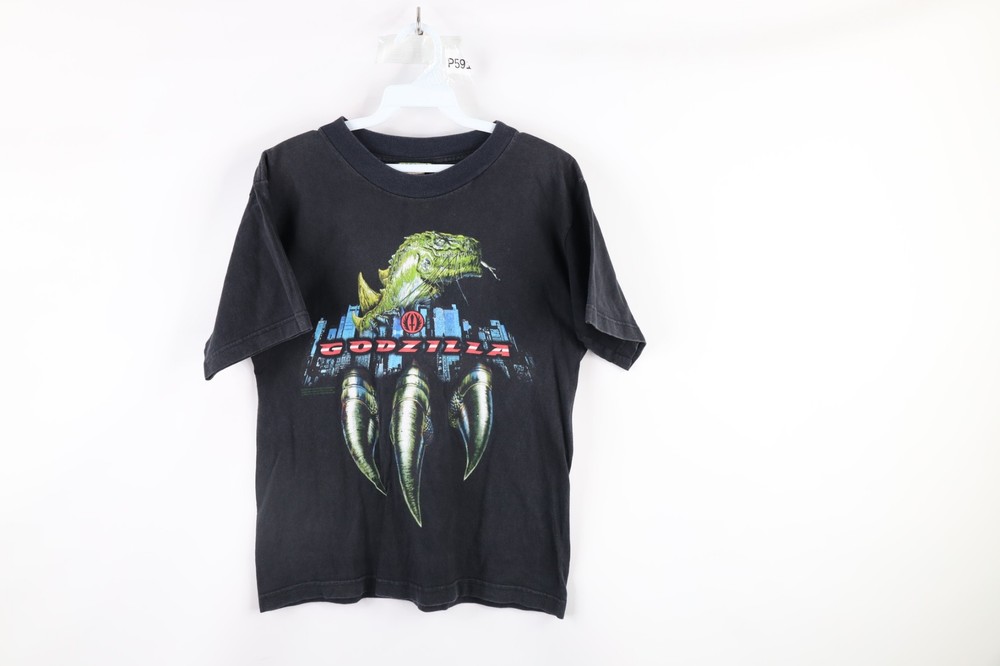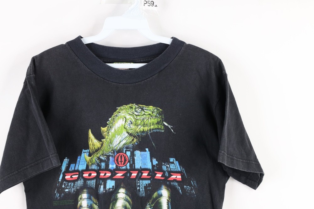 Vintage 90s Godzilla Mens Small Faded Spell Out Movie Promo T-Shirt Black Cotton Mens T-Shirt Color faded, graphics faded. Blemish middle back Mens size Small (no size shown, see measurements) Measurements are: 18 inches underarm to underarm 24.5 inches top to bottom Black Cotton US Shipping is FREE and part of the Global Shipping Program Check out my other items in my store! P591