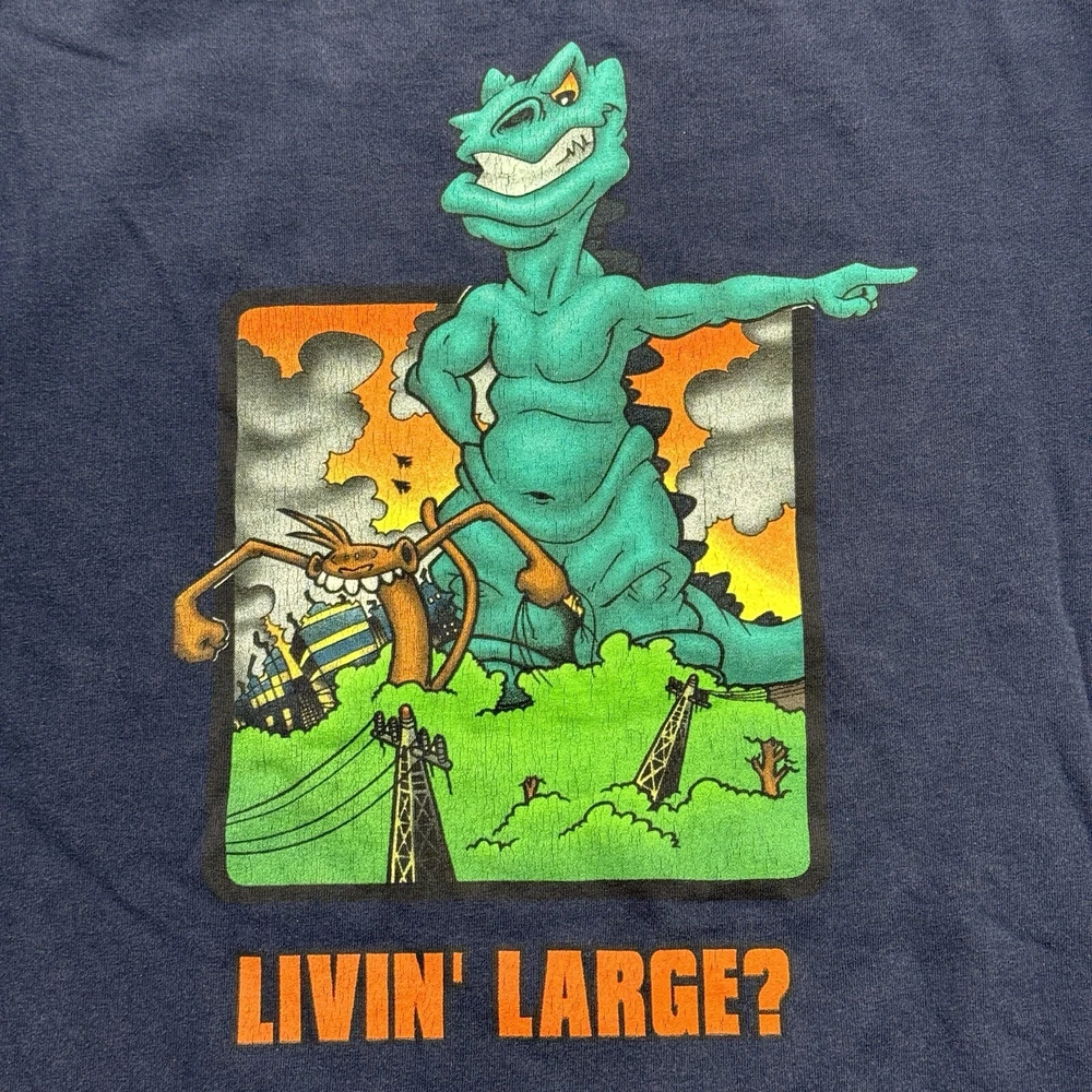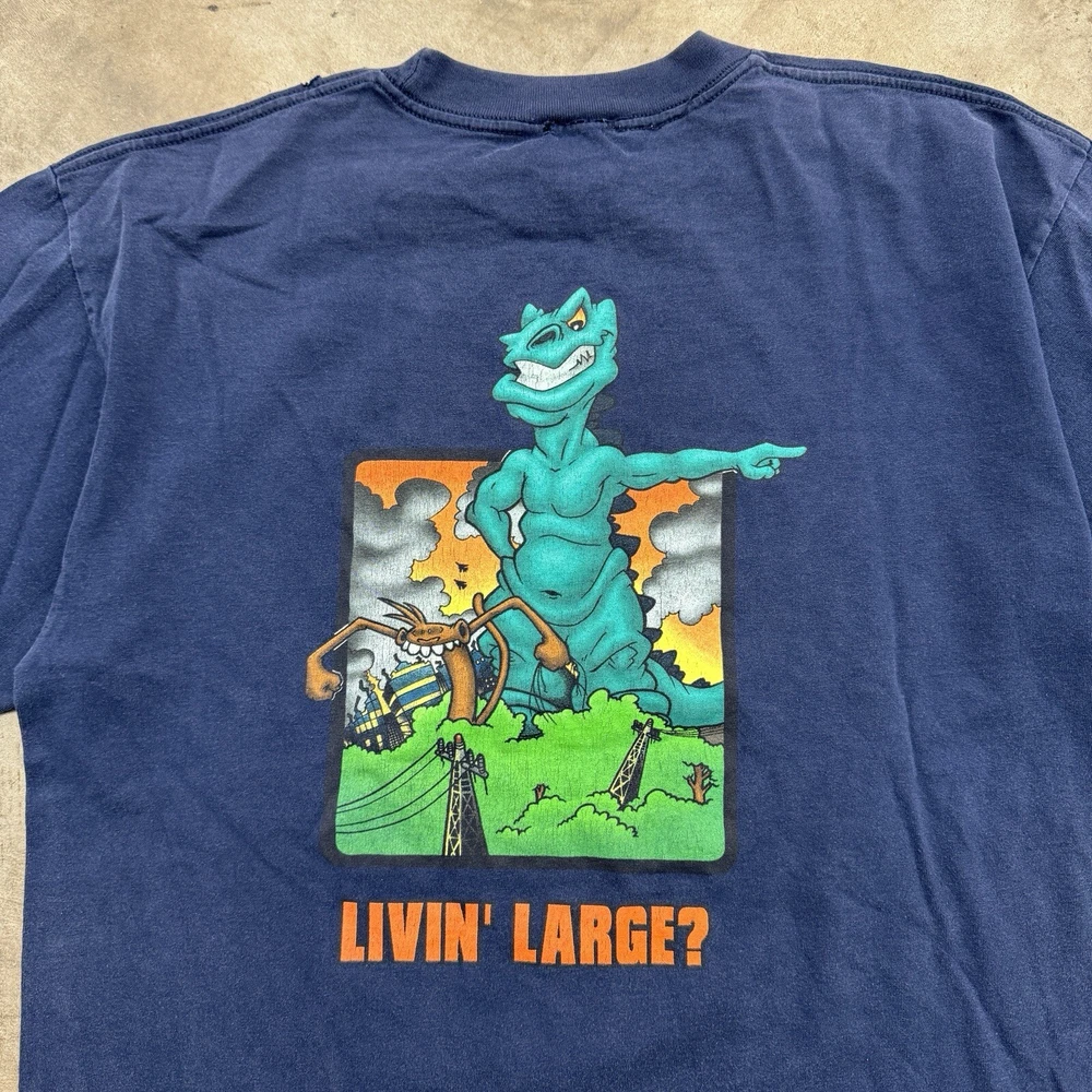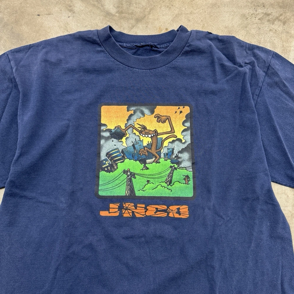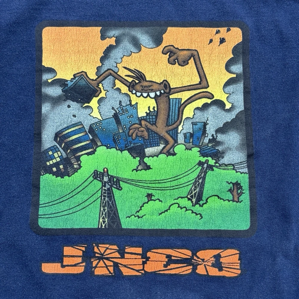 This vintage JNCO Jeans t-shirt features a colorful graphic print of the beloved 90s character Godzilla, living large and ready to take on any season. Made of comfortable and breathable cotton knit fabric, this limited edition tee is perfect for any fan of the artful and animalistic theme. The shirt is easy to care for and has been pre-shrunk to ensure a perfect fit for size XL. The crew neck and short sleeve design make it suitable for both casual and active wear, and the logo accents add a touch of retro style. This shirt is a rare find for any collector or enthusiast of 90s fashion and Godzilla memorabilia. Don't miss out on the chance to add this unique piece to your collection. Size XL, cut tag. Measurements pictured