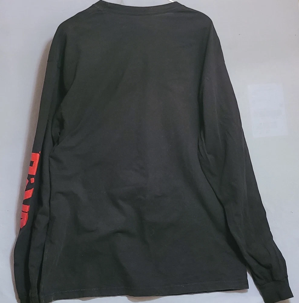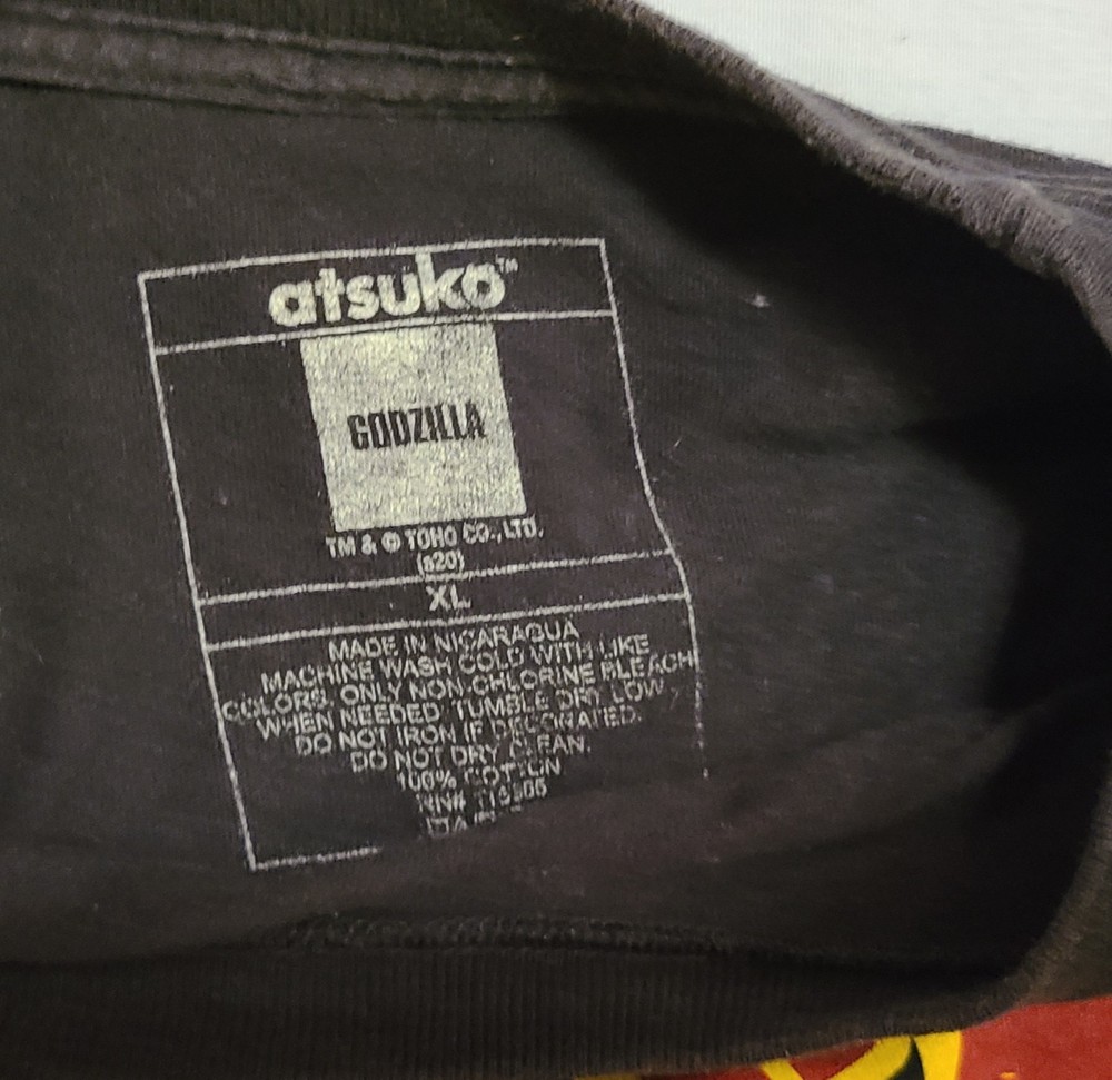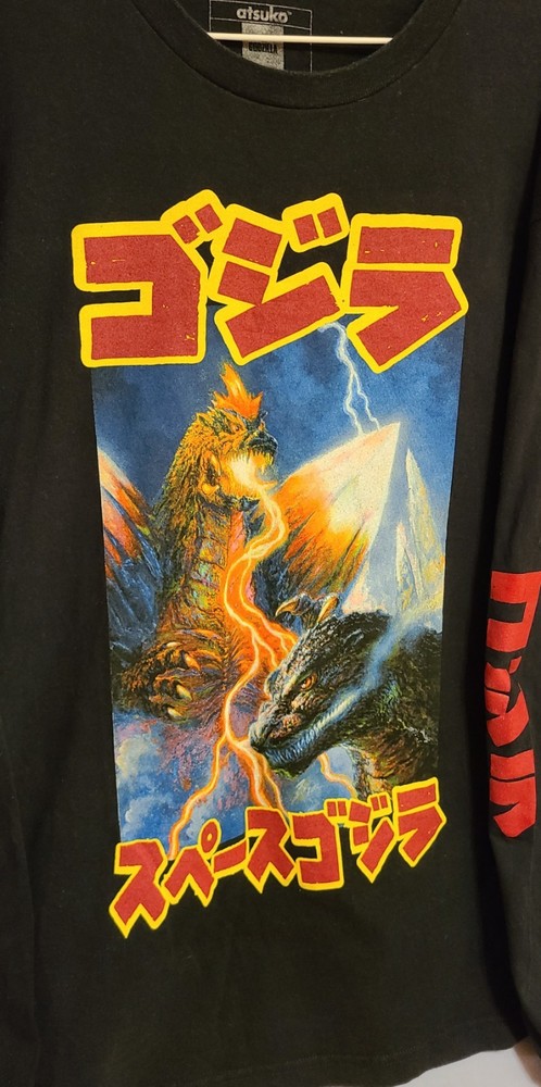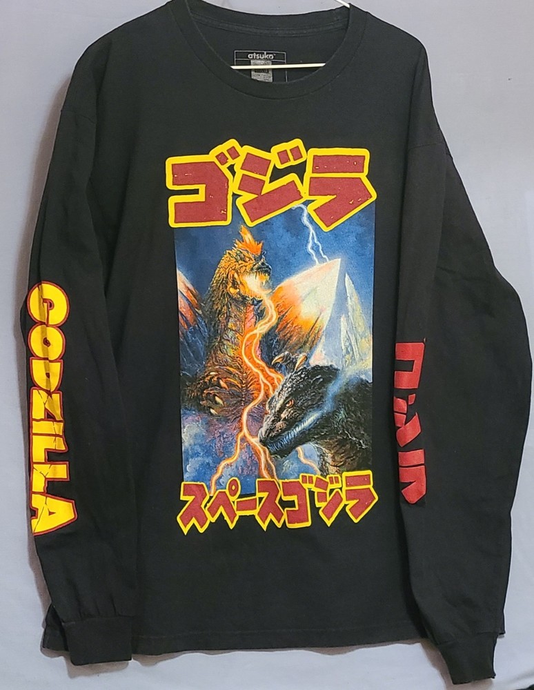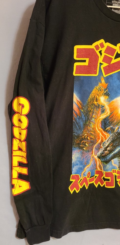 The product is a rare vintage 90s T-shirt featuring a Godzilla graphic by Atsuko brand. The shirt is black in color and has a long sleeve, making it a unique and collectible item for fans of the Godzilla franchise. The extra large size adds a sense of rarity to the piece, as it would be a sought-after item for collectors looking to add a unique and nostalgic piece to their collection.