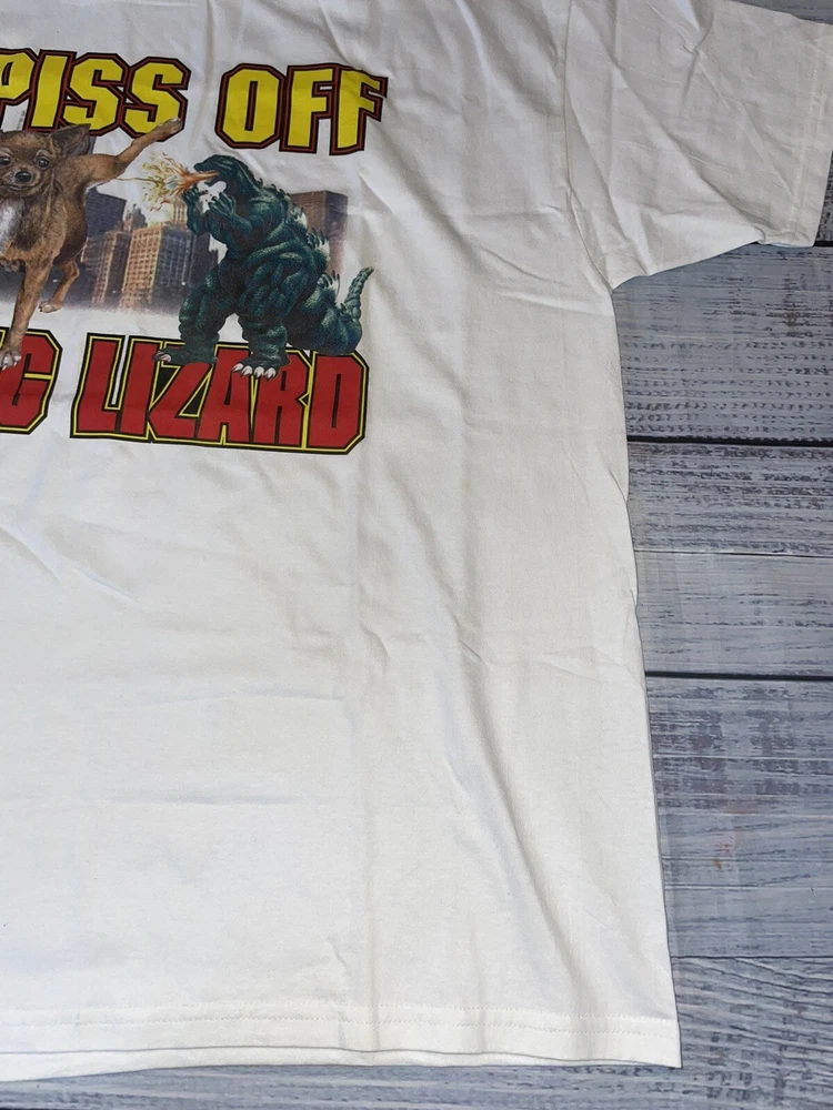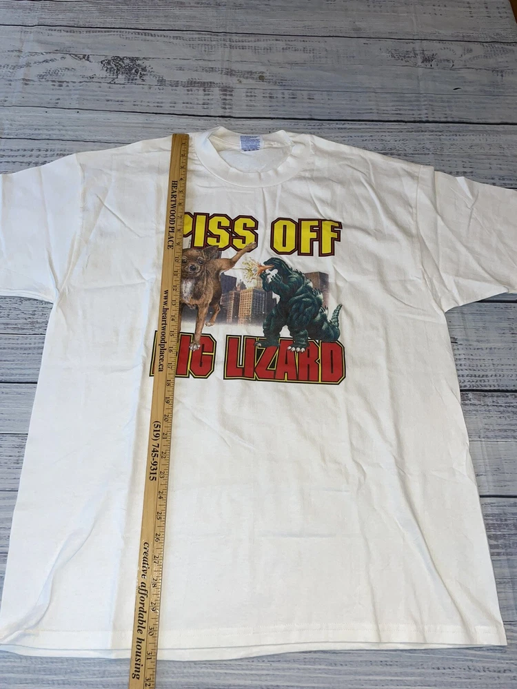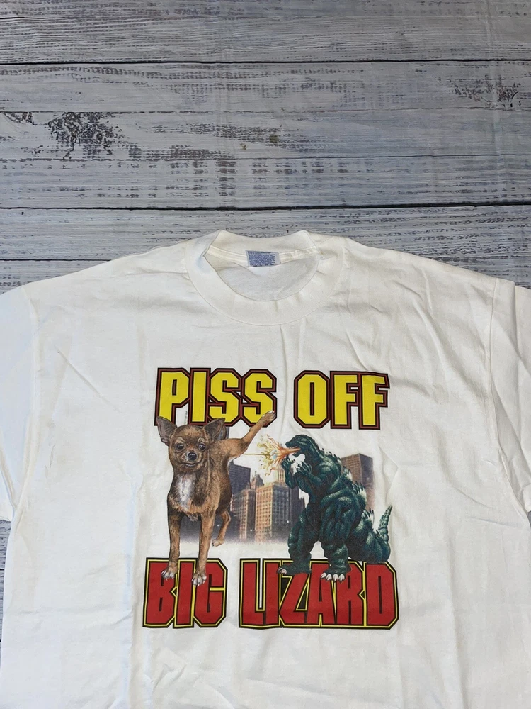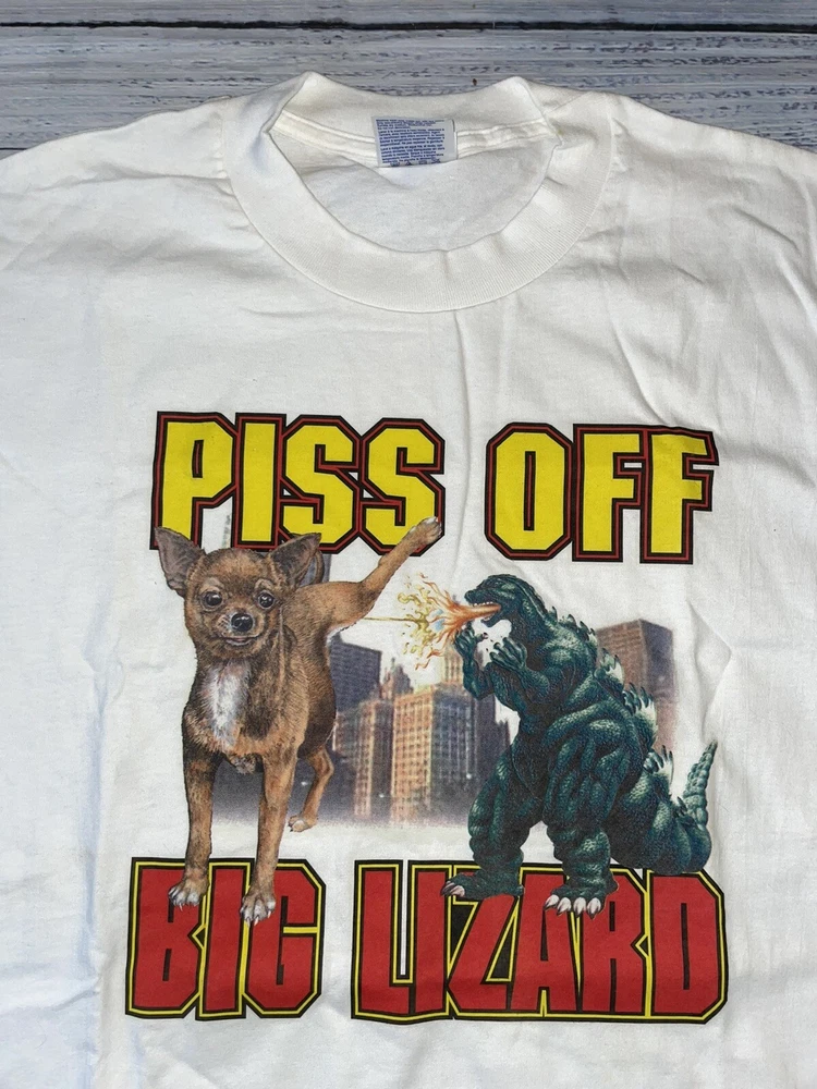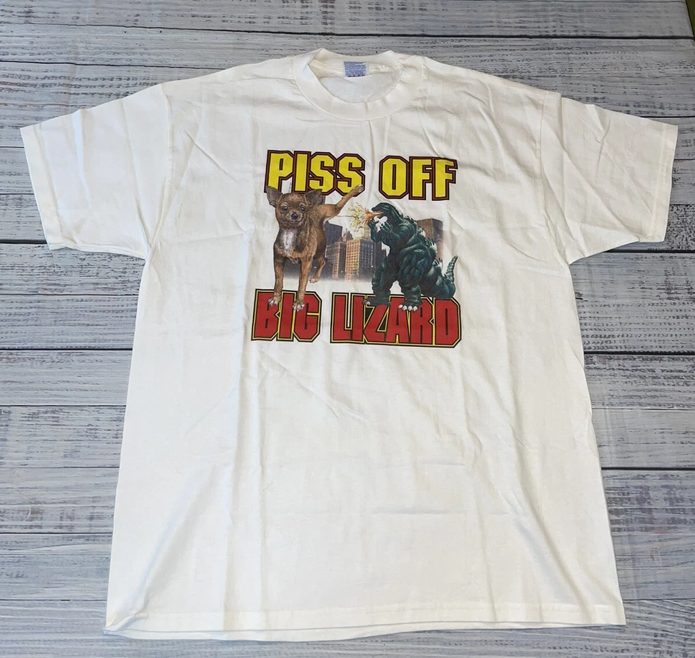 This Vintage 98 Taco Bell Chihuahua Vs Godzilla Movie Promo T-Shirt is a must-have for any fan of the 90s era. Featuring a solid pattern with a crew neck and short sleeves, this shirt is made of machine washable cotton material for easy care. The shirt comes in a rare XL size and is perfect for both winter and summer seasons. The shirt also boasts a vintage logo accent and is a part of the Godzilla character family. It was manufactured in Mexico in the 1990s and is ideal for any regular fit size type. Personalization is not available for this shirt. Add this unique and rare piece to your collection today!